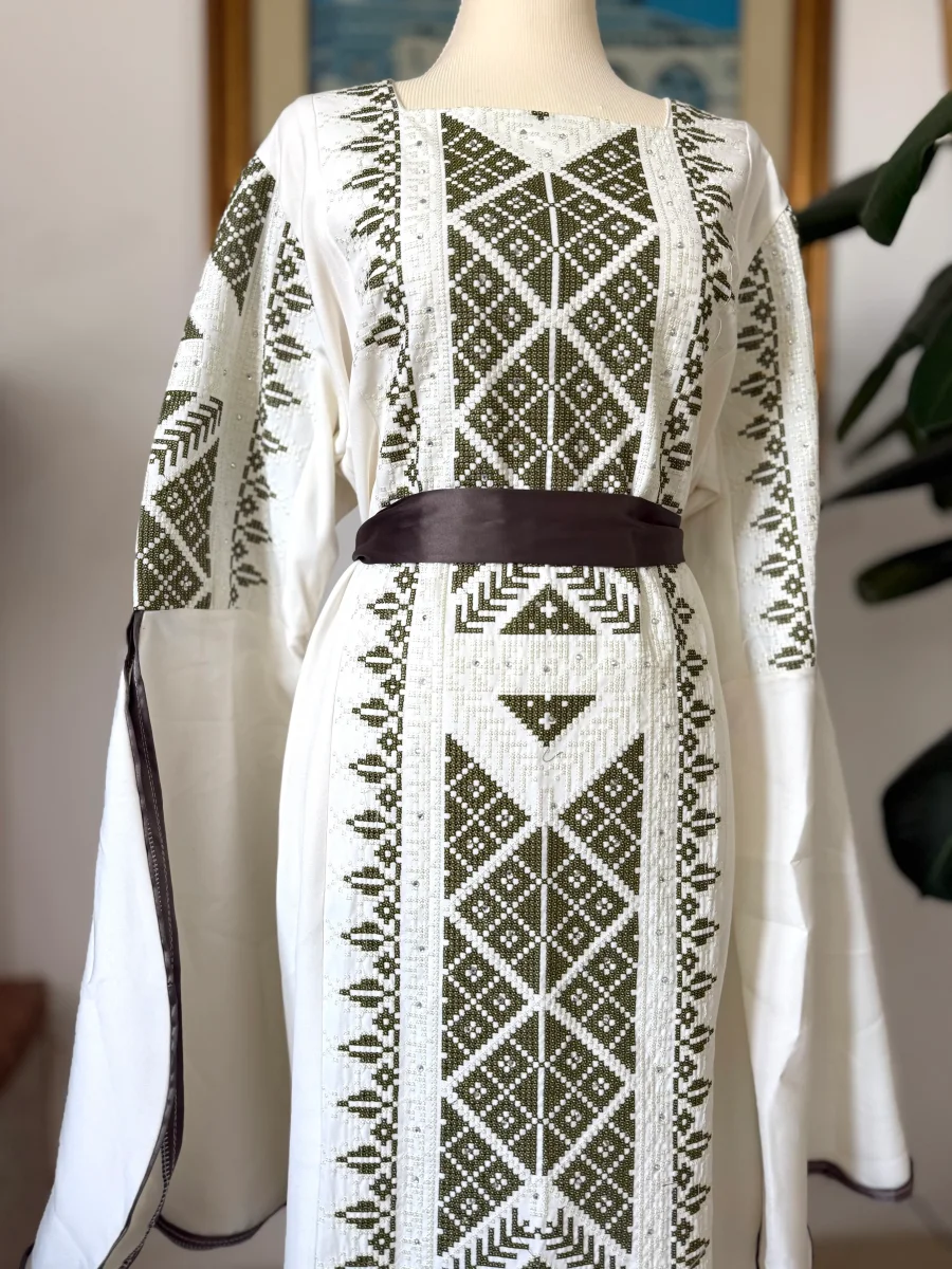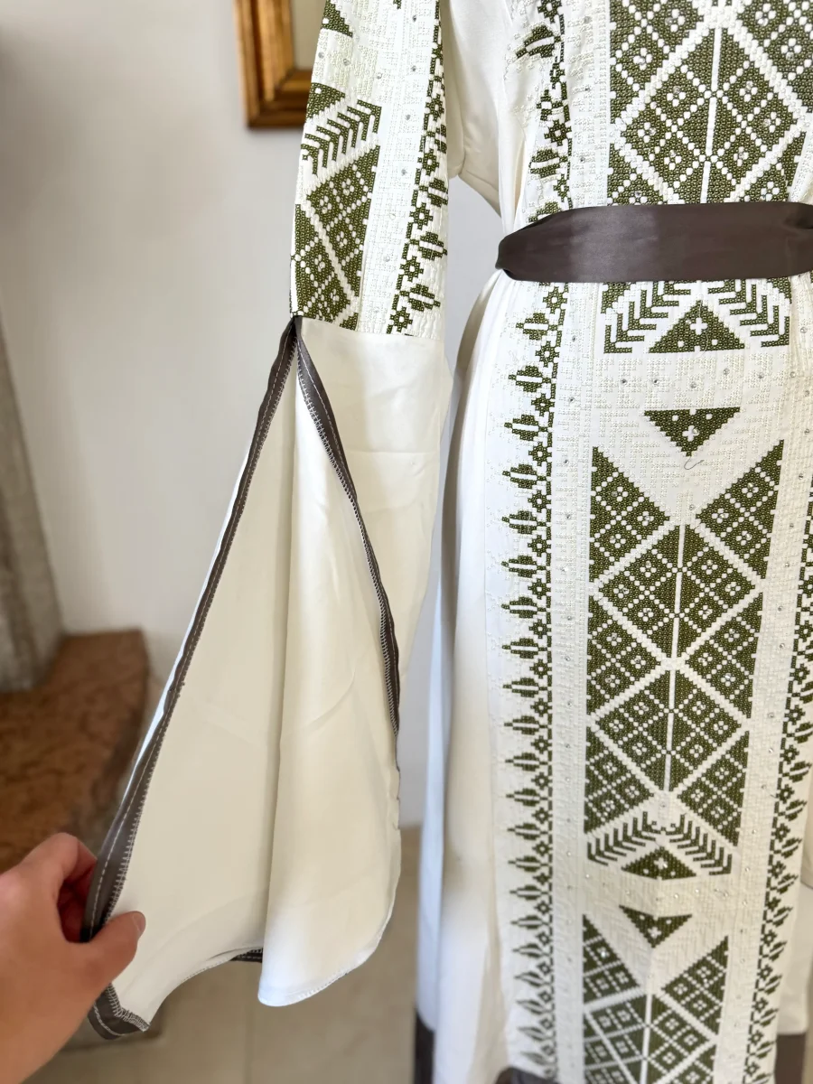 Elegante e moderna, questa abaya bianca รจ impreziosita da tatreez verde e valorizzata da una cintura marrone che definisce la vita. Le maniche ampie e aperte donano movimento e stile, rendendola perfetta per ogni occasione, con un tocco unico di artigianato palestinese.