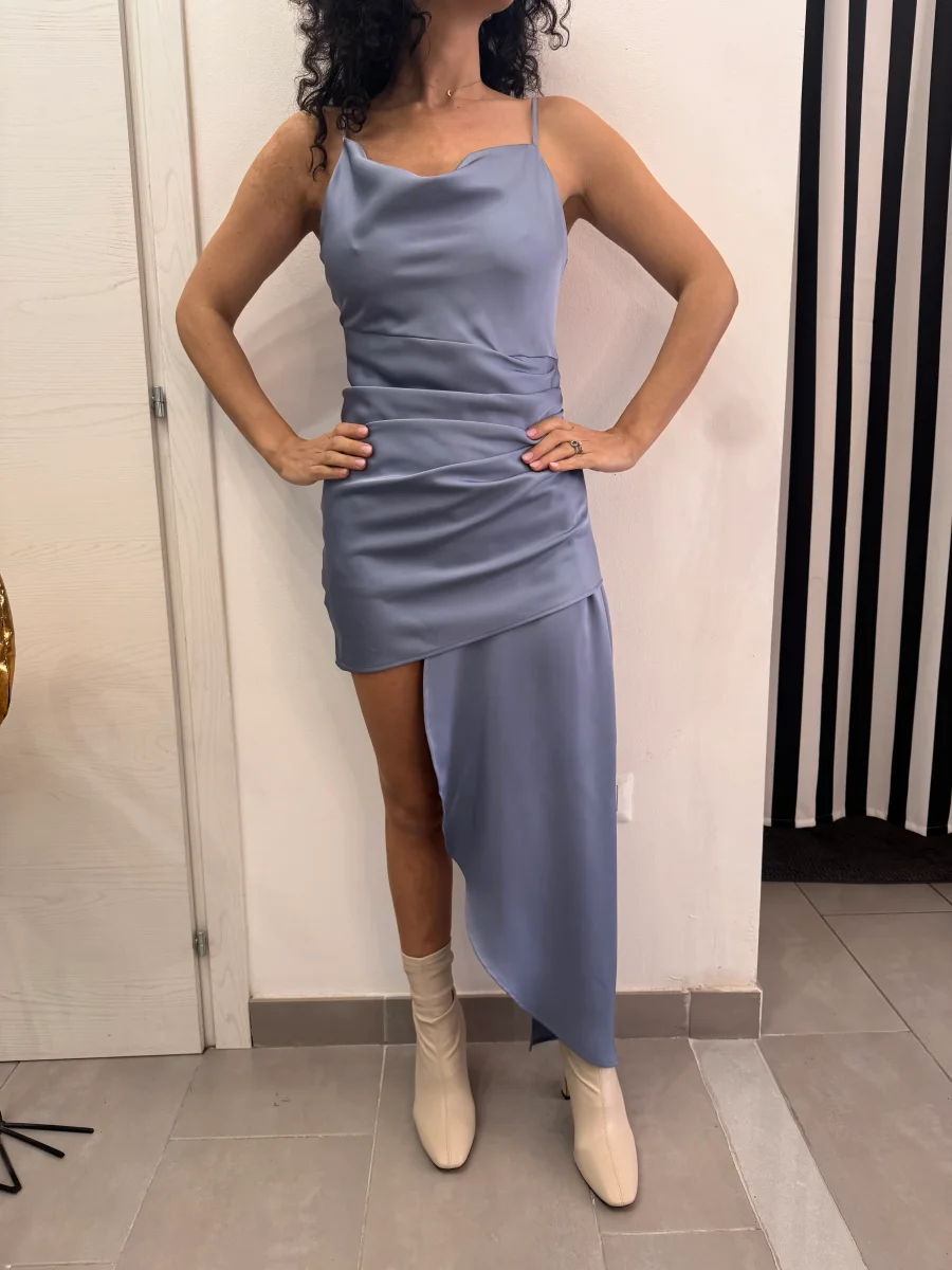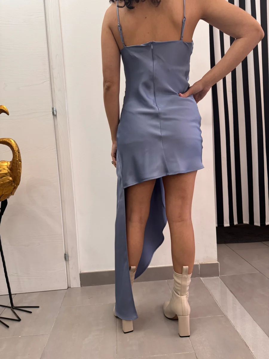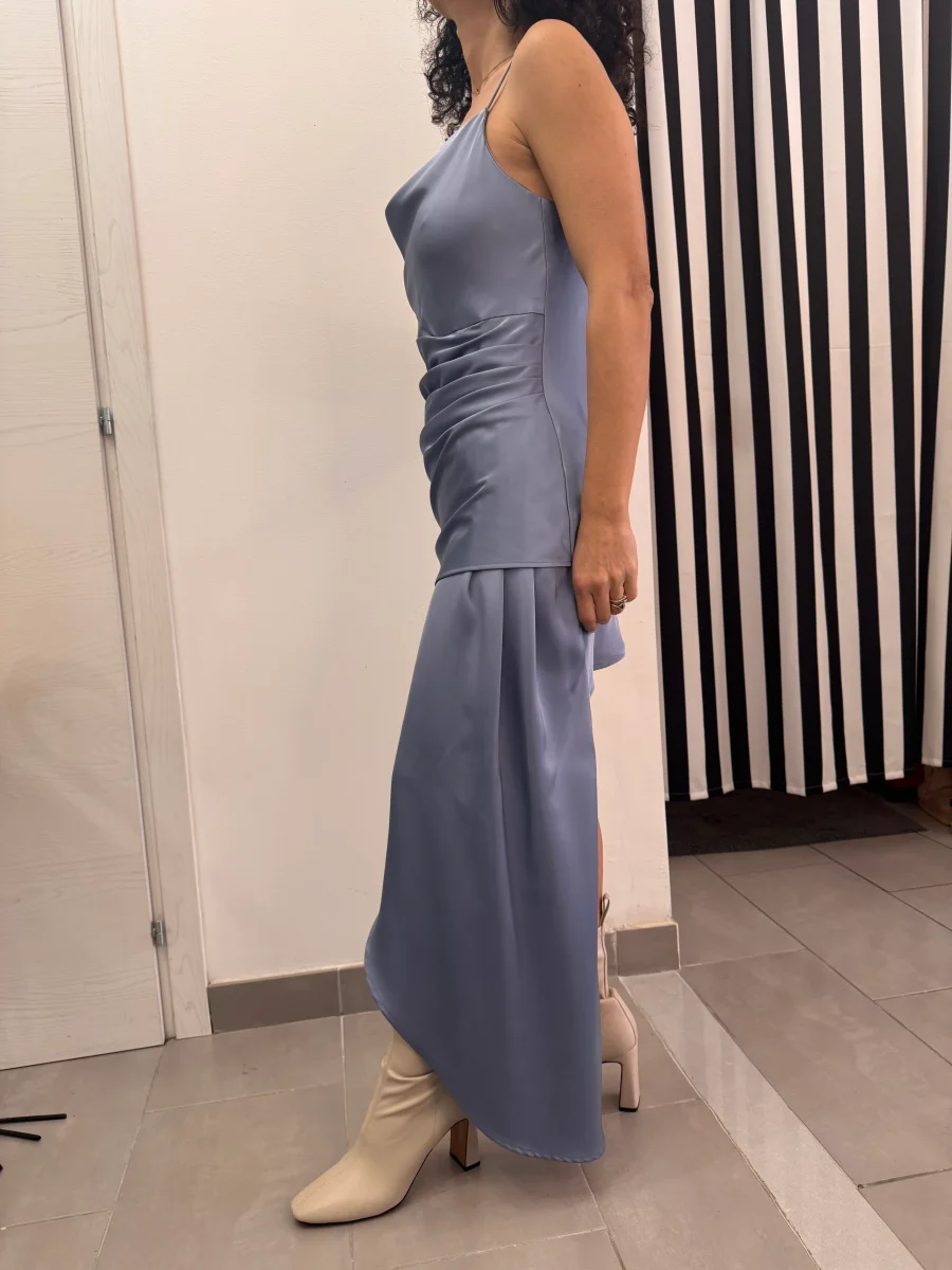 Tessuto in satin liscio e luminoso Scollo morbido con spalline sottili Drappeggio laterale che valorizza la silhouette Gonna asimmetrica con dettaglio lungo per un tocco scenografico Vestibilitร aderente ma confortevole