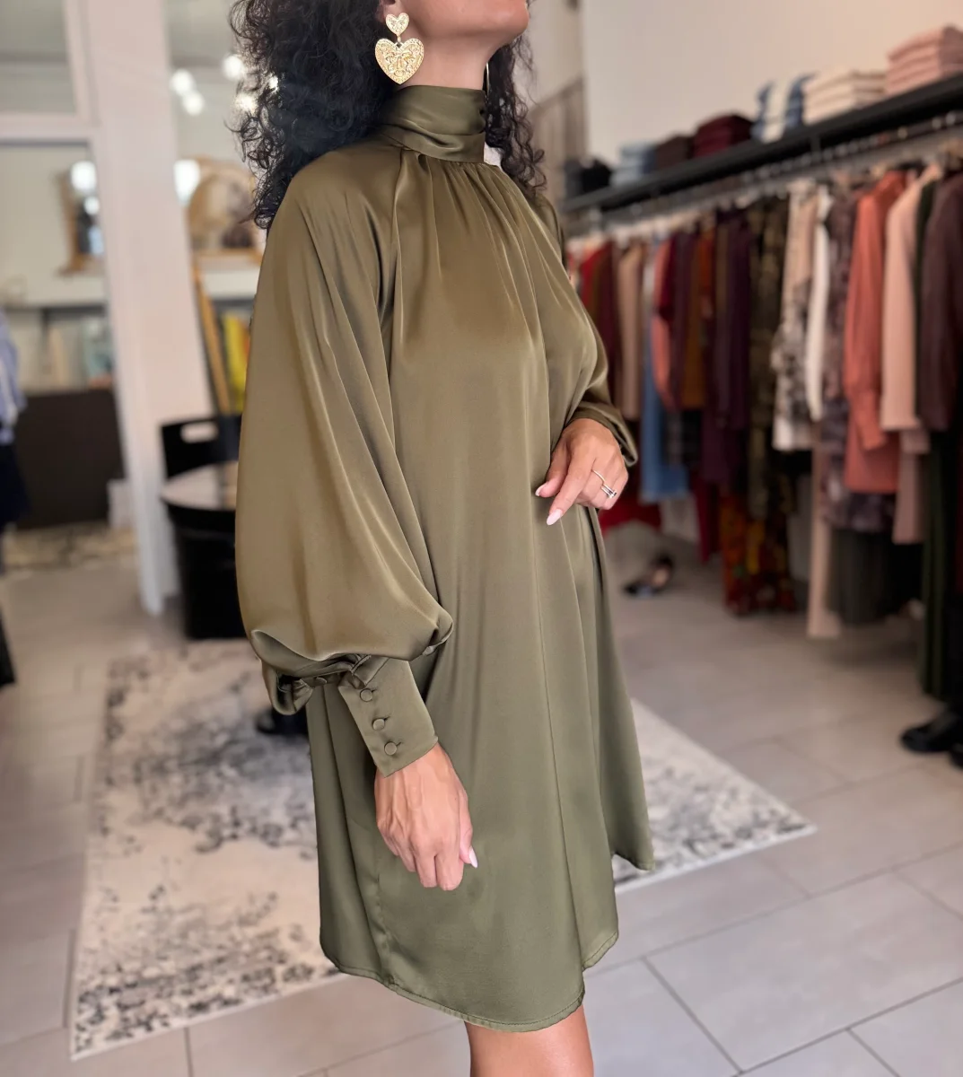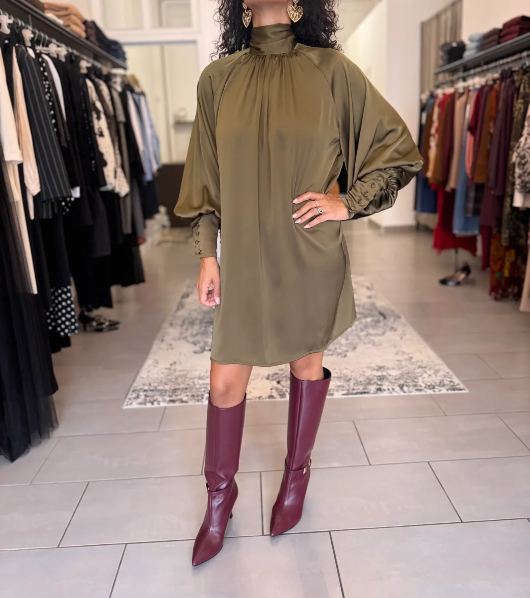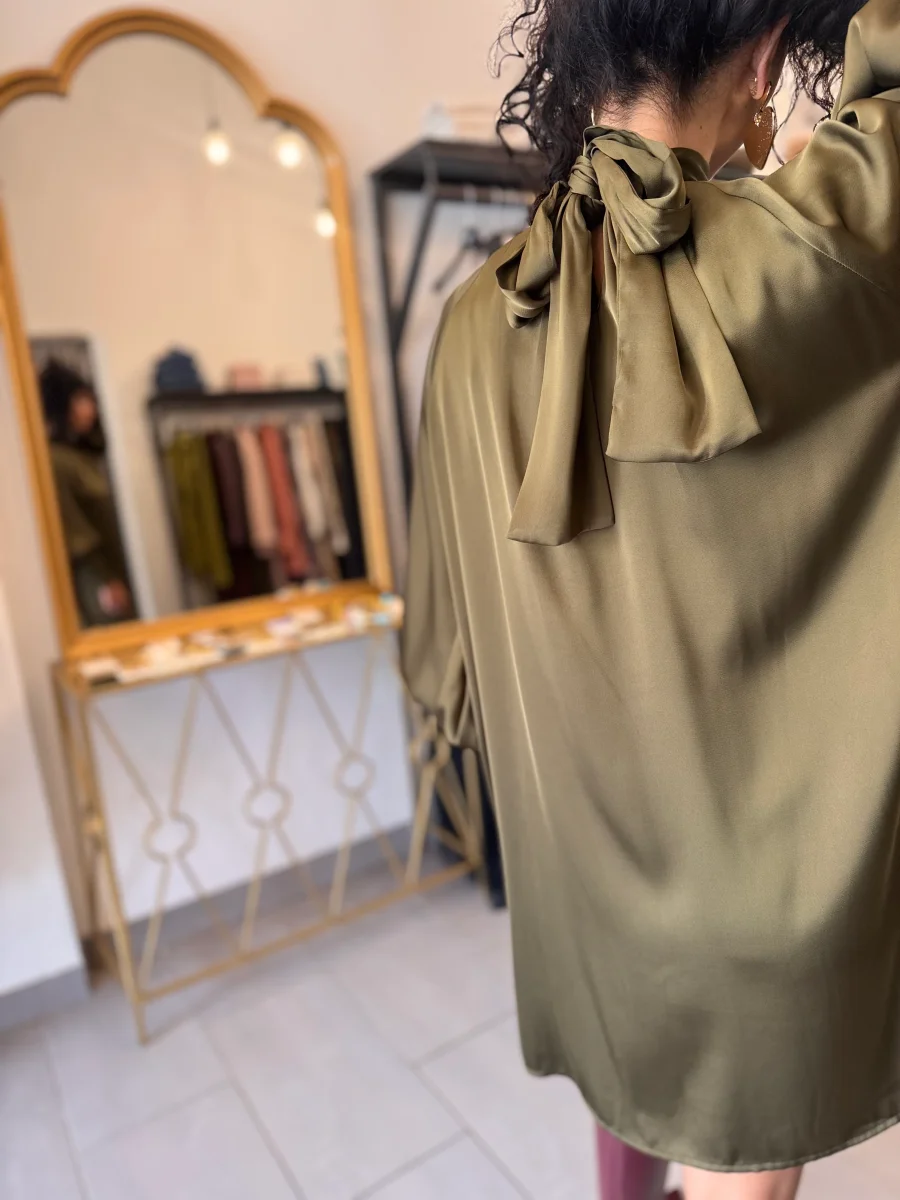 Colore military, collo a scialle che si lega dietro o si lascia morbido sul davanti . Polso con bottoncini .