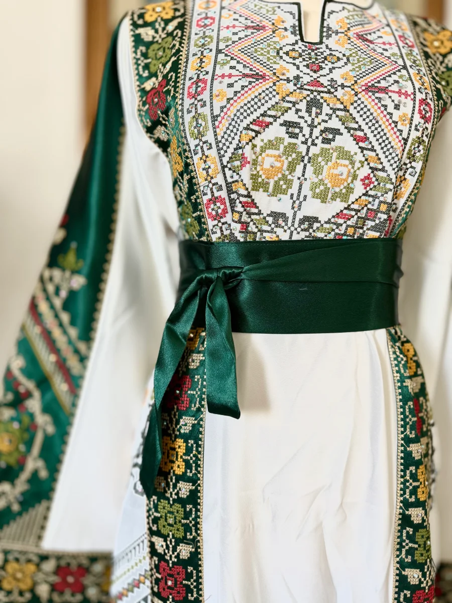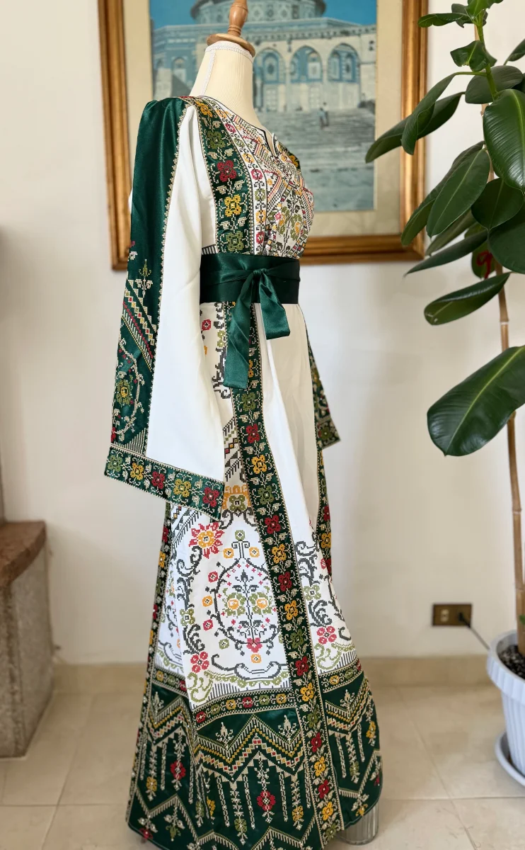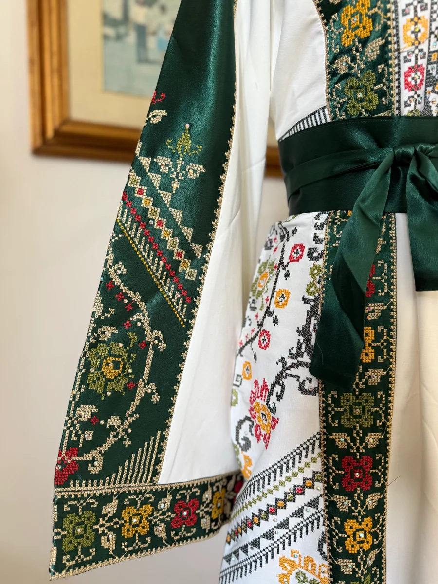 Un abito bianco e verde che celebra la forza e la delicatezza del ricamo palestinese, presente sia davanti che dietro.