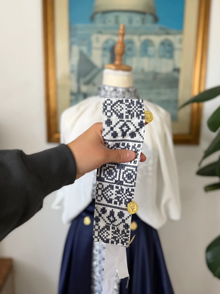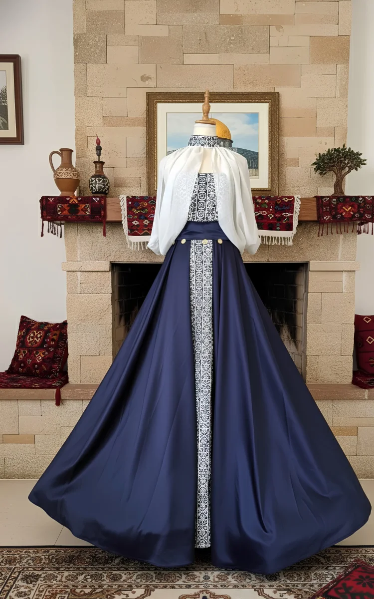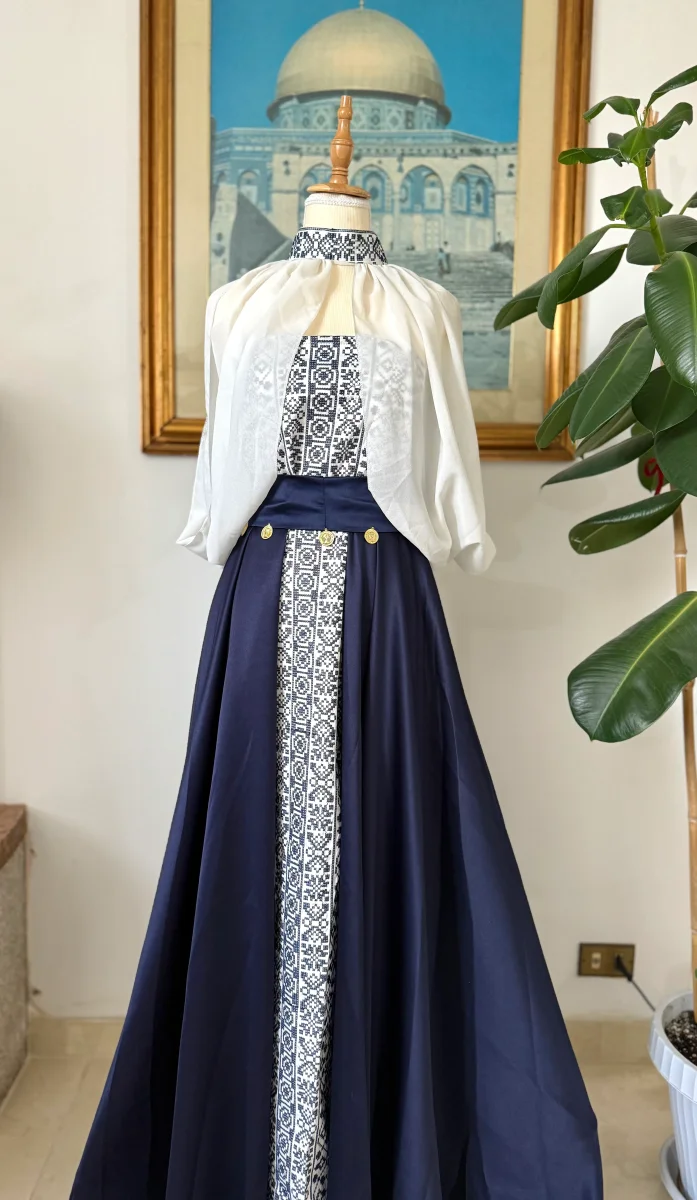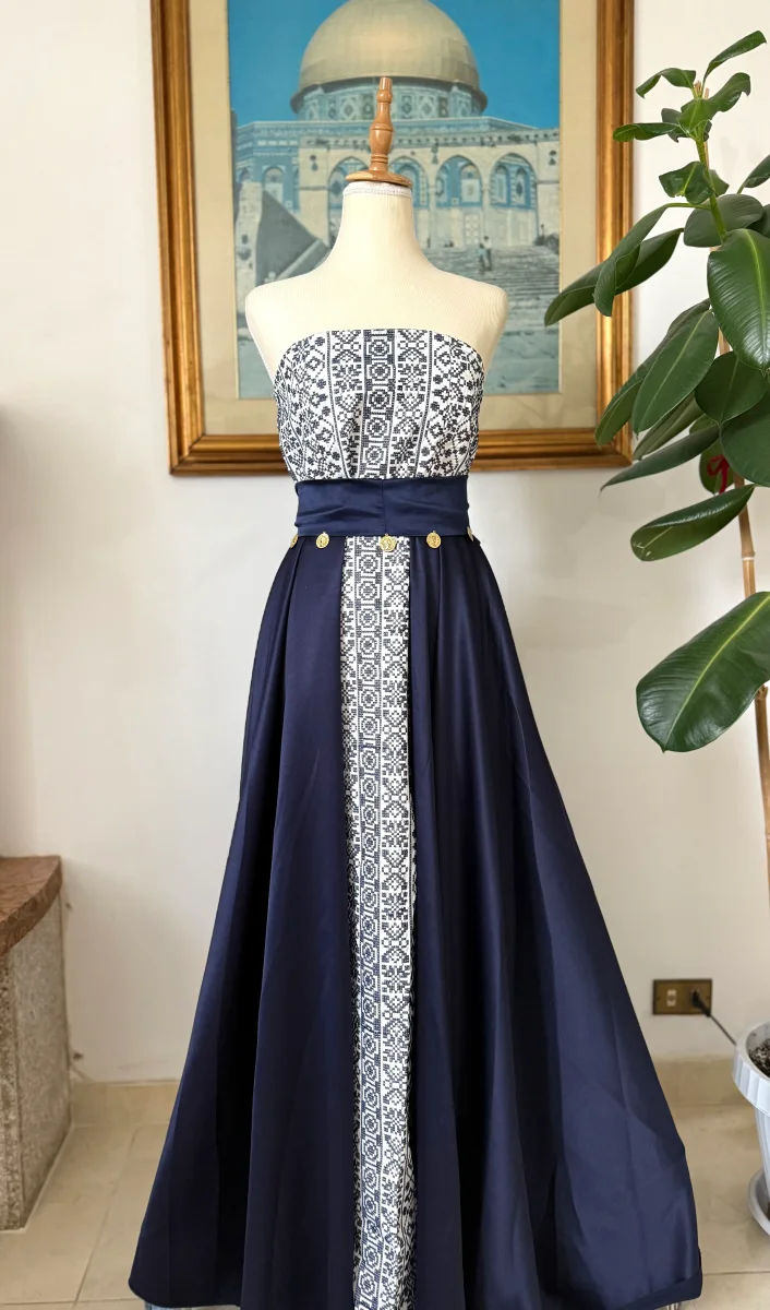 Layl è un abito da cerimonia dal fascino profondo, con gonna ampia e tatreez centrale che cattura lo sguardo. Il blu notte intenso evoca mistero e eleganza, mentre i dettagli colorati del tatreez celebrano l’arte palestinese, rendendolo perfetto per chi desidera distinguersi con stile e raffinatezza.