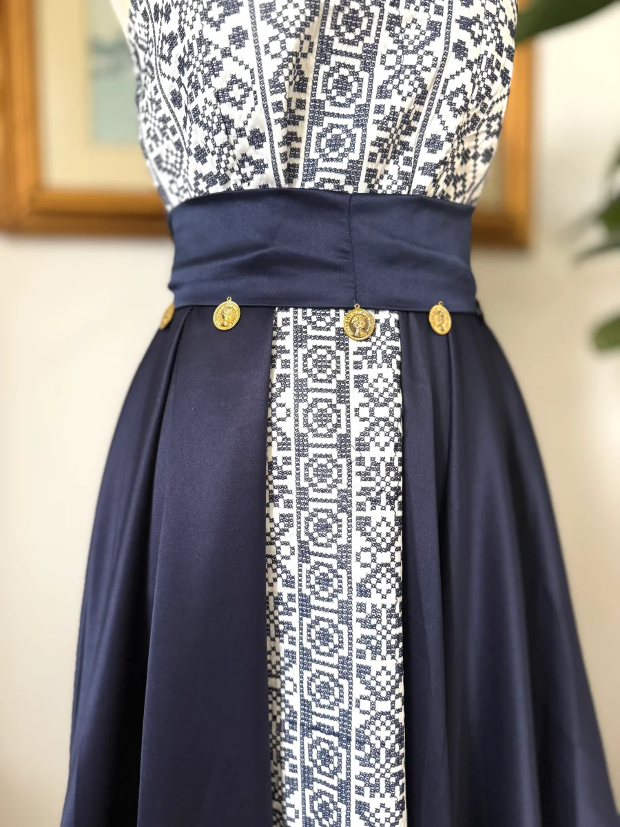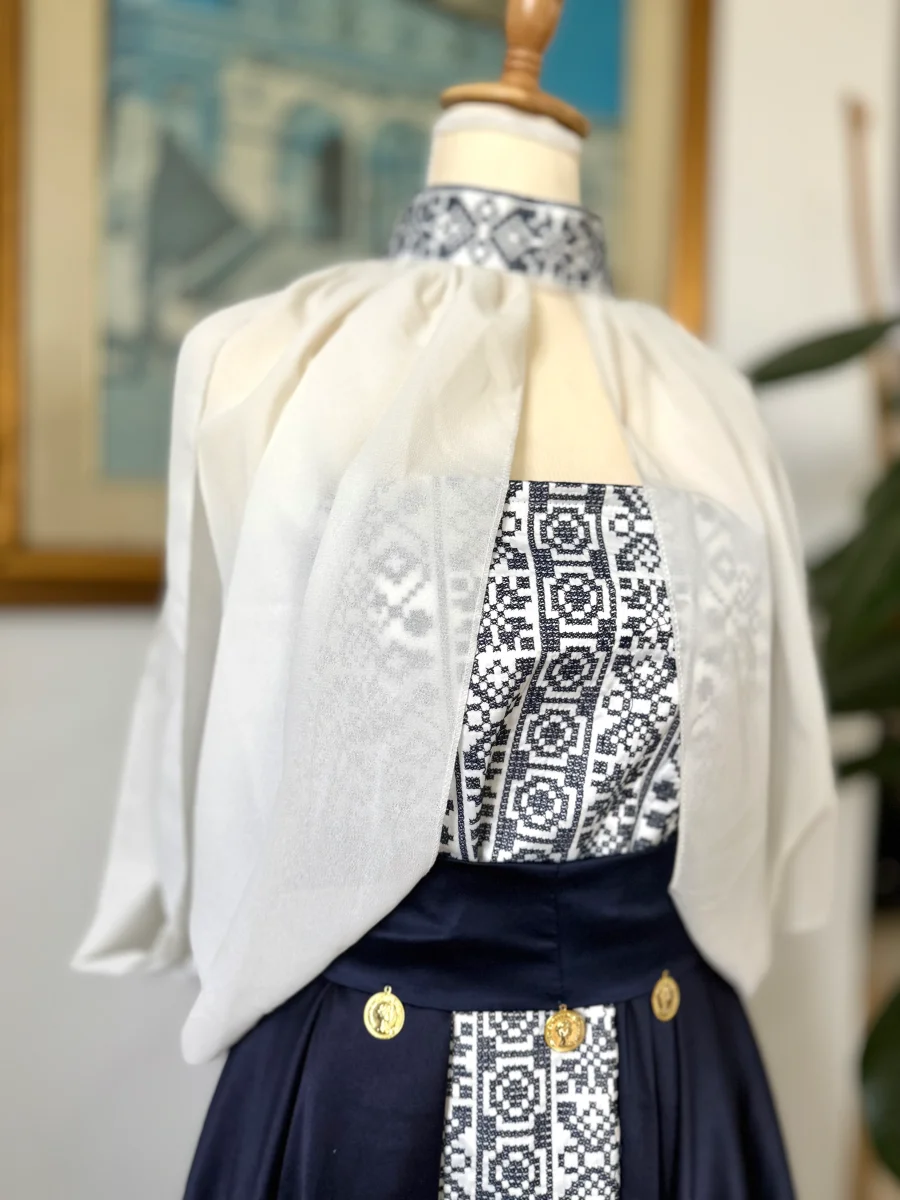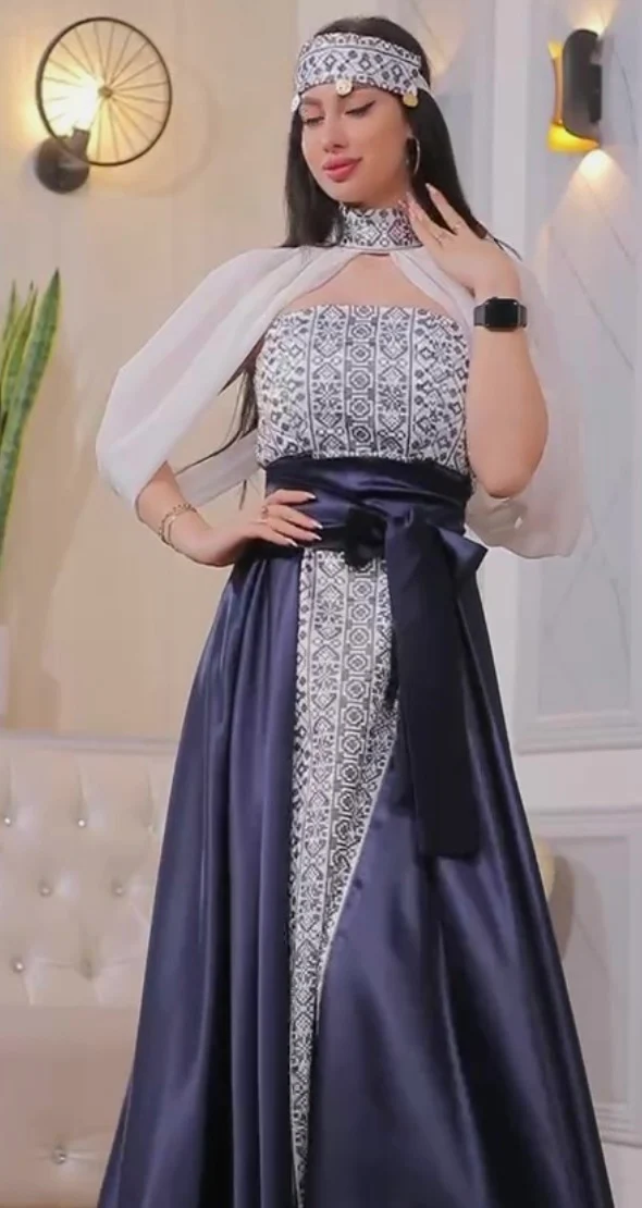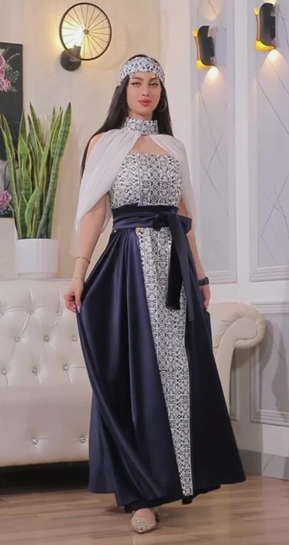 Layl è un abito da cerimonia dal fascino profondo, con gonna ampia e tatreez centrale che cattura lo sguardo. Il blu notte intenso evoca mistero e eleganza, mentre i dettagli colorati del tatreez celebrano l’arte palestinese, rendendolo perfetto per chi desidera distinguersi con stile e raffinatezza.