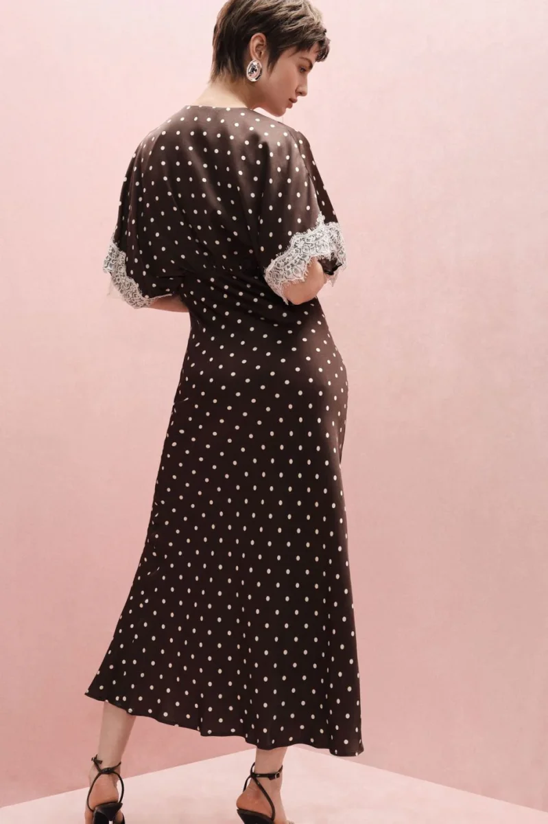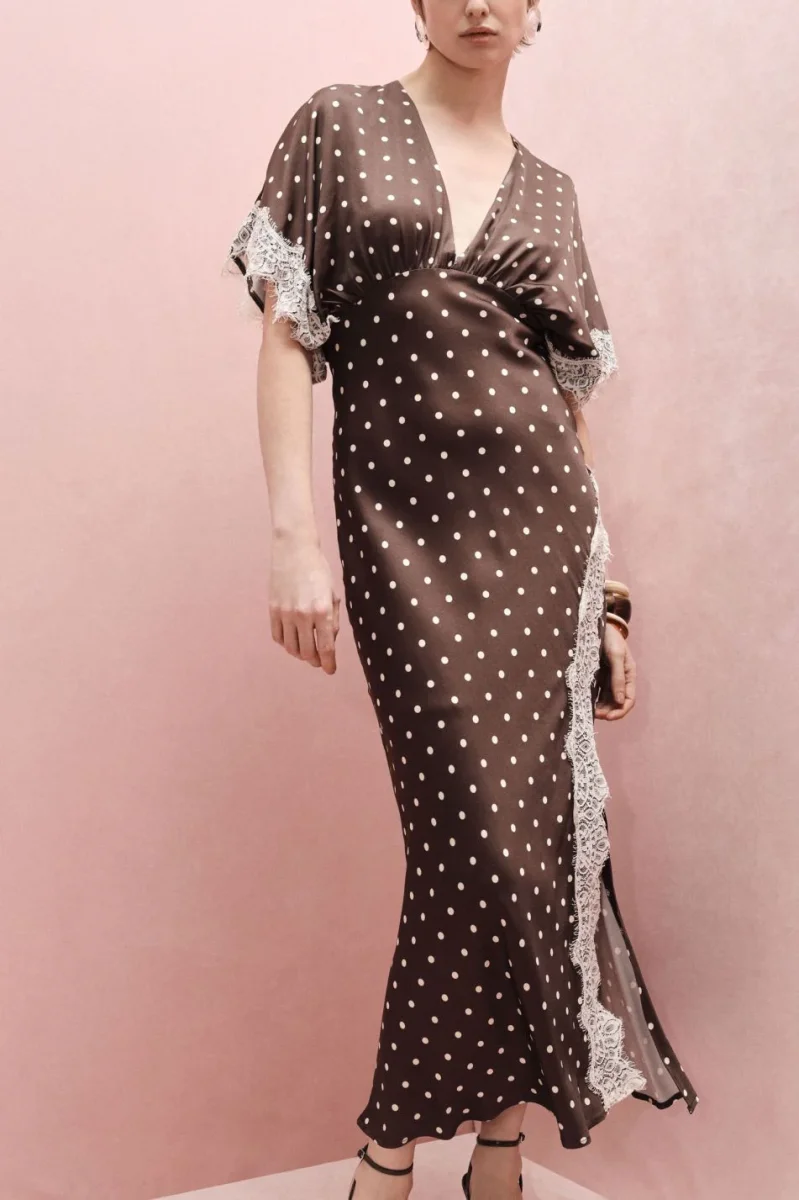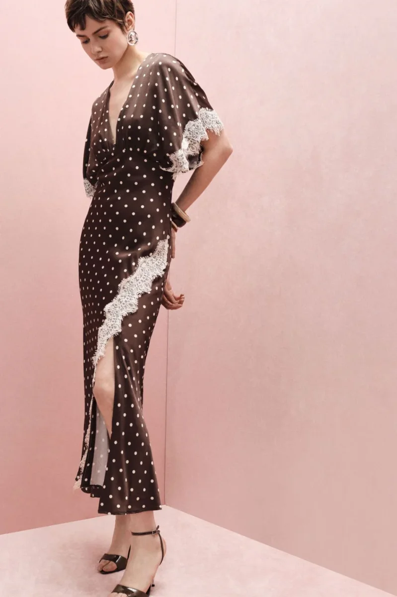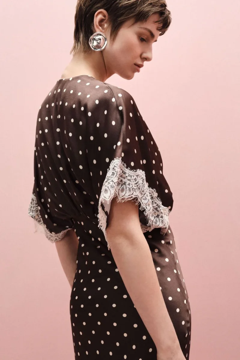 Abito lungo caratterizzato da una stampa a pois, ampie maniche corte decorate da raffinati inserti in pizzo e profondo scollo a v. Il taglio dritto e lo spacco laterale conferiscono dinamismo alla silhouette, assicurando versatilitร e stile per occasioni urbane e sofisticate. Un capo ideale per esprimere il proprio stile personale con una proposta attenta al dettaglio e alle nuove tendenze.