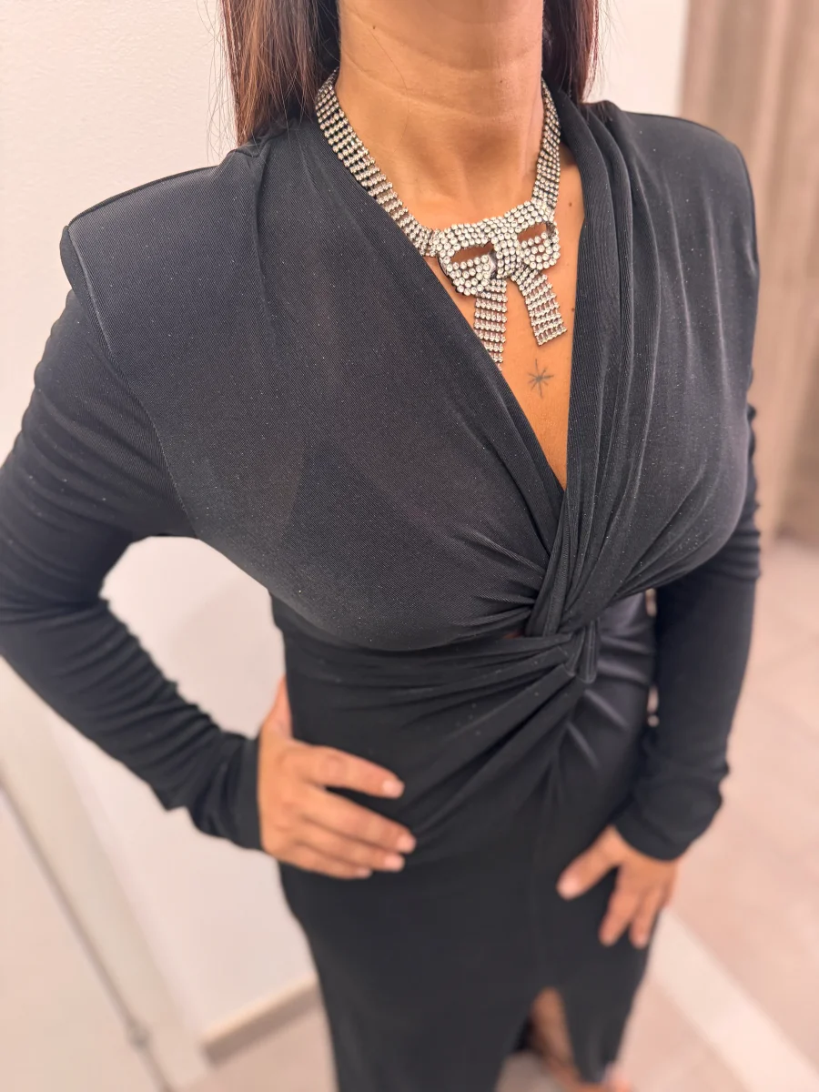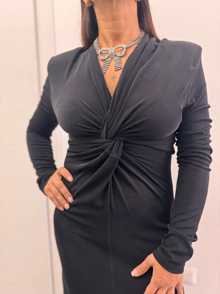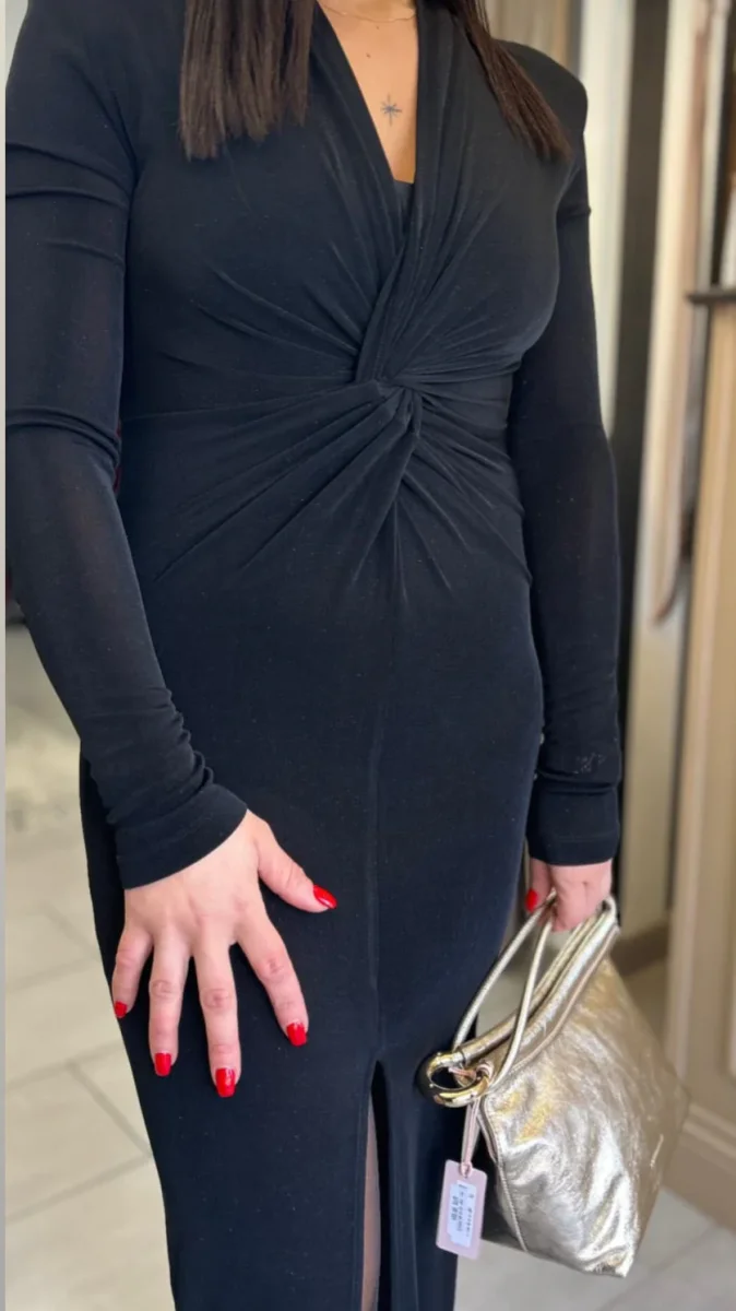 Manica lunga , dettaglio nodo scollatura , spallina incorporata. Tessuto lurex .