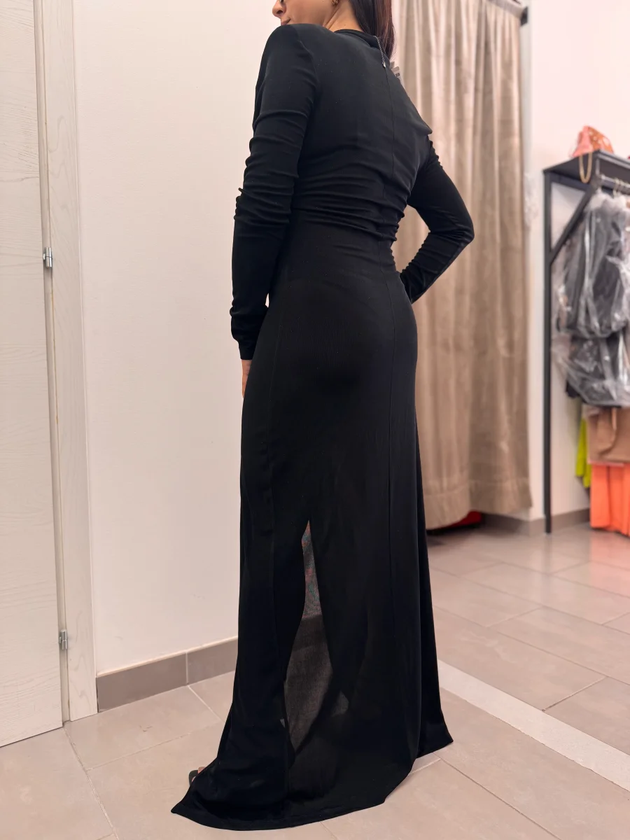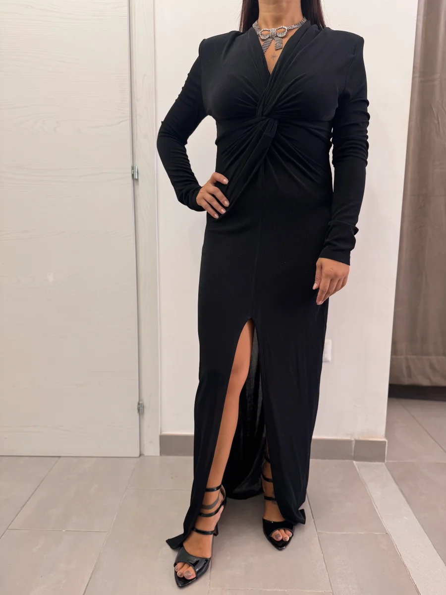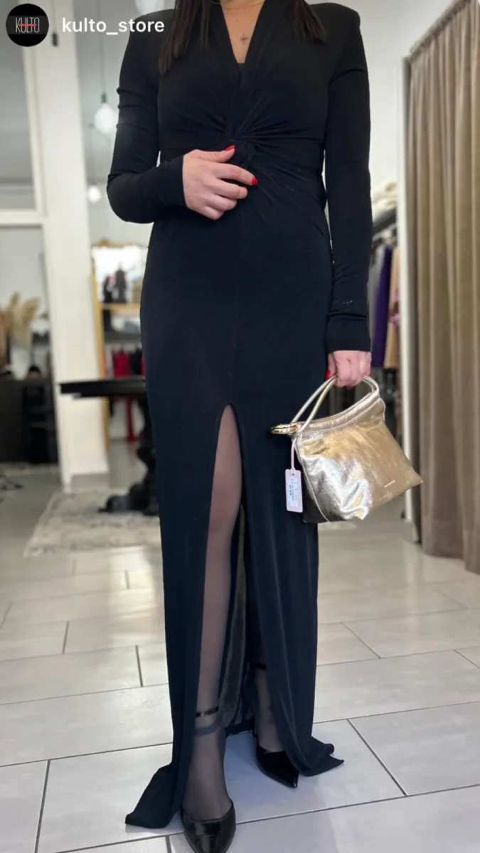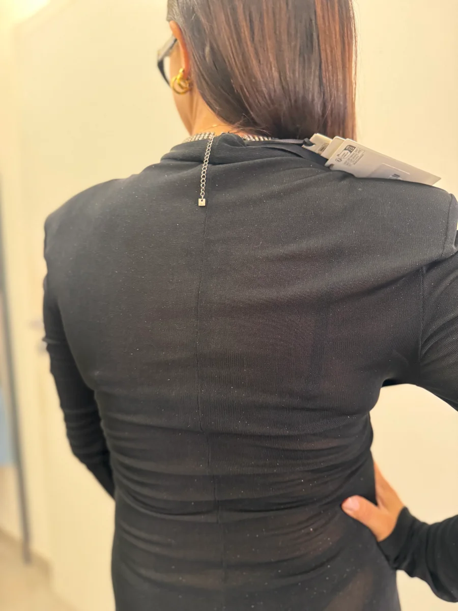 Manica lunga , dettaglio nodo scollatura , spallina incorporata. Tessuto lurex .