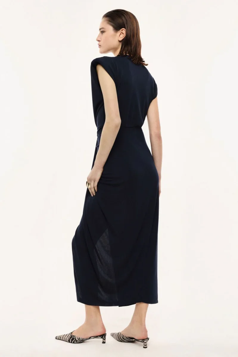 Abito lungo privo di maniche con scollo a v profondo, caratterizzato da spalle strutturate e una raffinata arricciatura centrale che scende verticalmente creando drappeggi. La silhouette enfatizza la figura e lo spacco frontale aggiunge movimento, rendendo perfetto il capo per eventi esclusivi e serate in cittร .