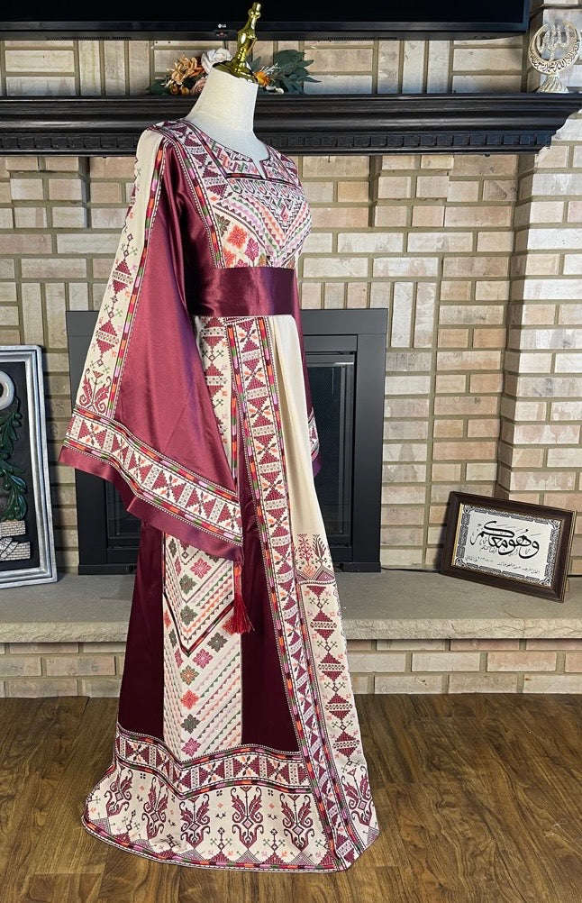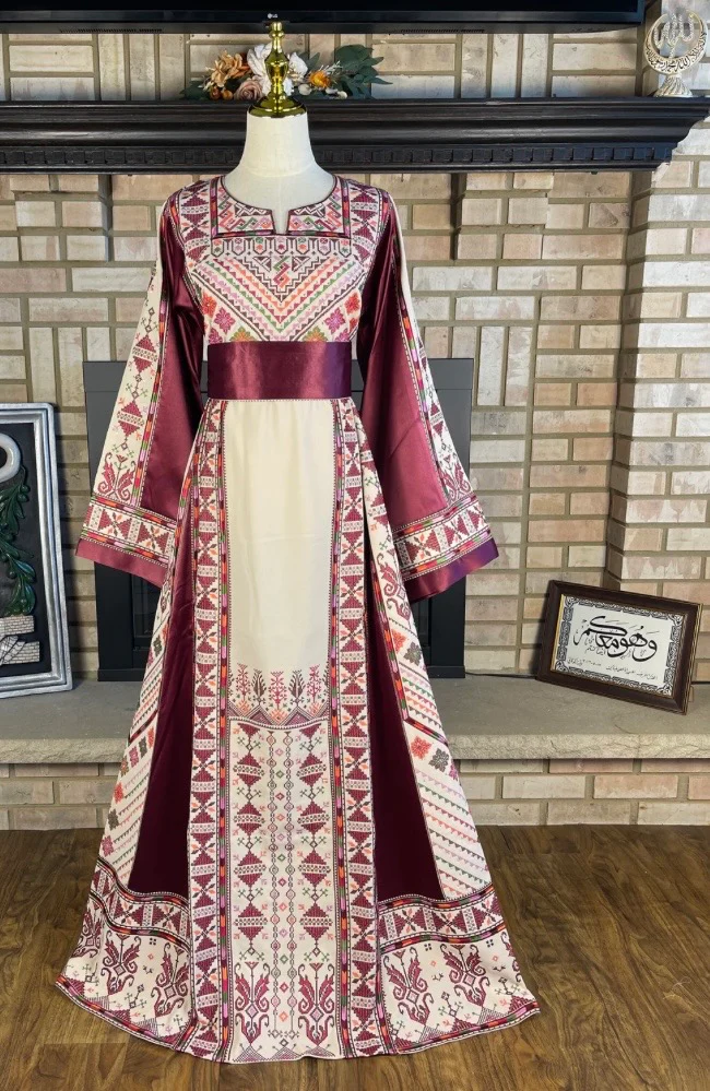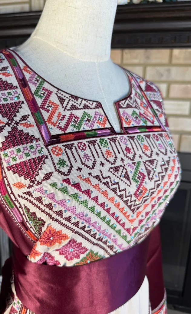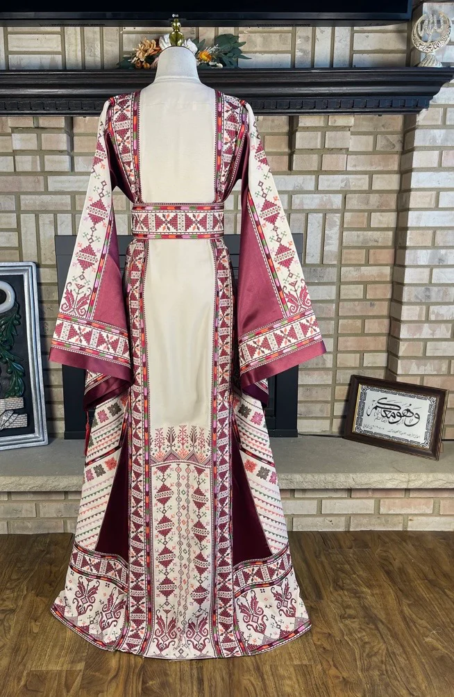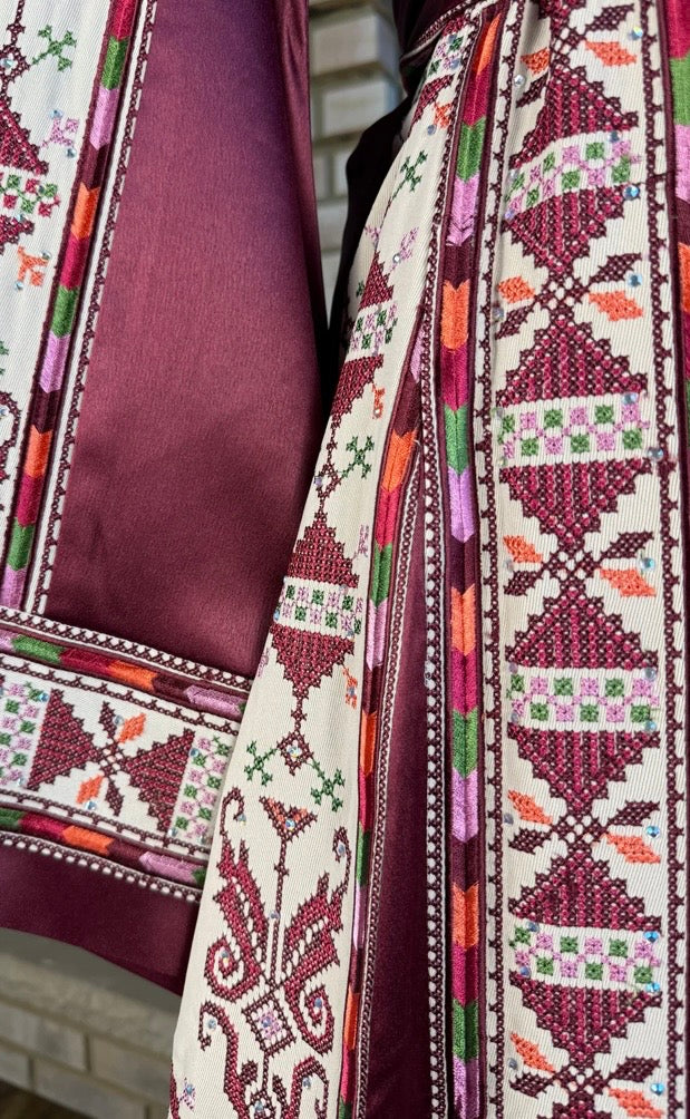 Akka, ispirato alla storica città palestinese di Acri, unisce fascino e tradizione in un design unico. L’abito bianco e bordeaux è impreziosito da tatreez colorati, che richiamano i motivi antichi dei mercati e dei porti della città. Un capo che evoca storia, eleganza e movimento, perfetto per chi desidera indossare la bellezza di un patrimonio culturale ricco e vibrante.