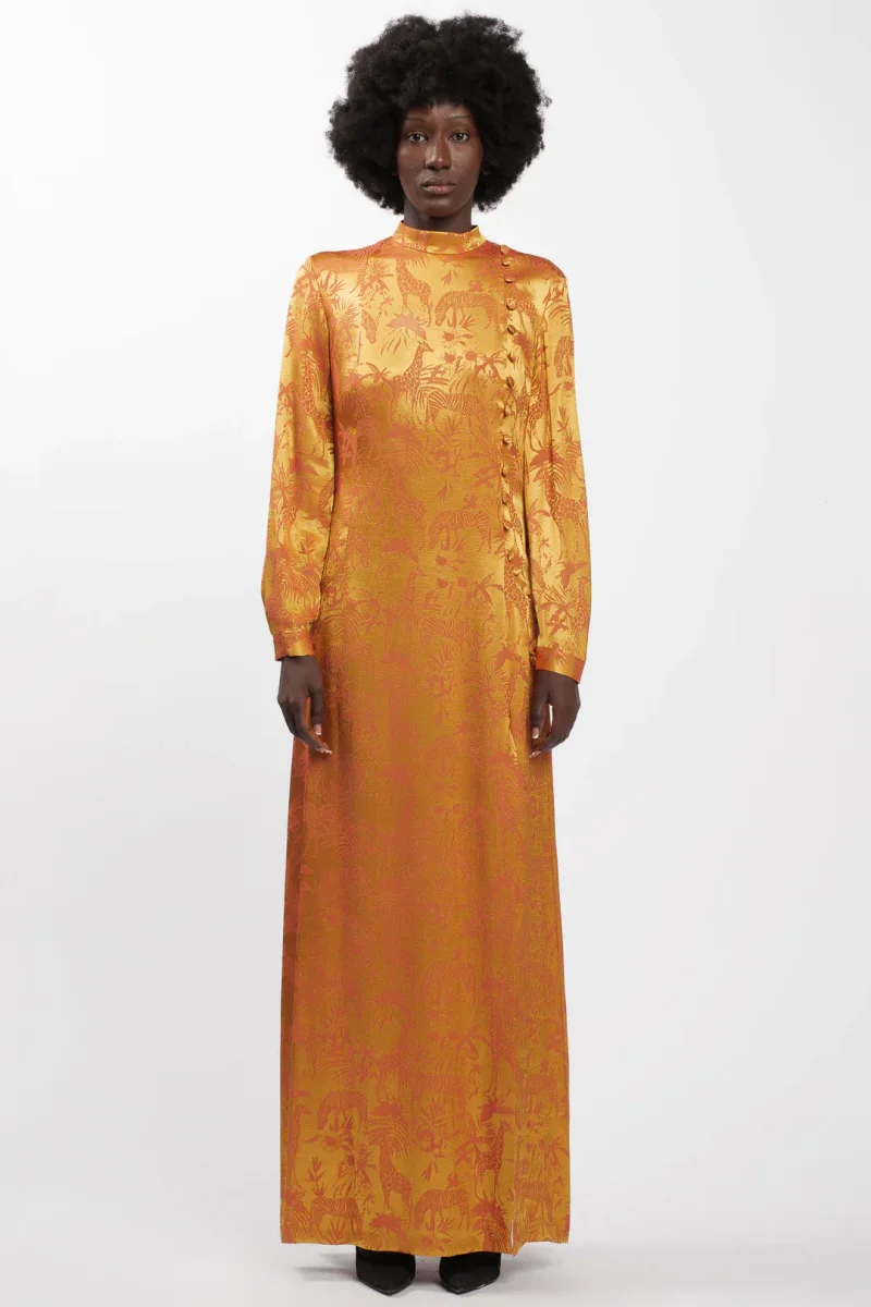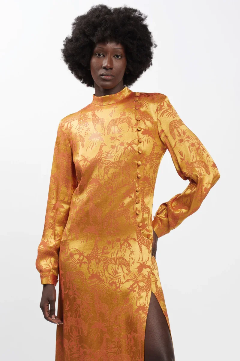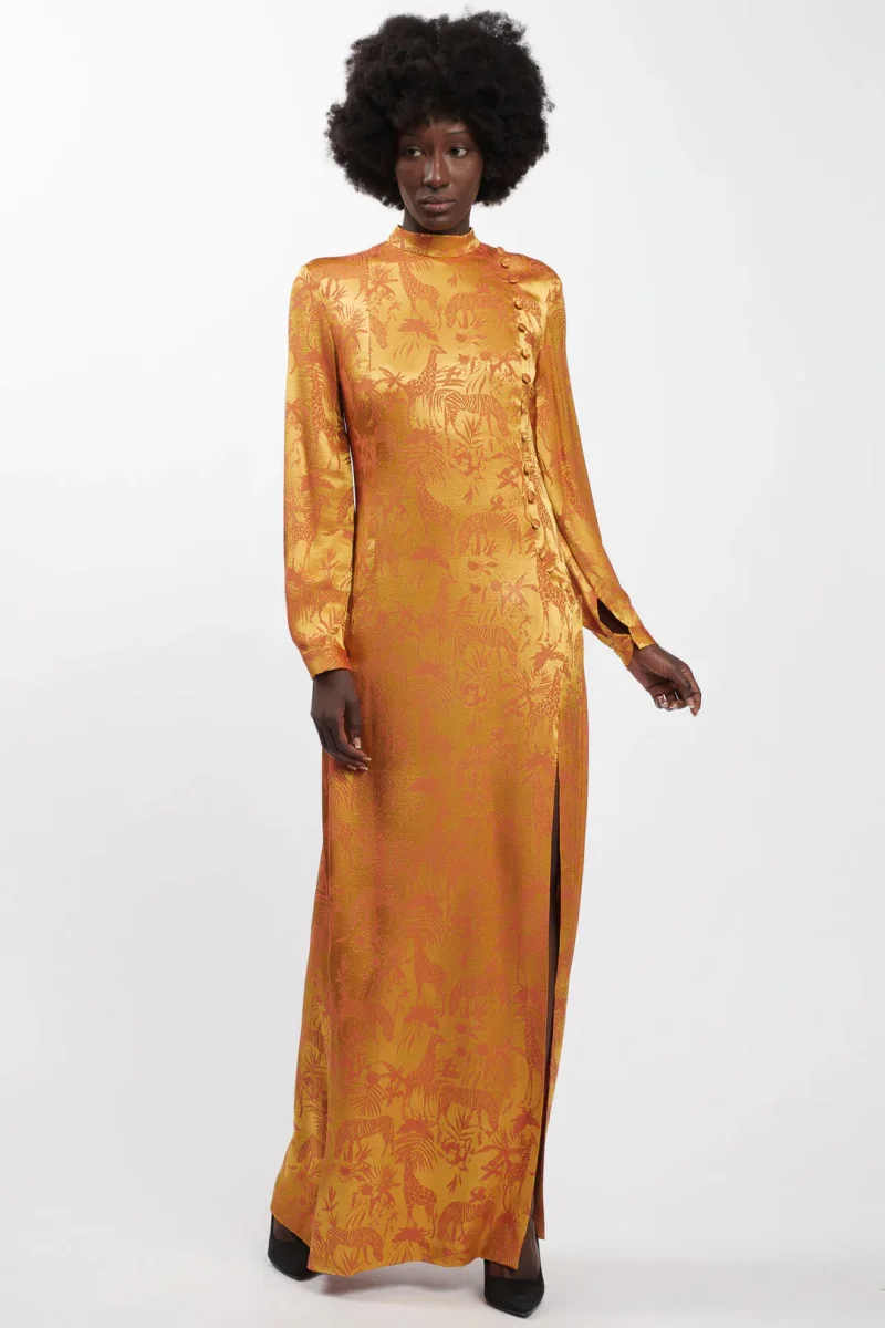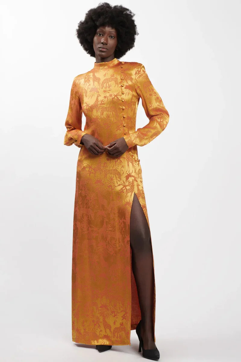 Abito dalla fantasia etnica. La sua particolaritร  รจ nella fantasia caratterizzato da uno spacco laterale, colletto coreano e dettaglio bottoncini