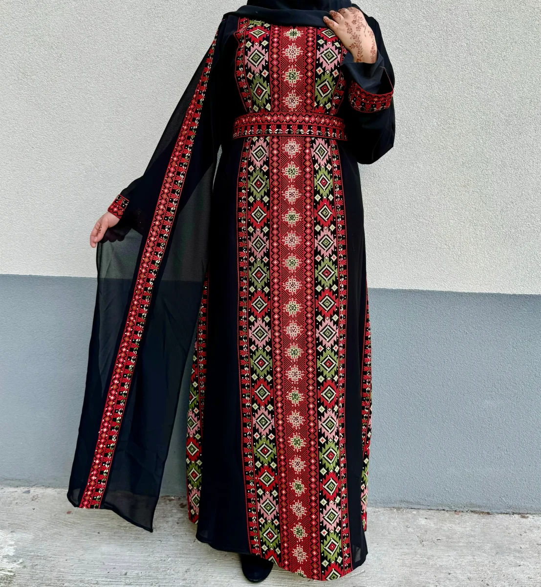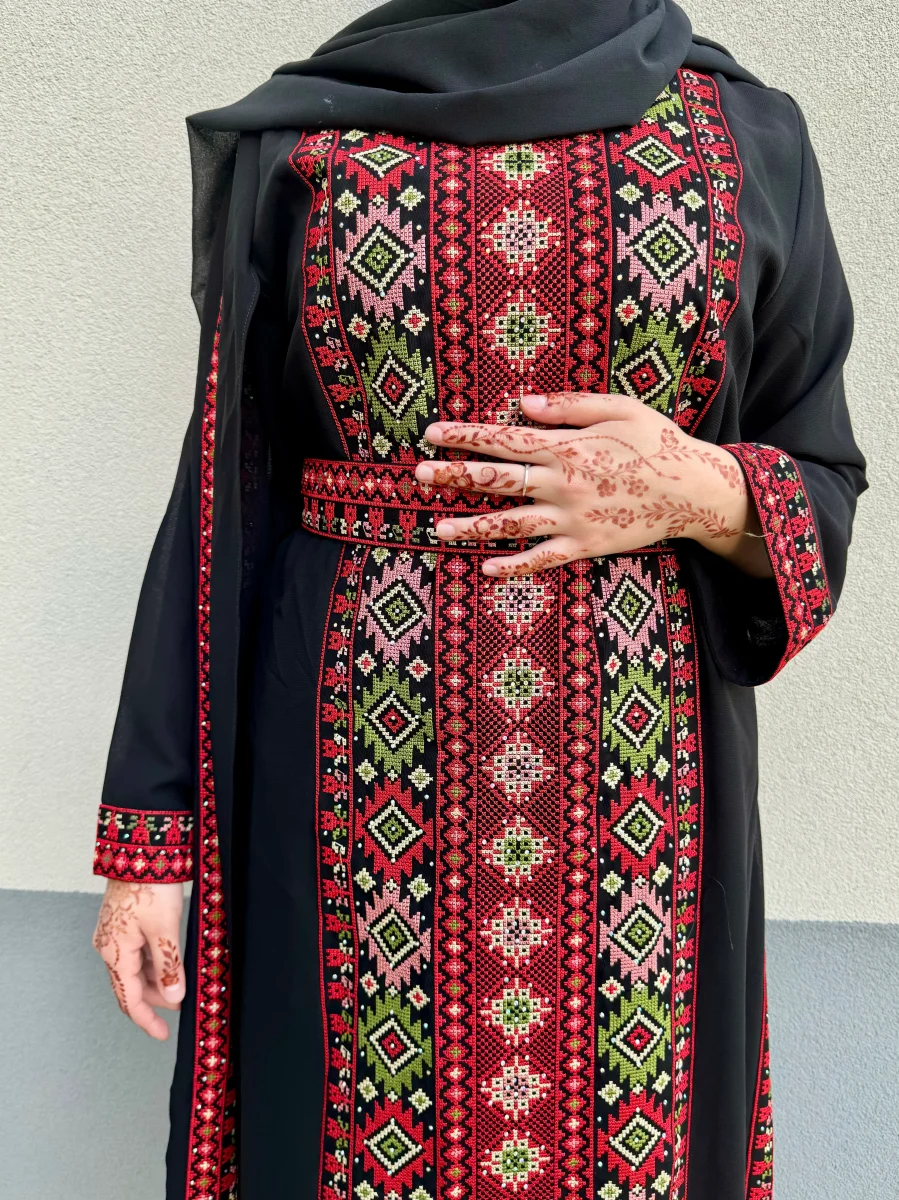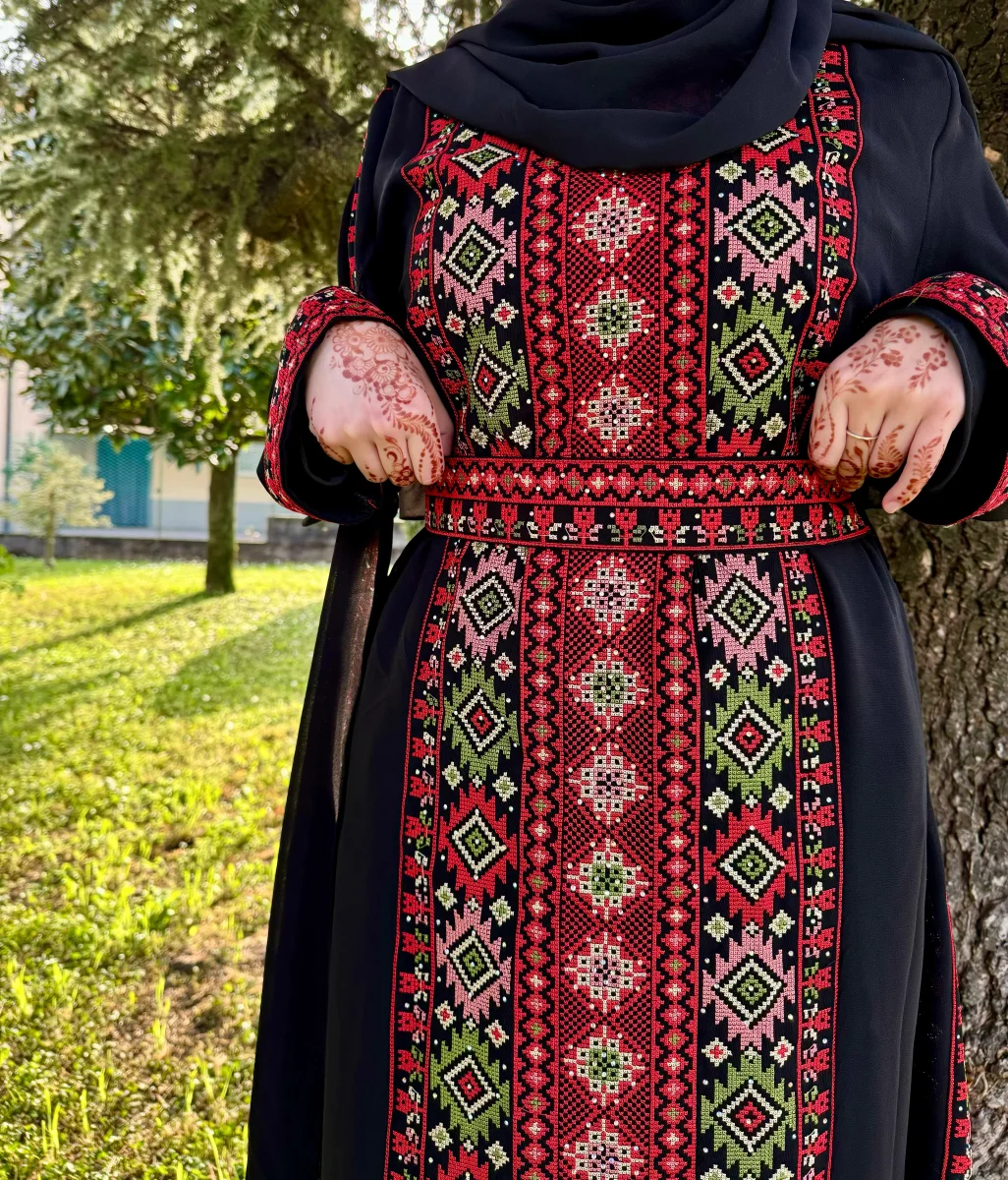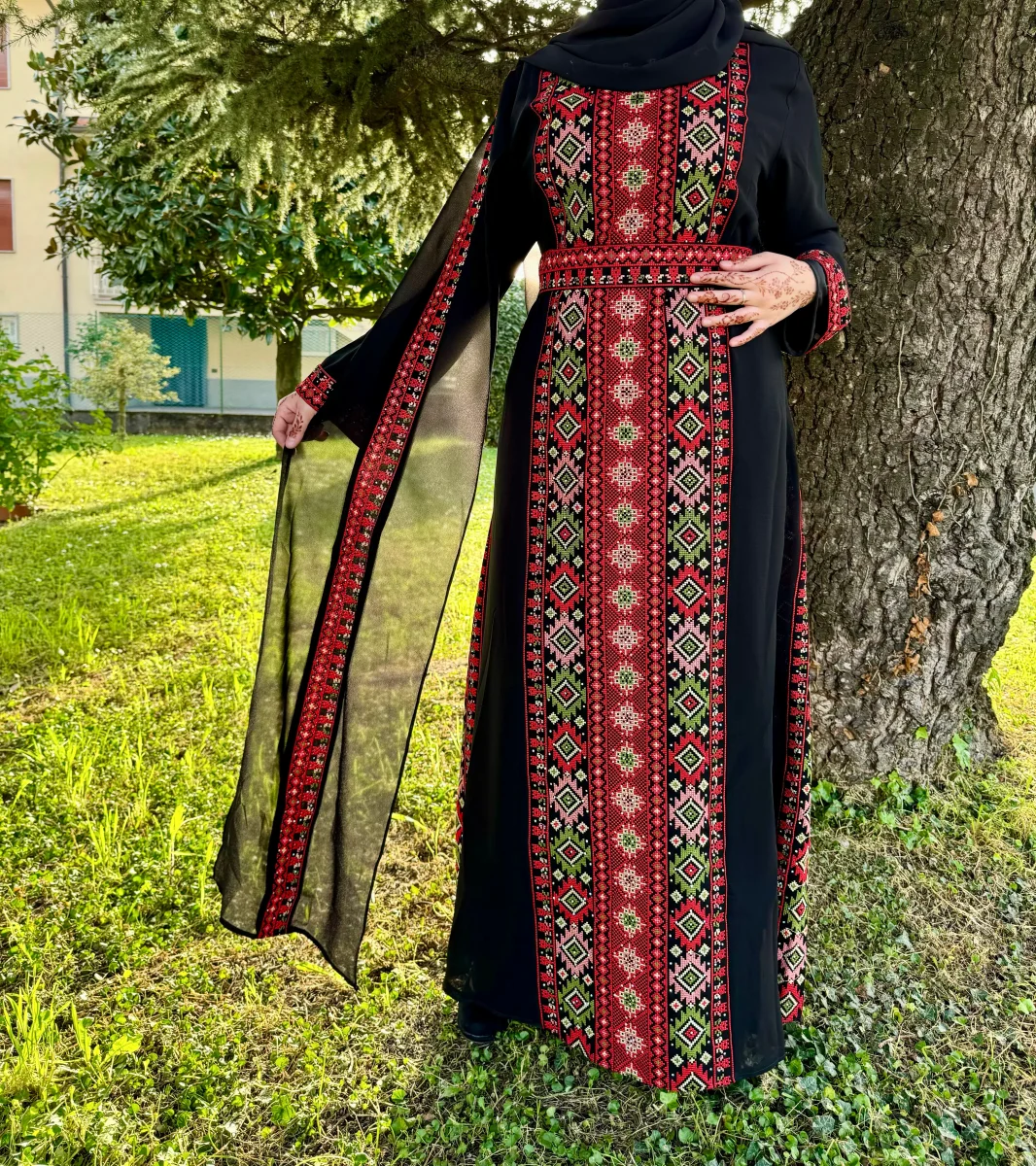 Abito tradizionale palestinese nero con tatreez colorato, e mantellina elegante sullaspalla destra.Lโabito si compone di 3 pezzi: una sottoveste nera, lโabito e la cintura.