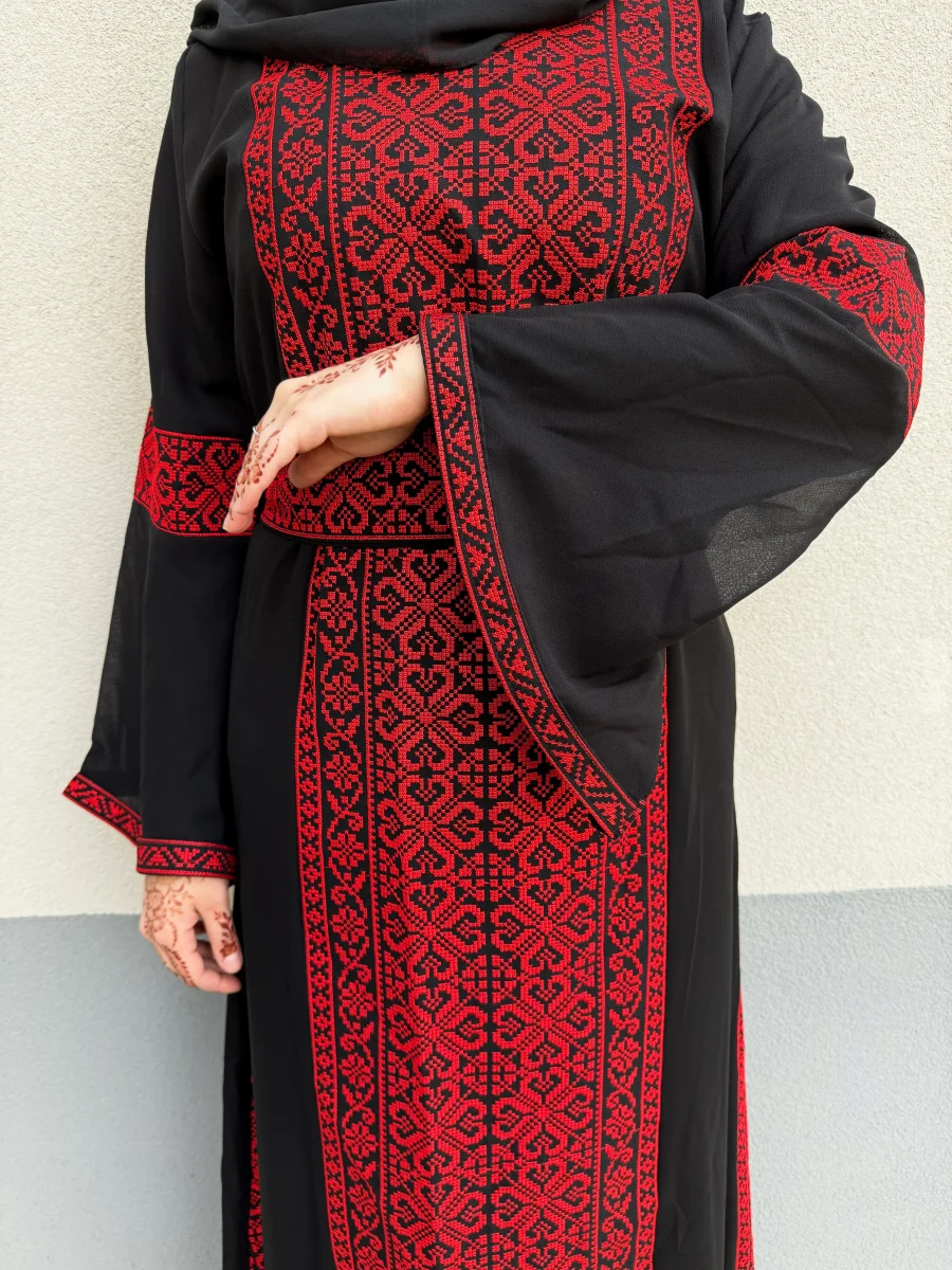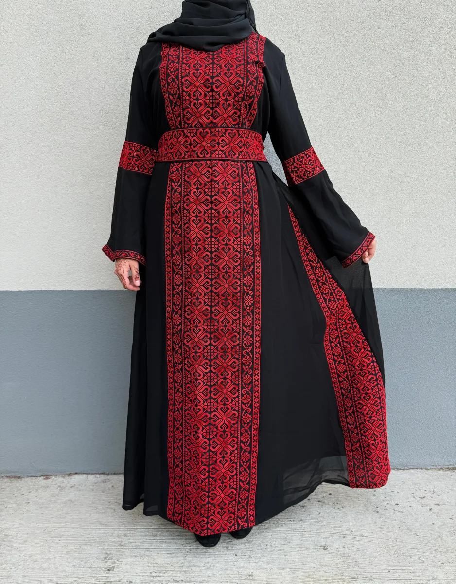 Abito tradizionale palestinese nero con tatreez rosso avanti e dietro.Lโabito si compone di 3 pezzi: una sottoveste nera, lโabito e la cintura.