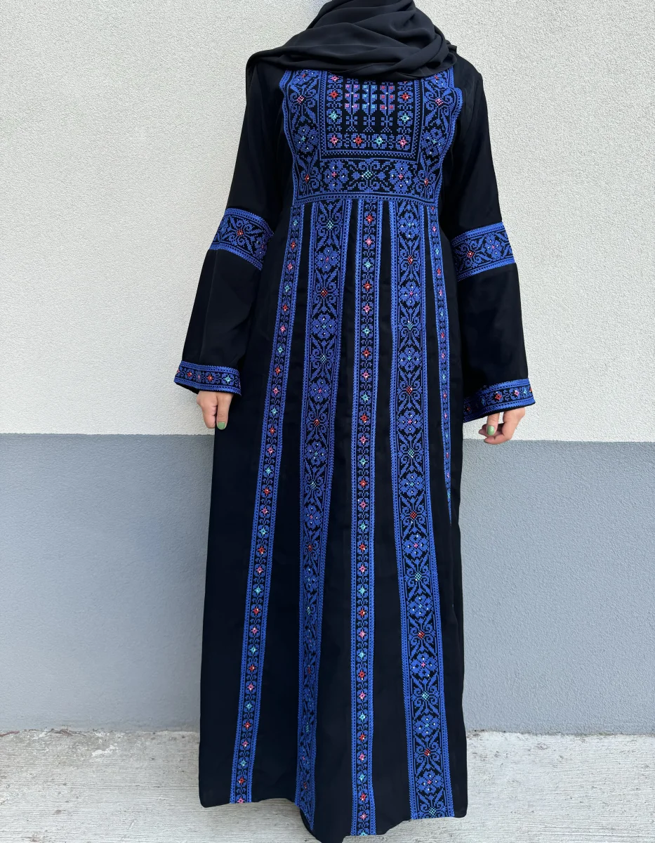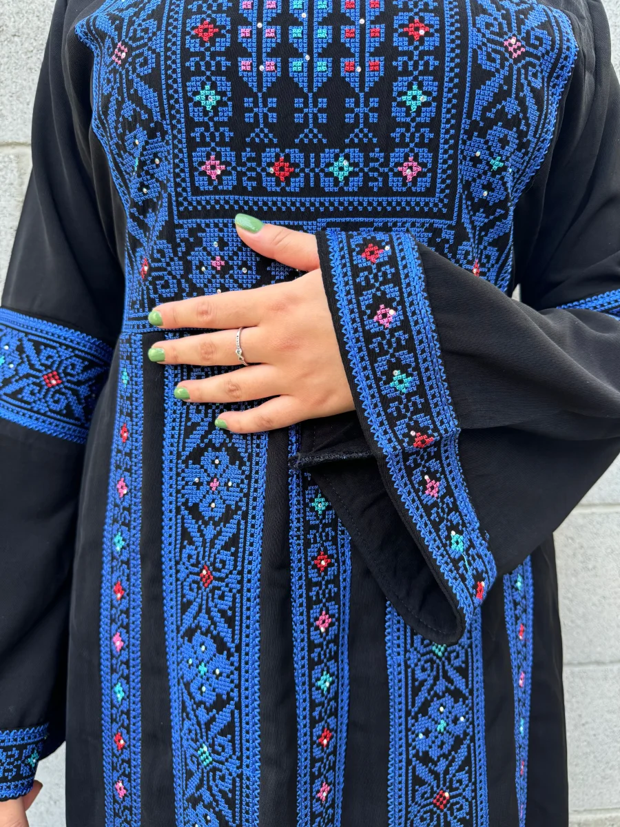 Abito tradizionale palestinese nero con tatreez blu notte e strass.