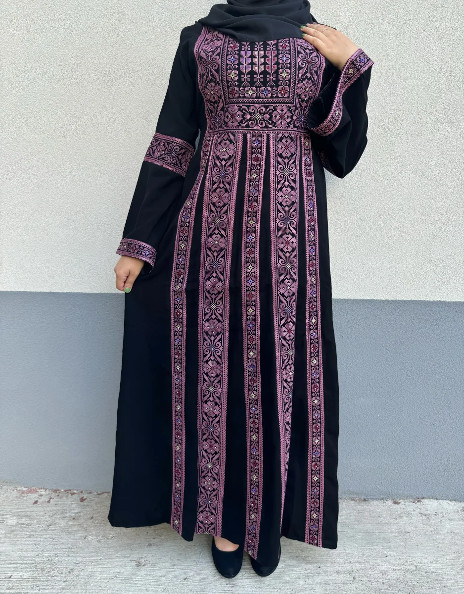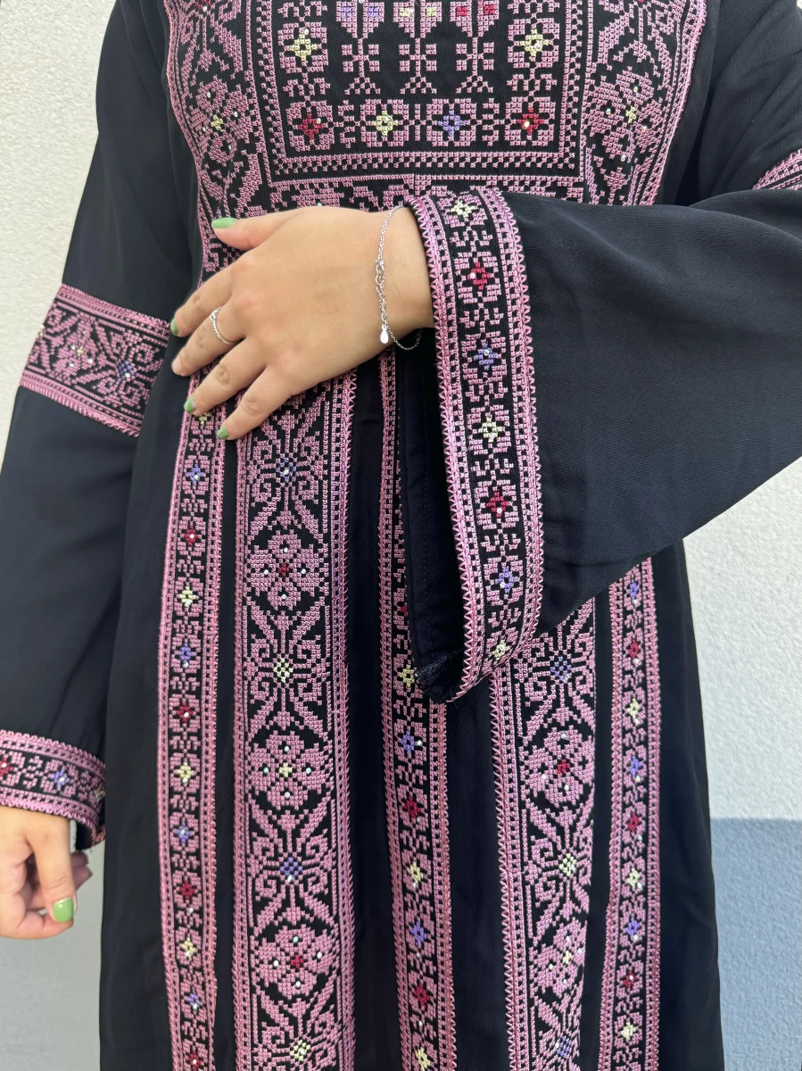 Abito tradizionale palestinese nero con tatreez rosa antico e strass.
