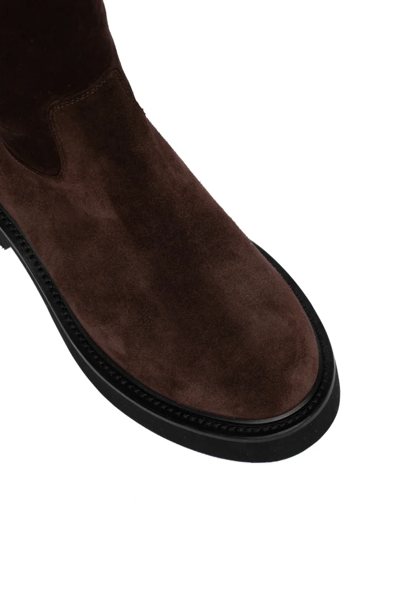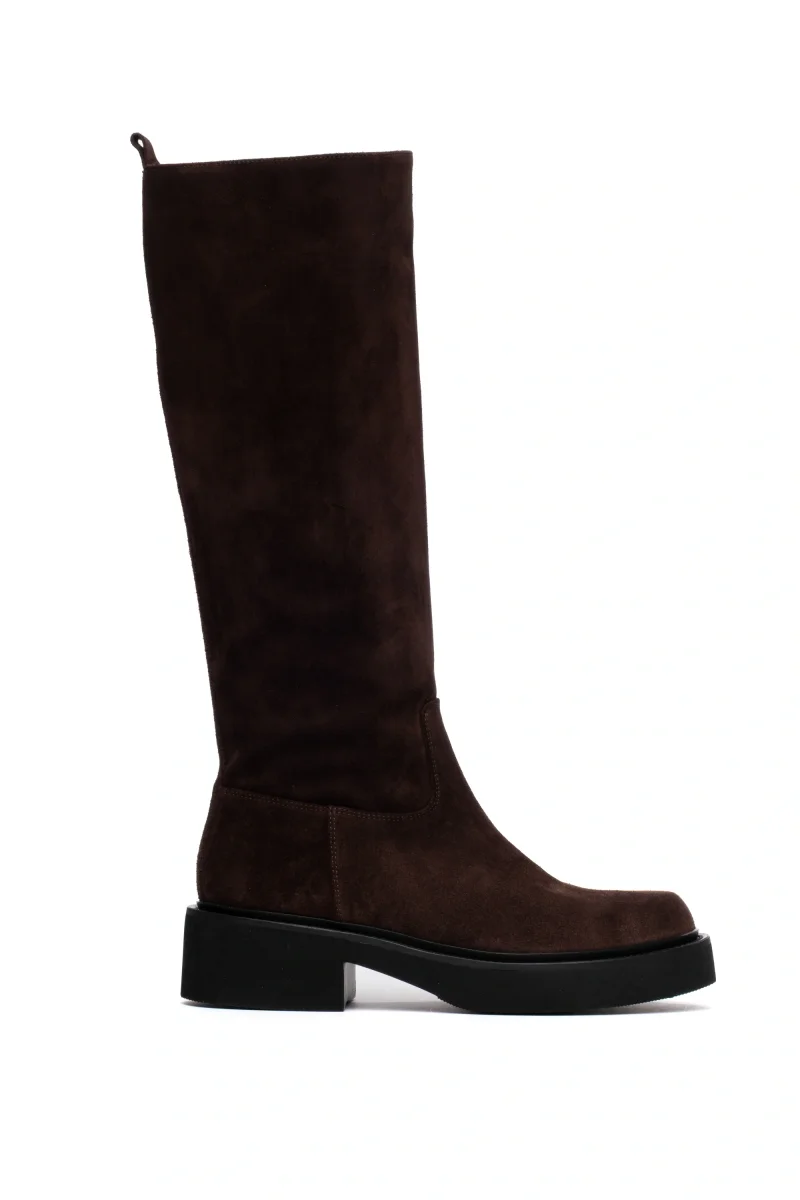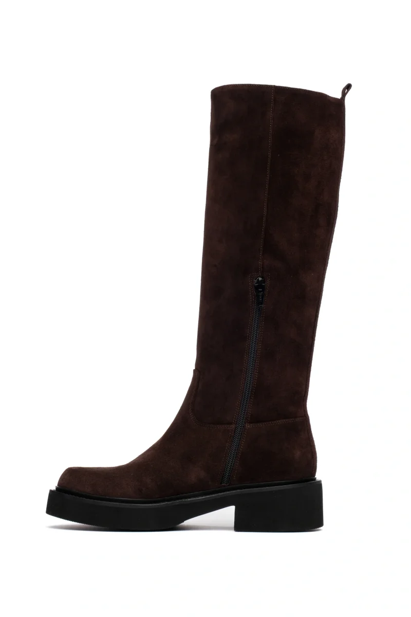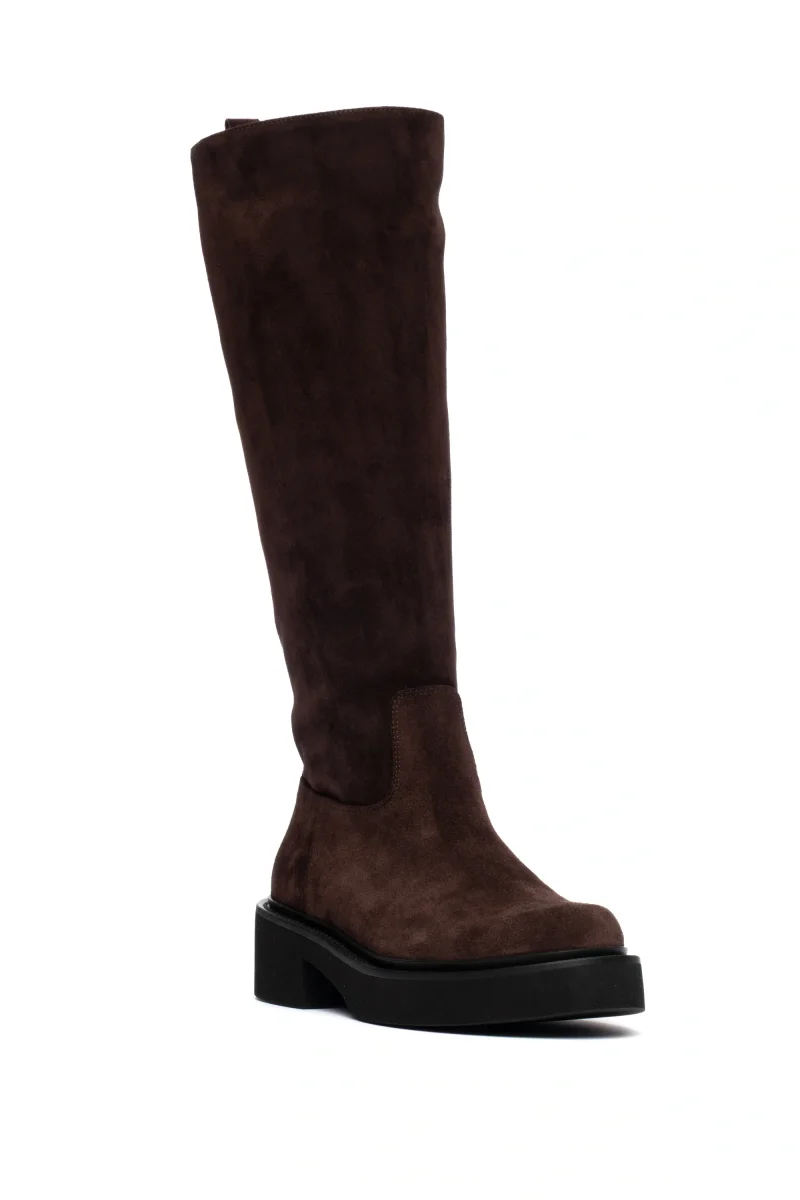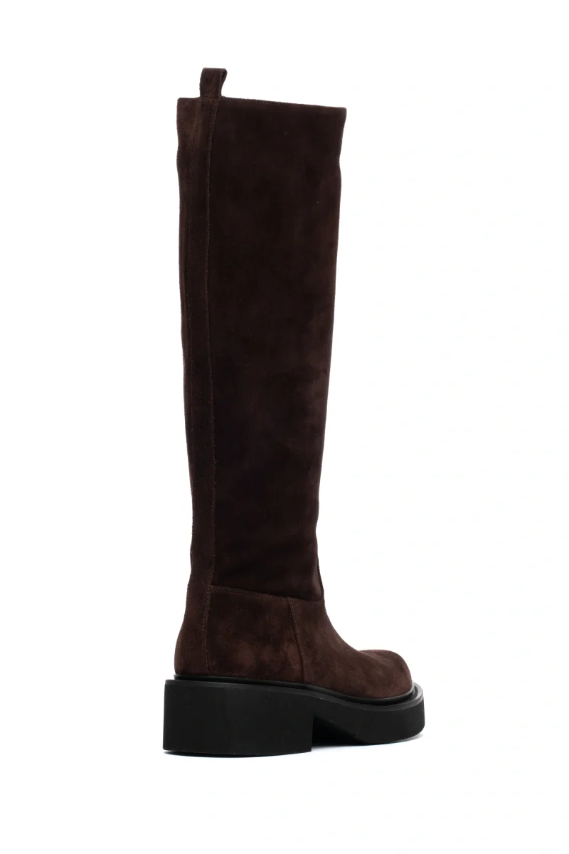 Lo stivale sotto al ginocchio in camoscio testa di moro è il modello ideale per chi cerca un equilibrio tra comfort e stile urbano. Presenta una punta leggermente arrotondata e un fondo sportivo in gomma nera a contrasto da 3 cm, che garantisce stabilità e comodità durante tutta la giornata. La zip interna a tutta lunghezza rende la calzata pratica e veloce, mantenendo il gambale lineare e slanciato.Perfetto da indossare con jeans skinny, gonne o abiti in maglia, questo stivale dal carattere sportivo ma raffinato si adatta facilmente a look casual e metropolitani.