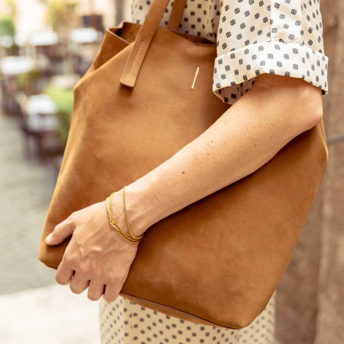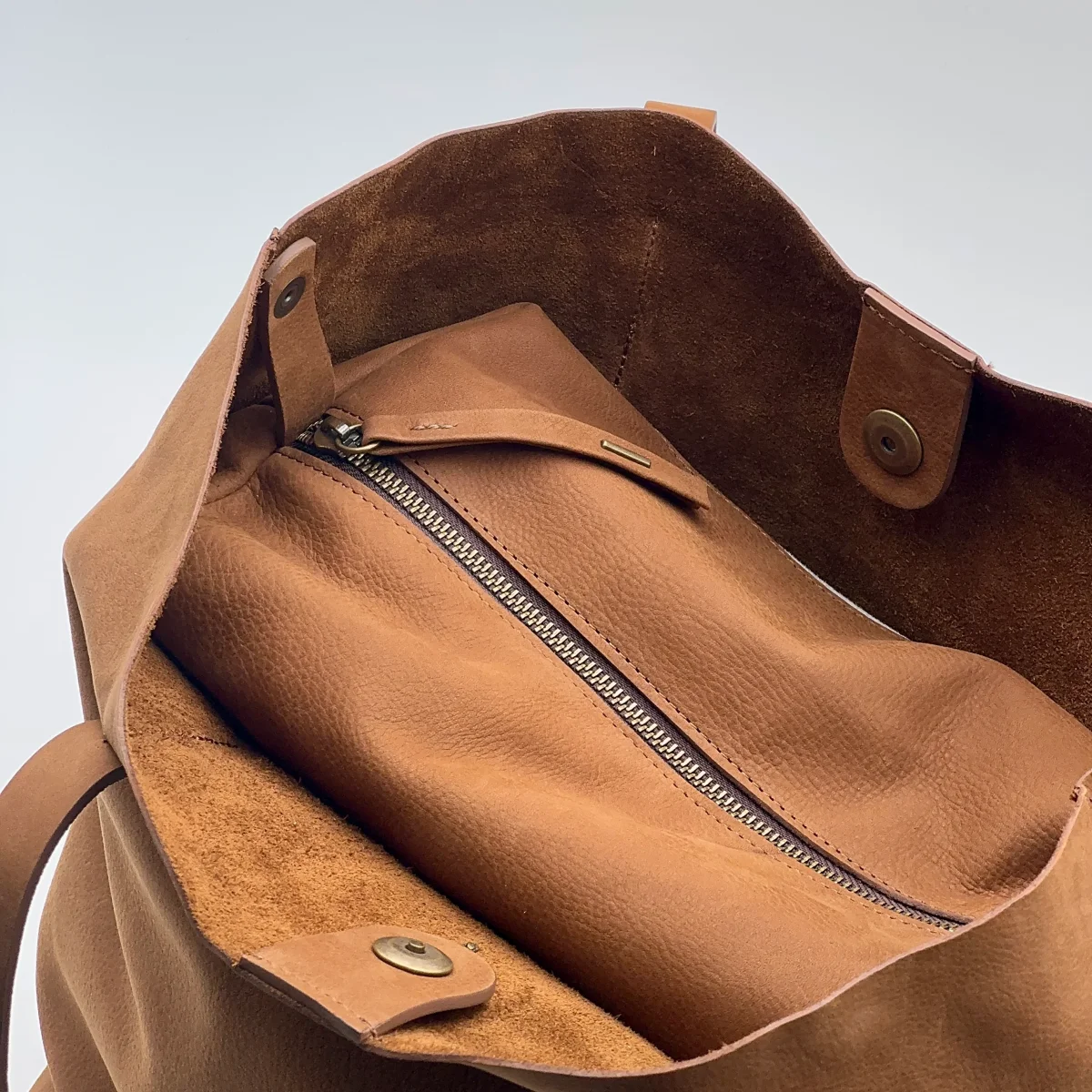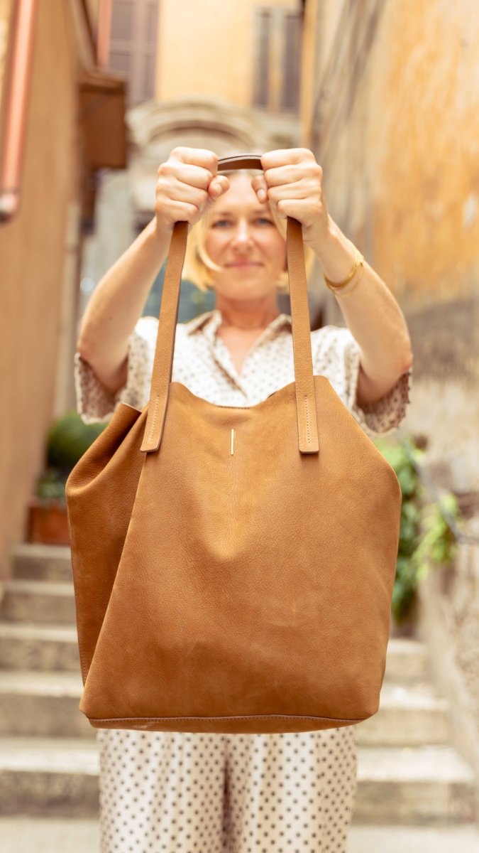 Una Shopper comoda e capiente con una borsa interna con zip che le dona struttura mantenendo la morbidezza.