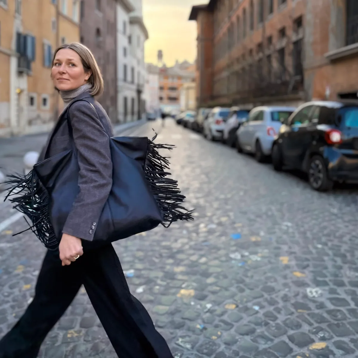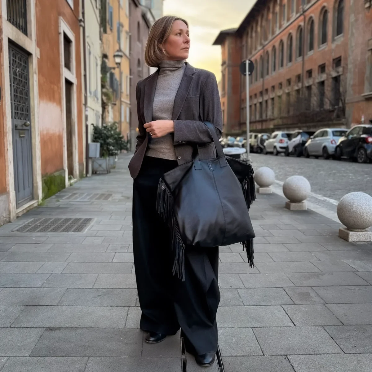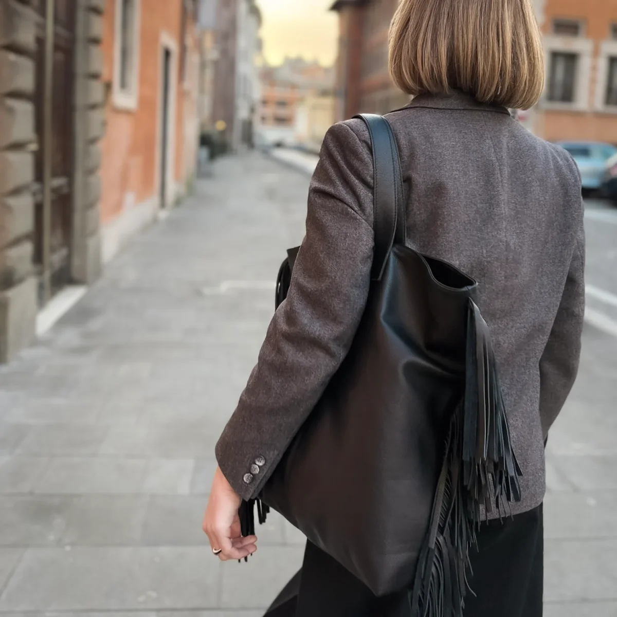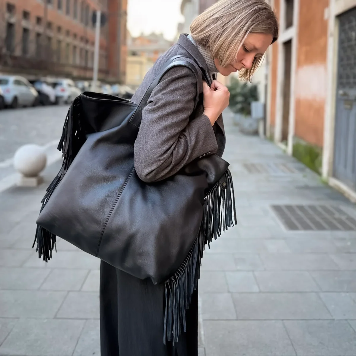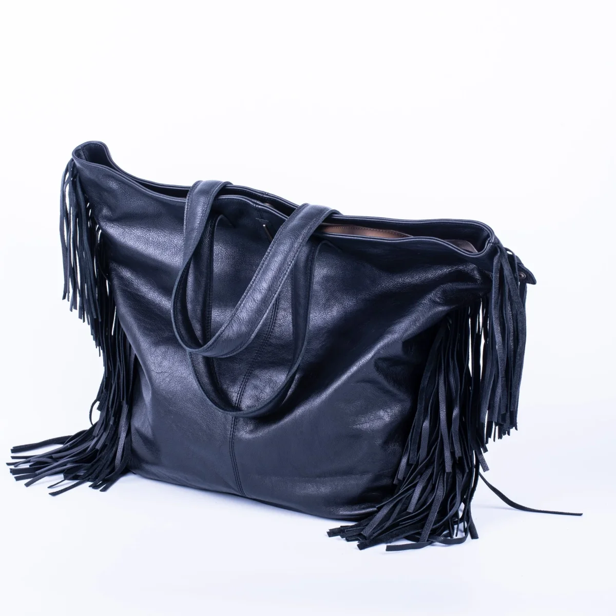 Borsa a spalla con frange mousse nera. Amy è una tote in pelle “over size” arricchita da un unico elemento senza tempo: le frange inserite lungo i fianchi.