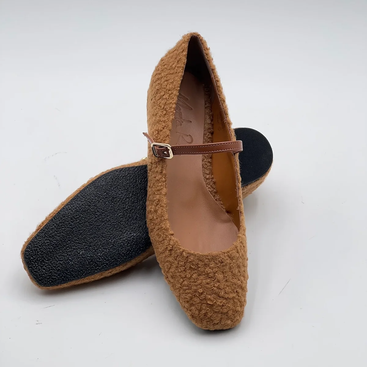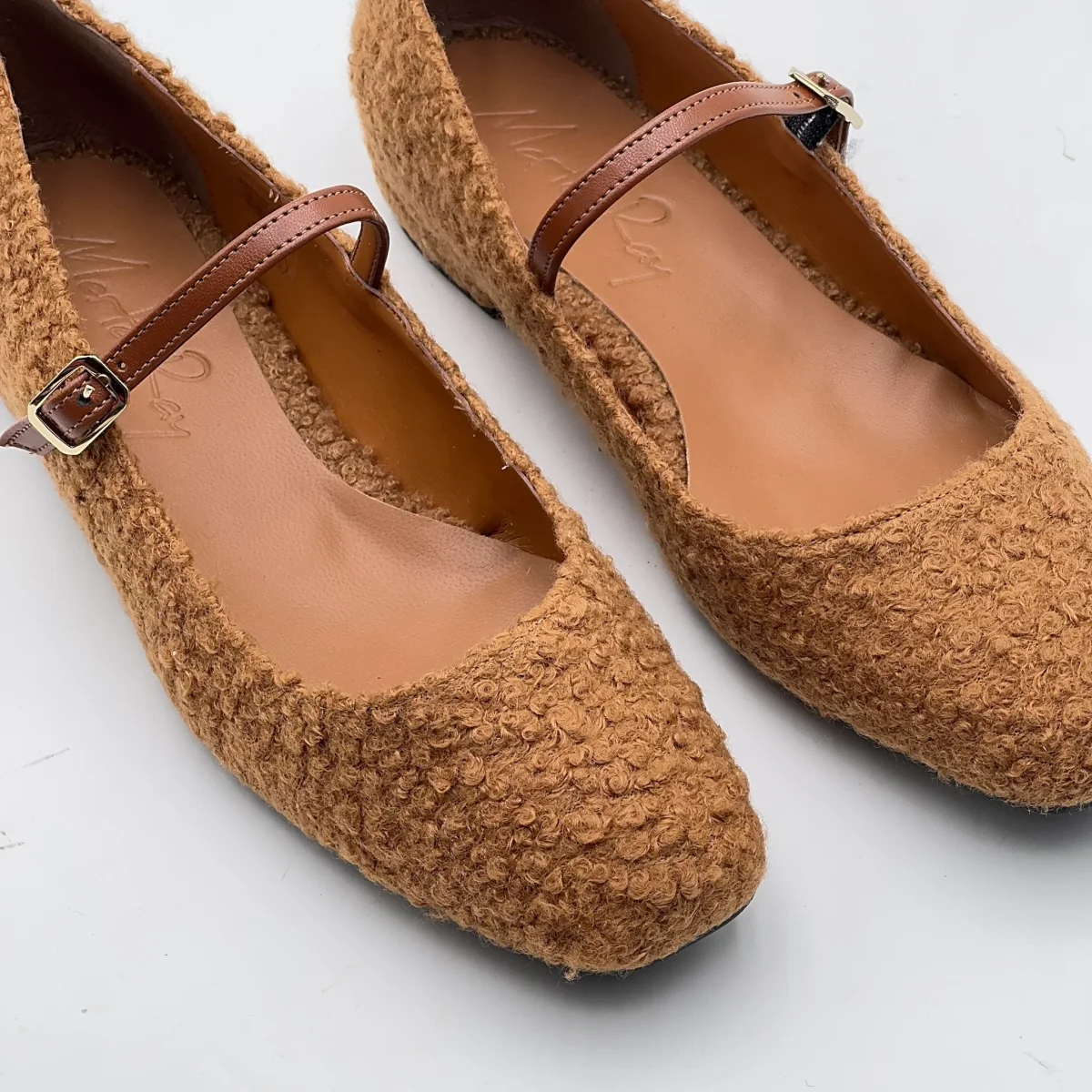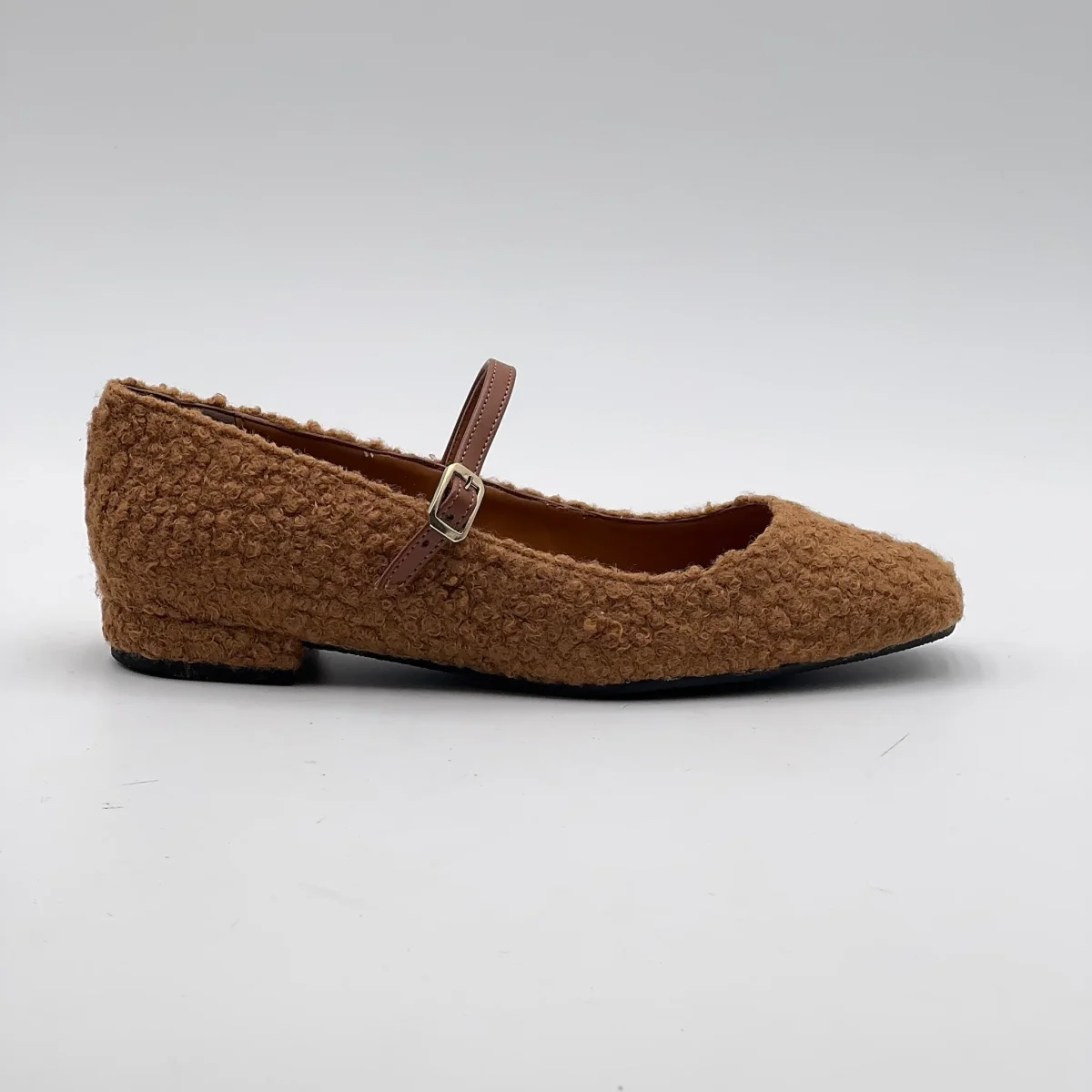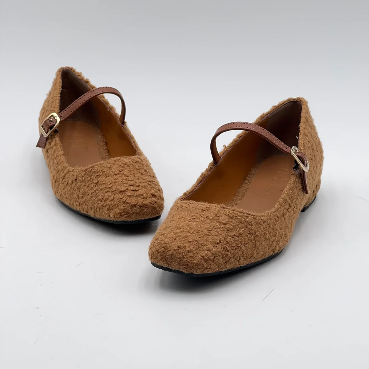 Le ballerine Arlene, in orsetto marrone, con il cinturino in pelle.