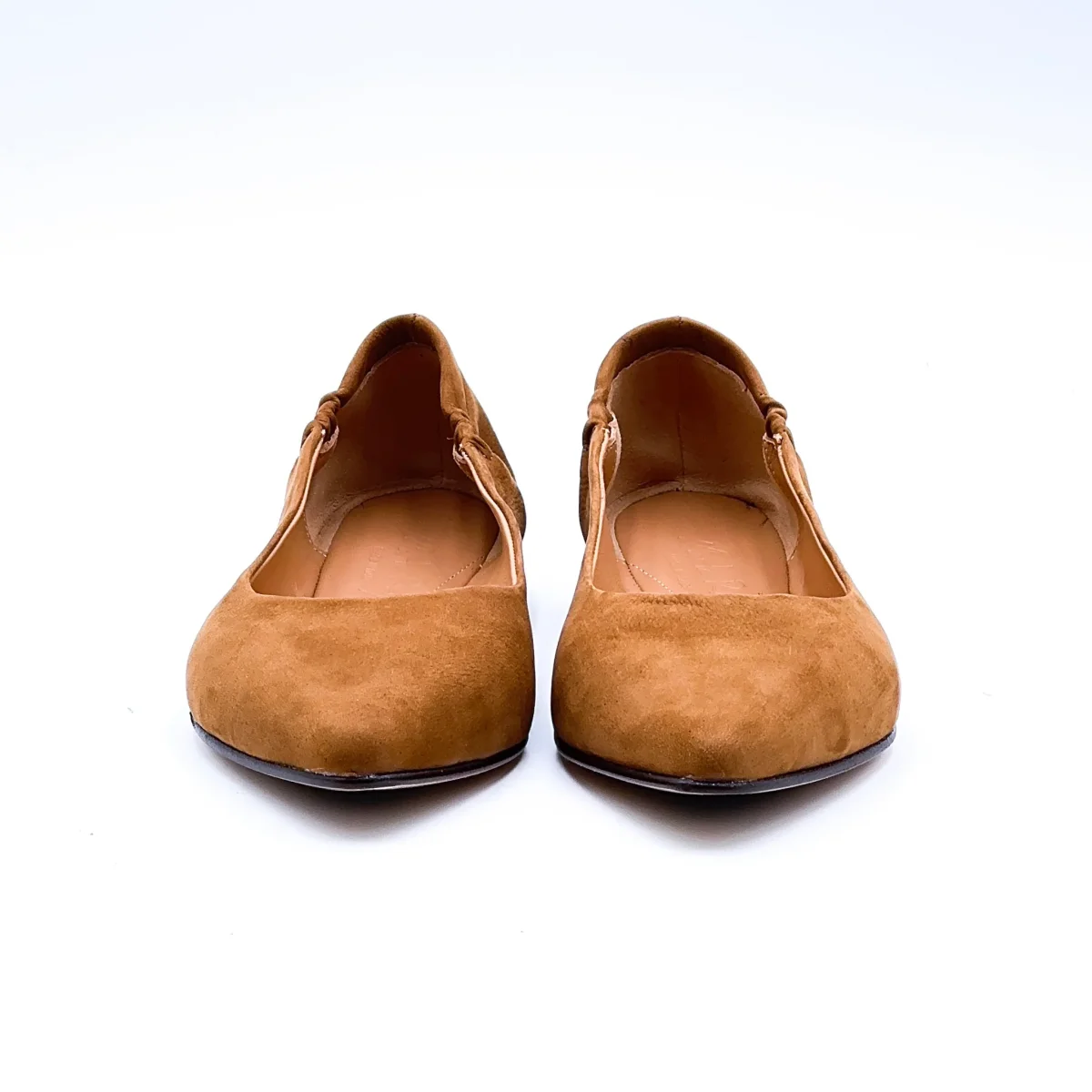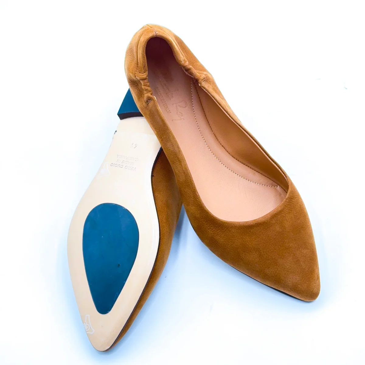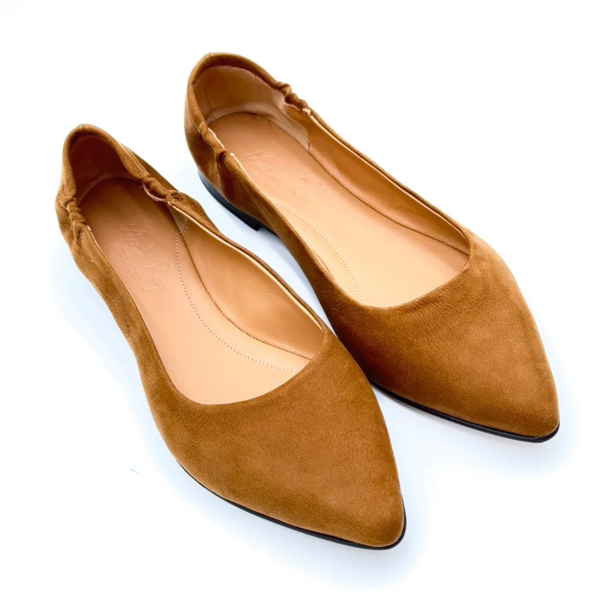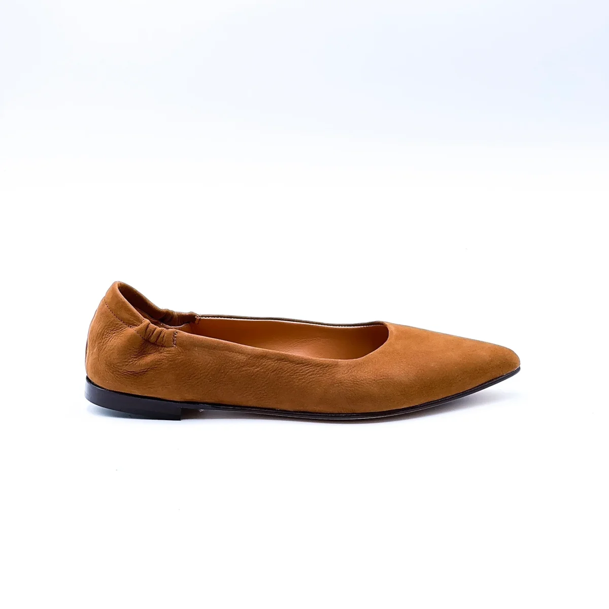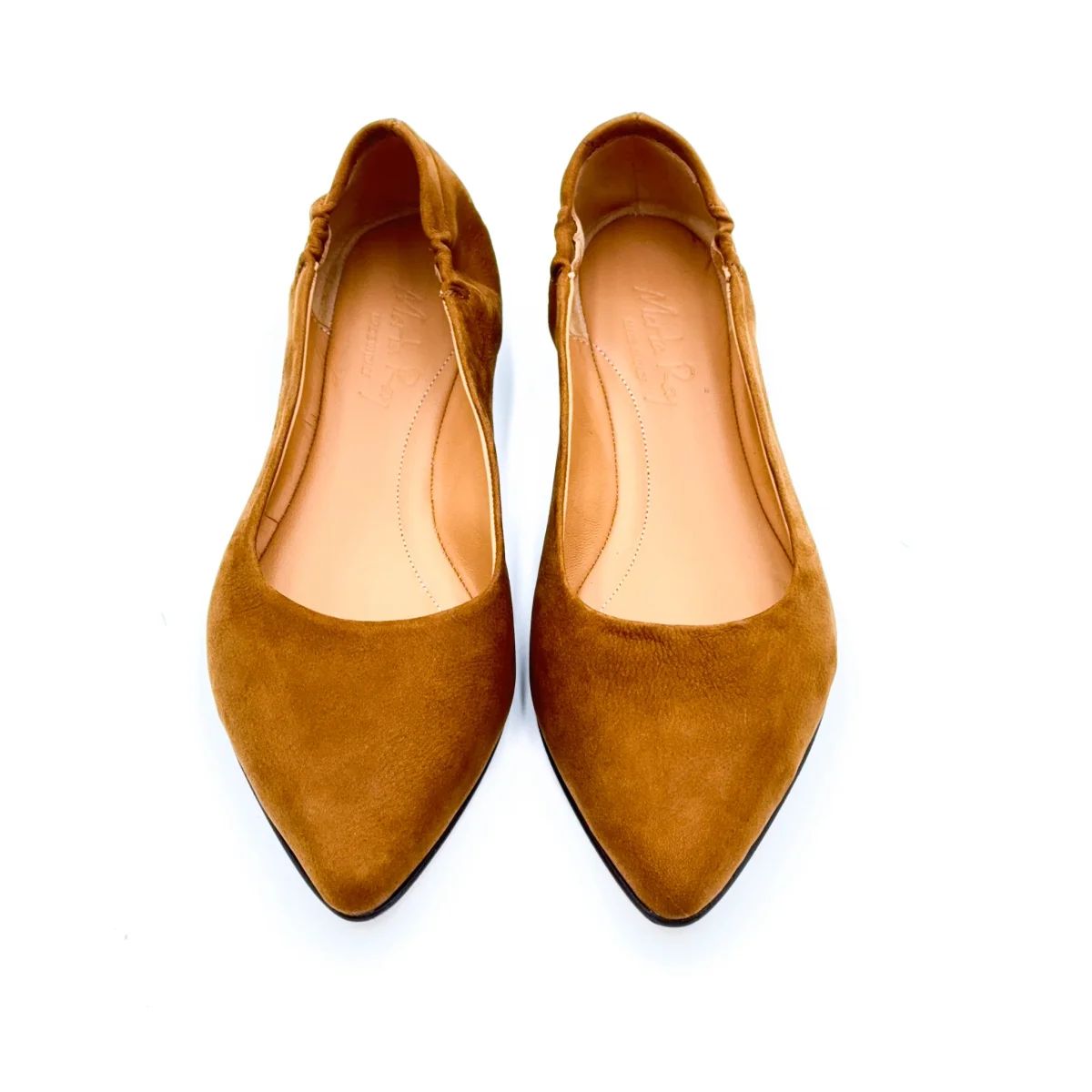 Ballerina a punta gentile in pelle Long Beach color caramello, realizzata a mano con costruzione a sacchetto per garantire flessibilità e comfort. L’elastico al tallone assicura stabilità nella calzata.