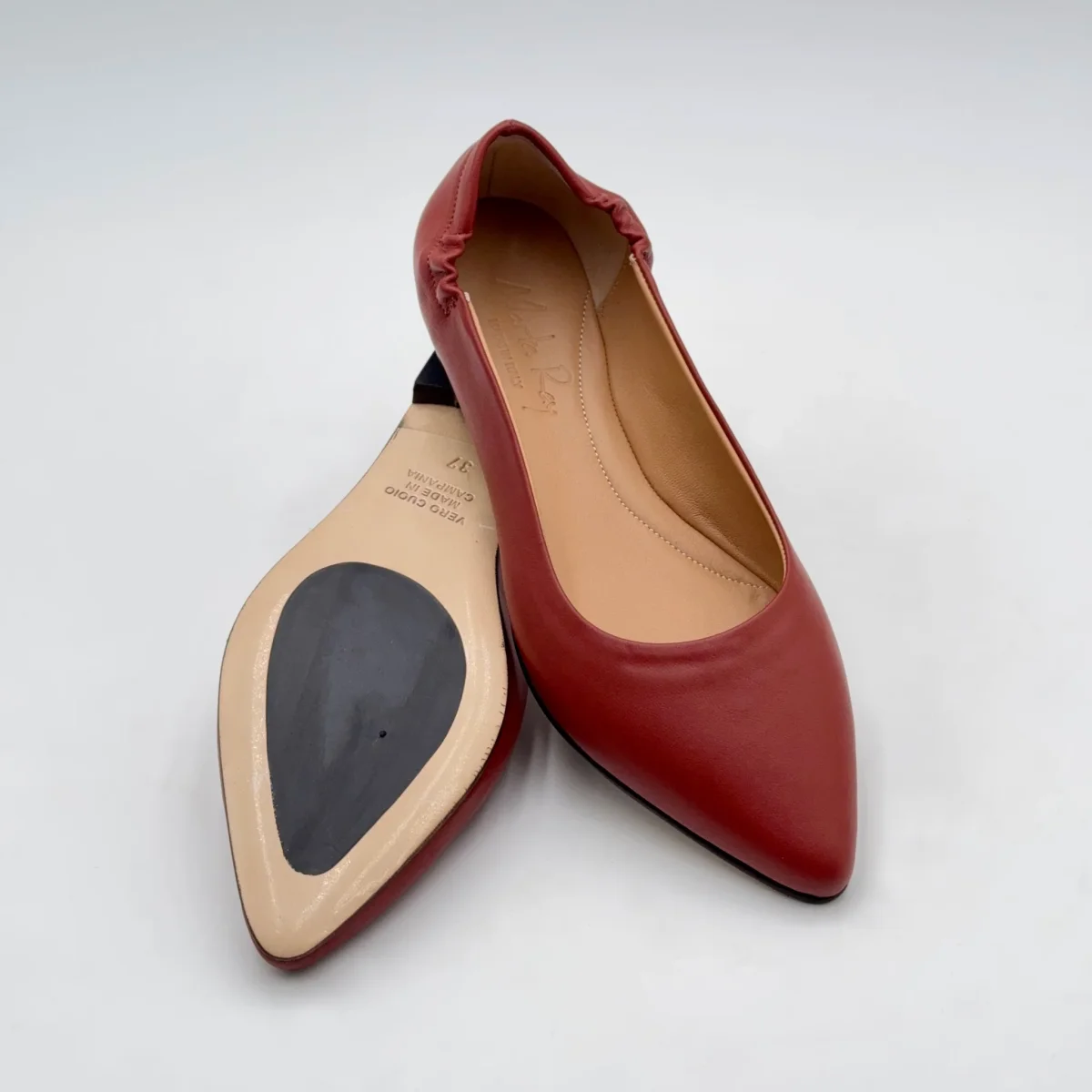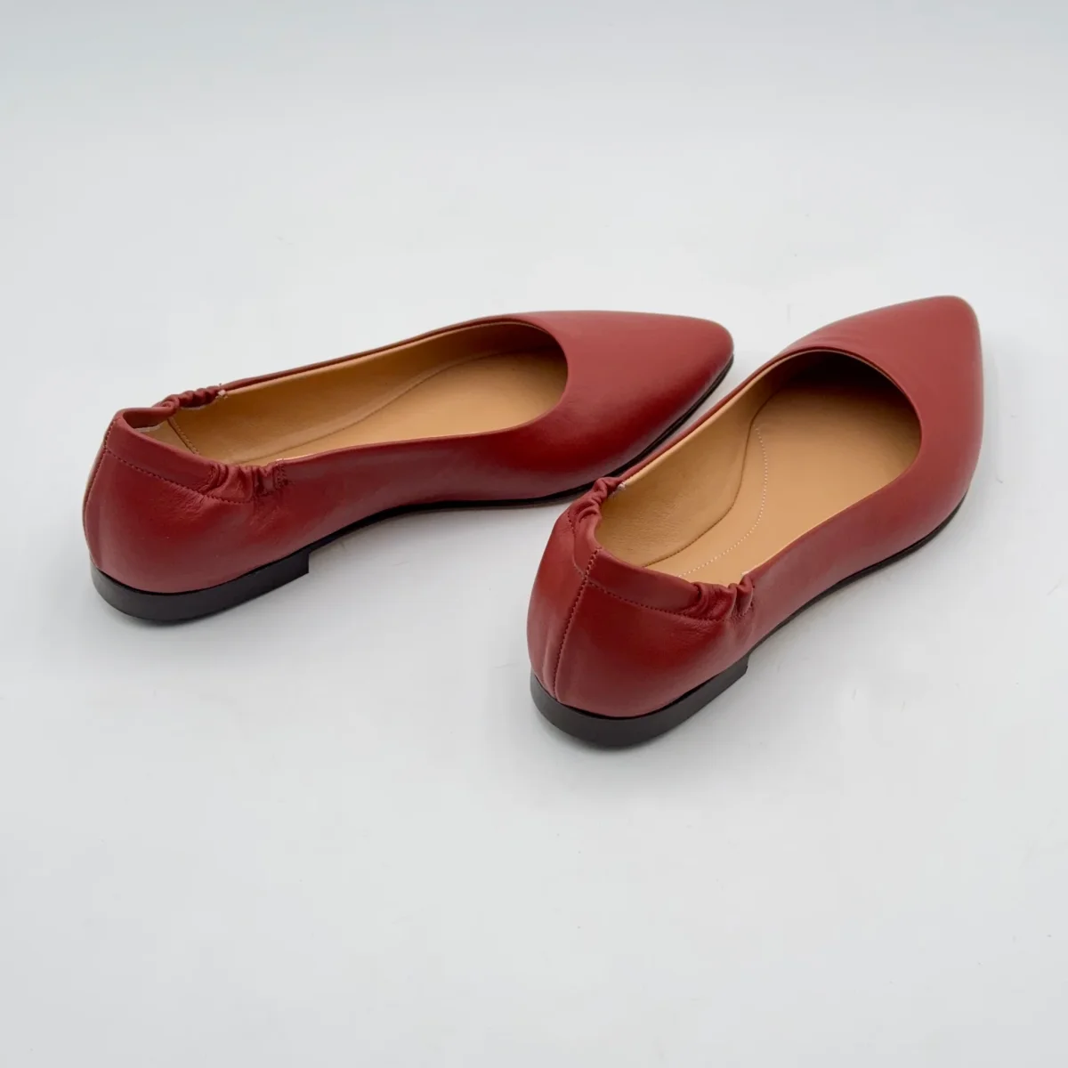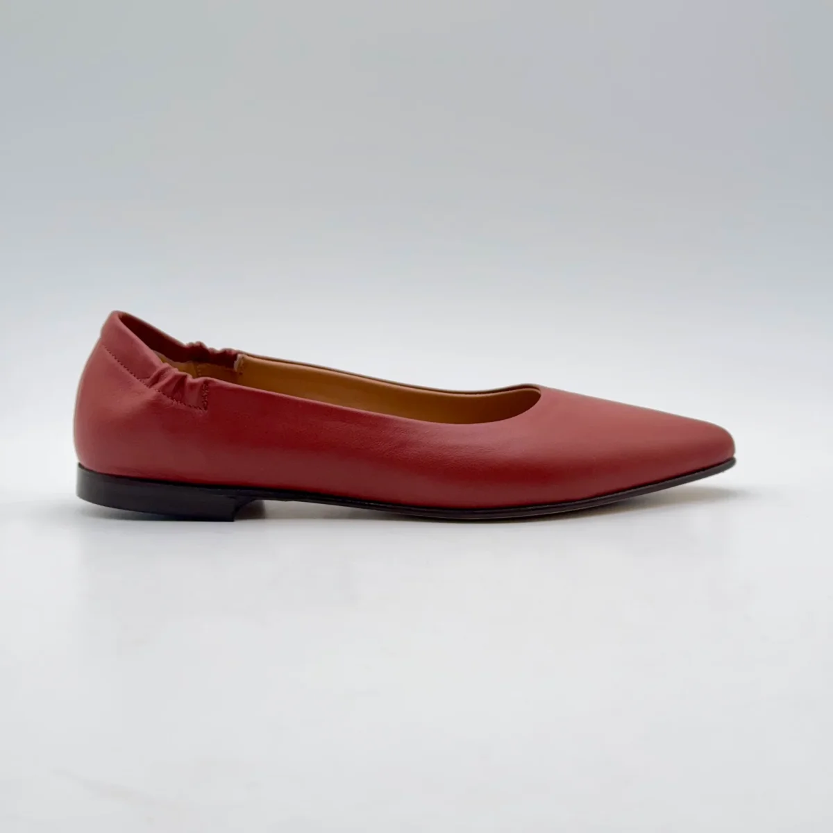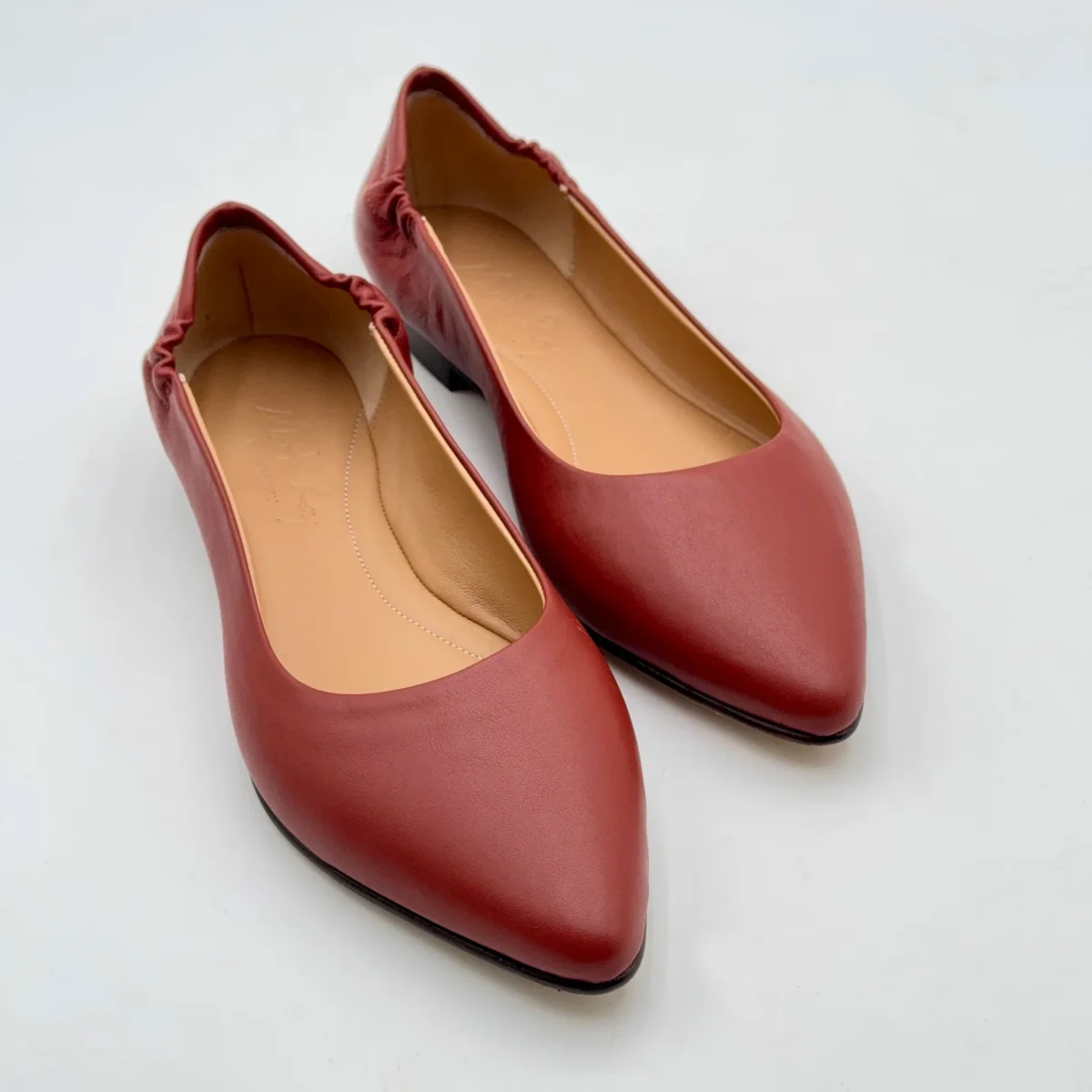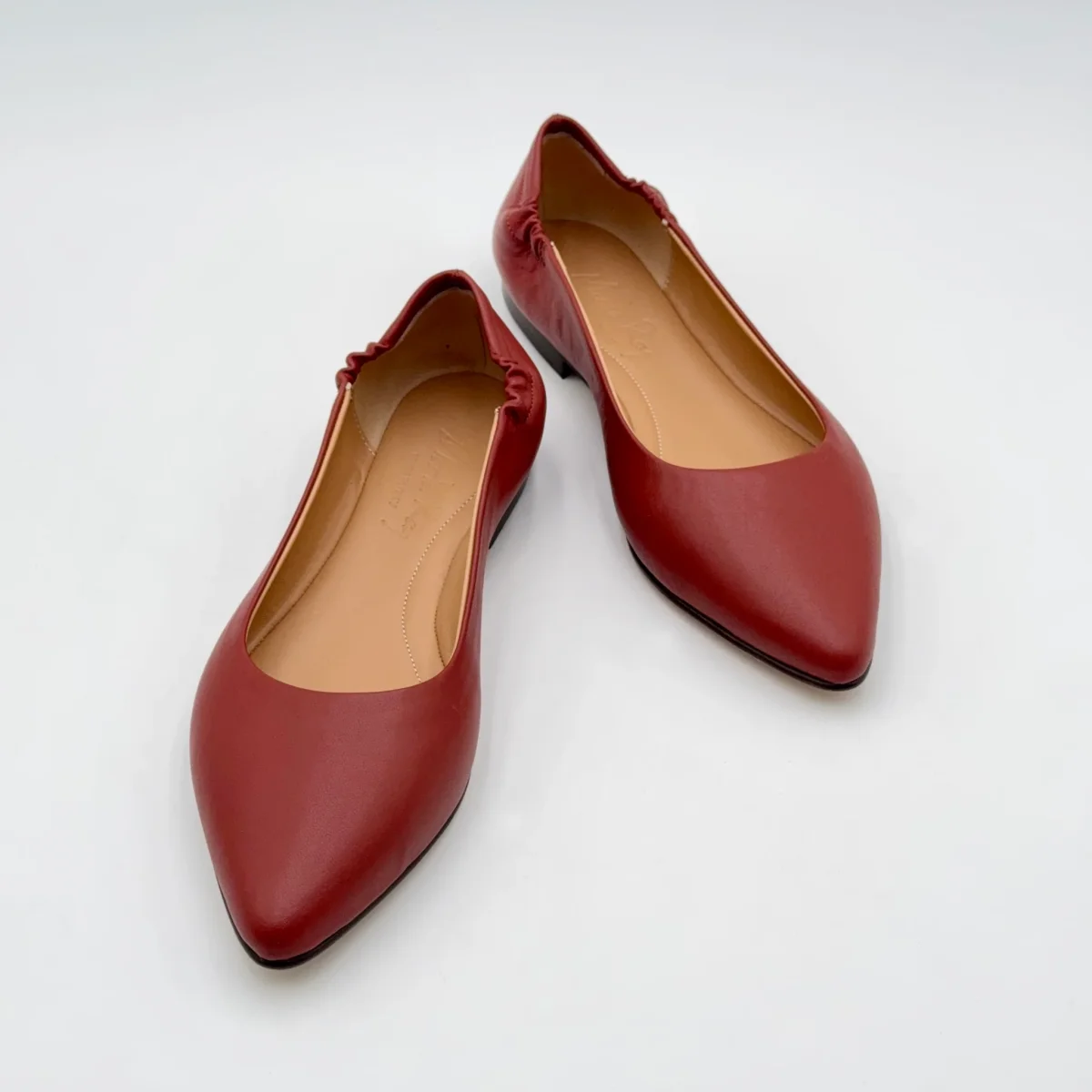 Ballerina a punta gentile in pelle mousse cuoio inglese, realizzata a mano con costruzione a sacchetto per garantire flessibilità e comfort. L’elastico al tallone assicura stabilità nella calzata.