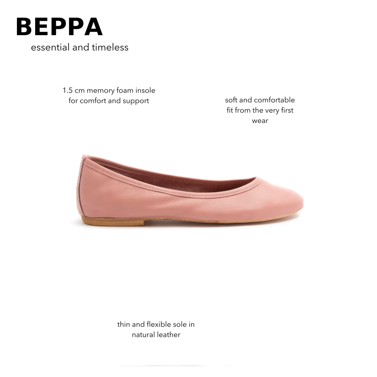 Ballerina a punta tonda realizzata in morbida pelle Mousse color confetto. Sfoderata, essenziale ed elegante, è dotata di alzatina in memory foam per un sostegno ergonomico.Sottopiede in pelle tono su tono, fondo in vero cuoio.