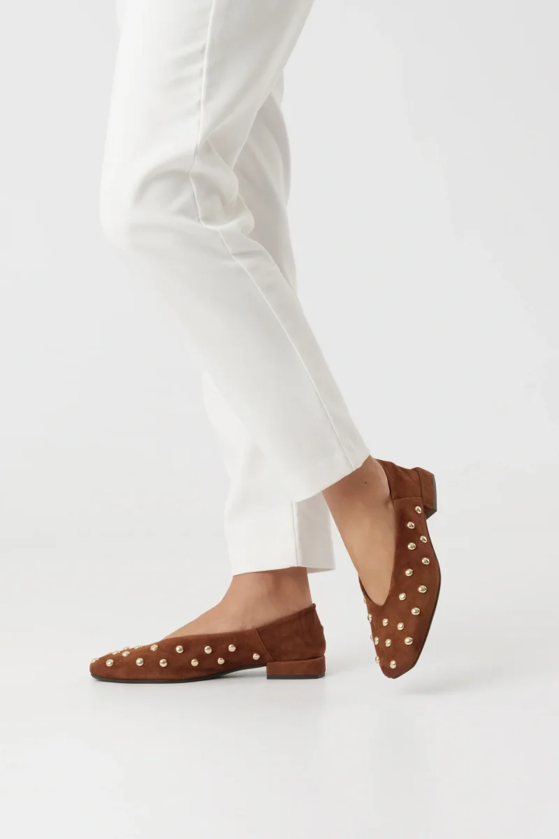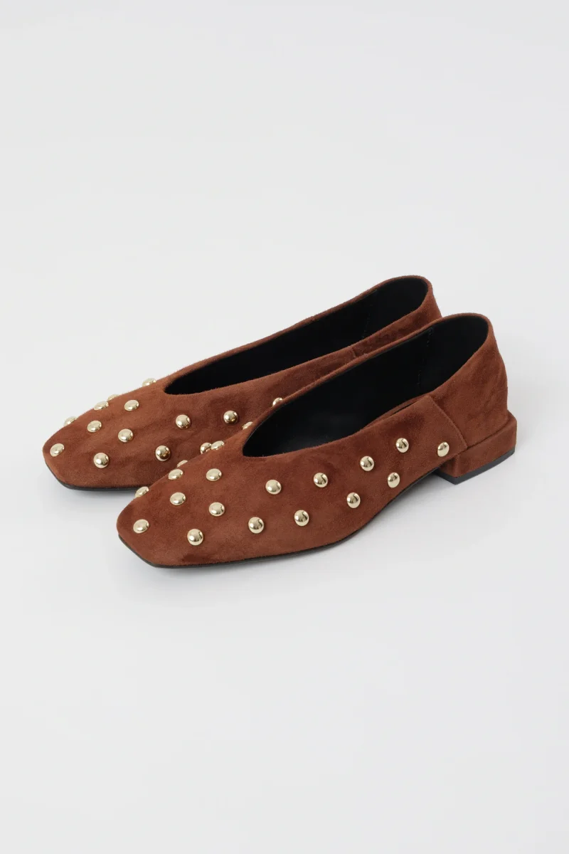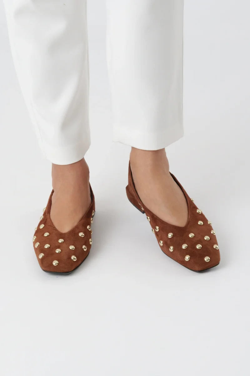 Ballerina donna in camoscio cognac con borchie oro, punta quadrata e tacco 2 cm