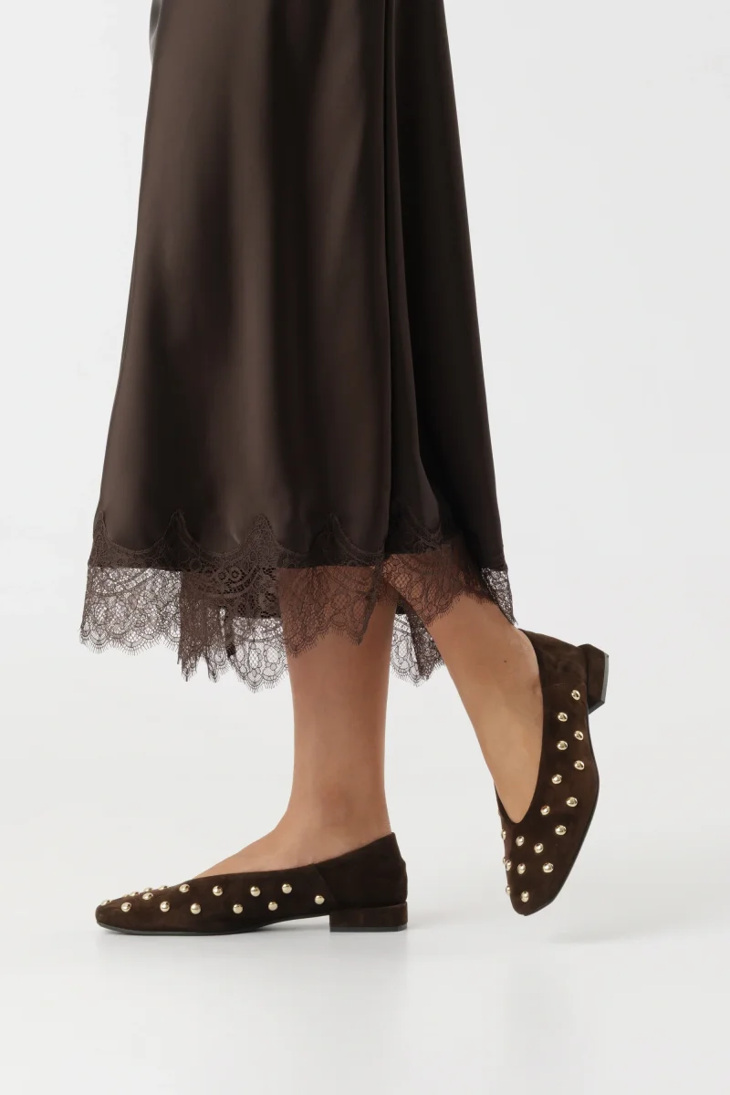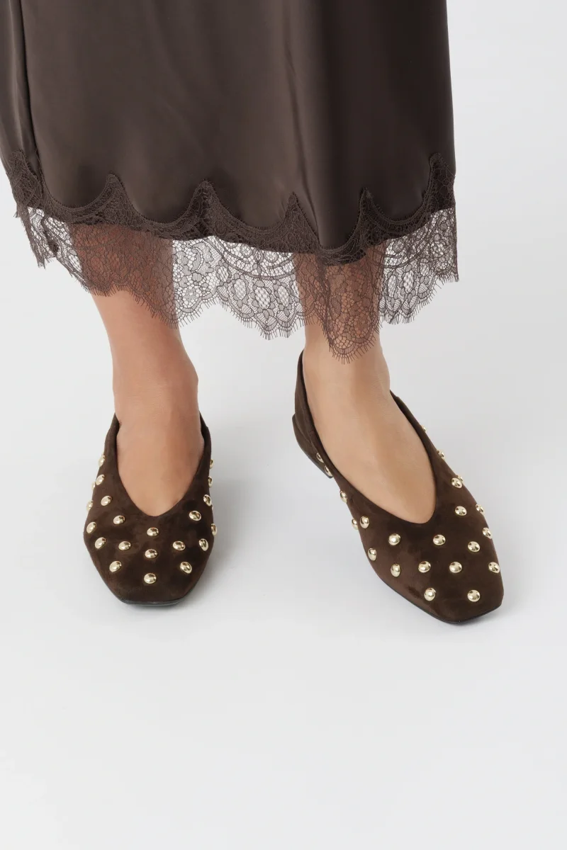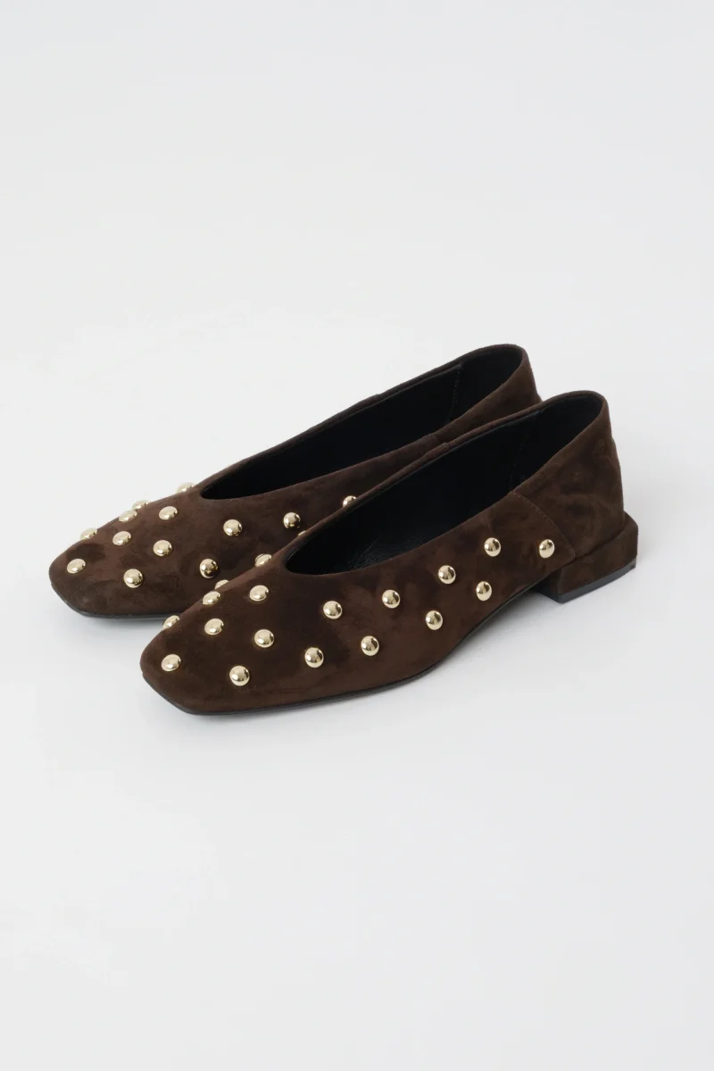 Ballerina donna in camoscio testa di moro con borchie oro, punta quadrata e tacco 2 cm