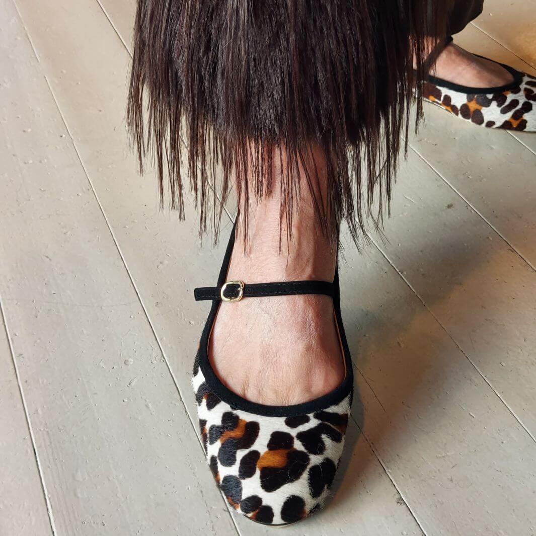 Le ballerine hanno la tomaia in pelle stampa animalier con una base bianca.