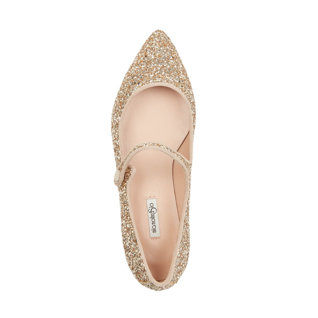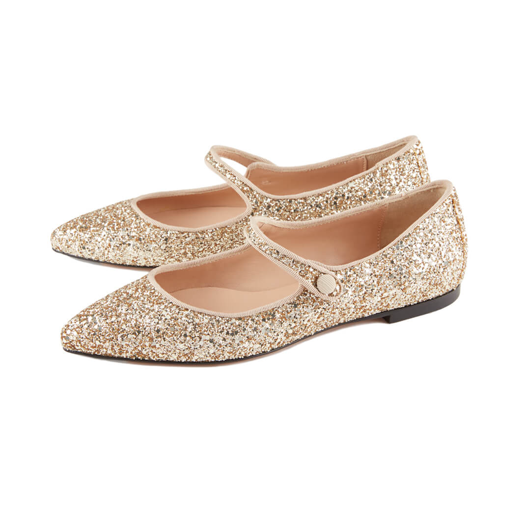 Fatte a mano in Italia sono ballerine a punta in glitter color oro. A rendere più romantiche le ballerine un laccetto elasticizzato che facilita la calzabilità.