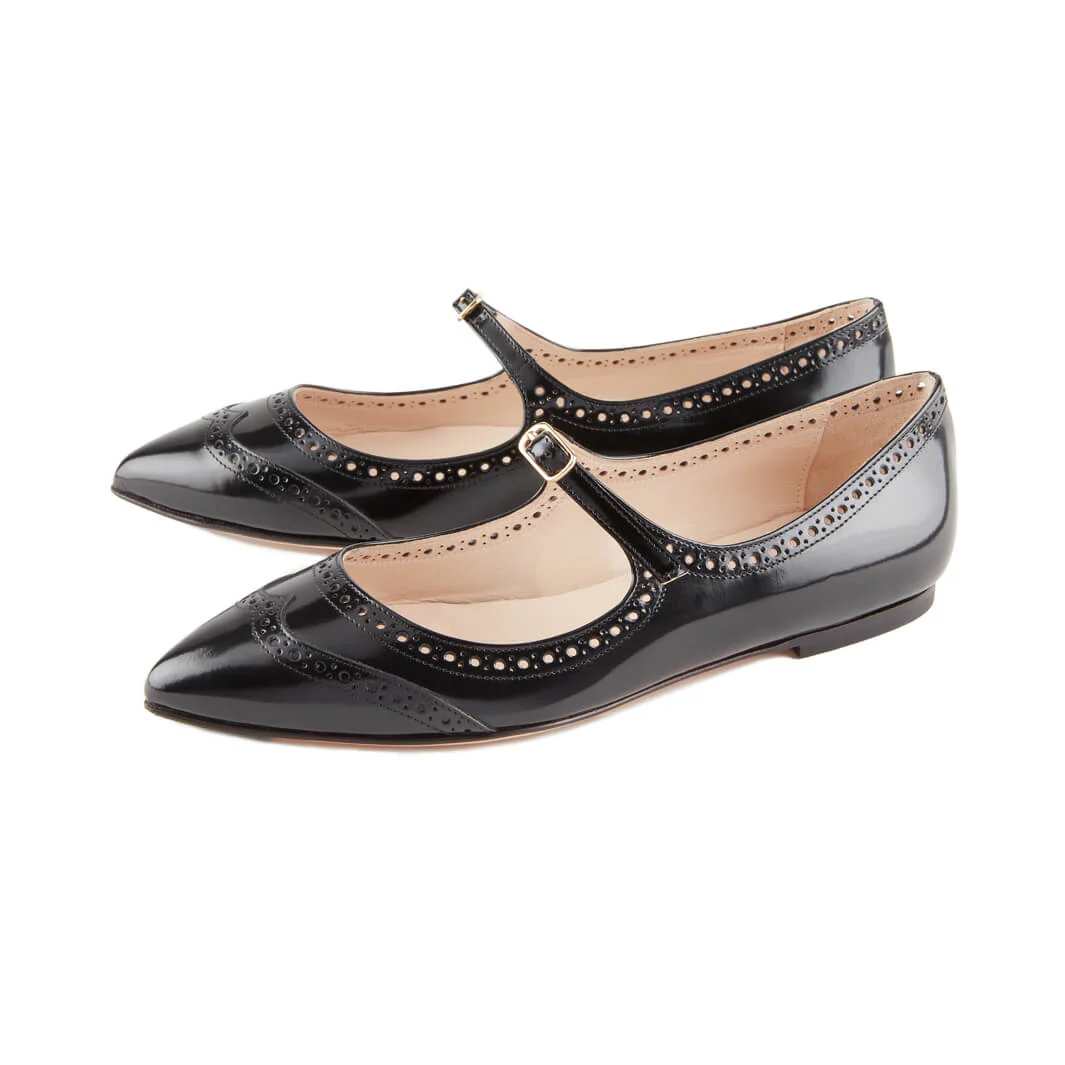 Fatte a mano in Italia, le ballerine in pelle nera a punta hanno un disegno a coda di rondine. A rendere romantiche le ballerine un laccetto regolabile.