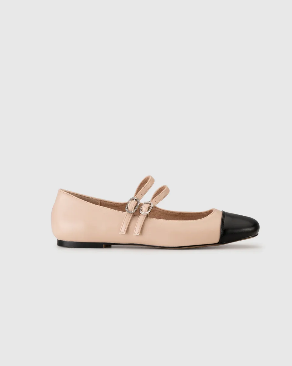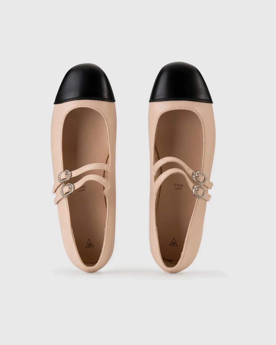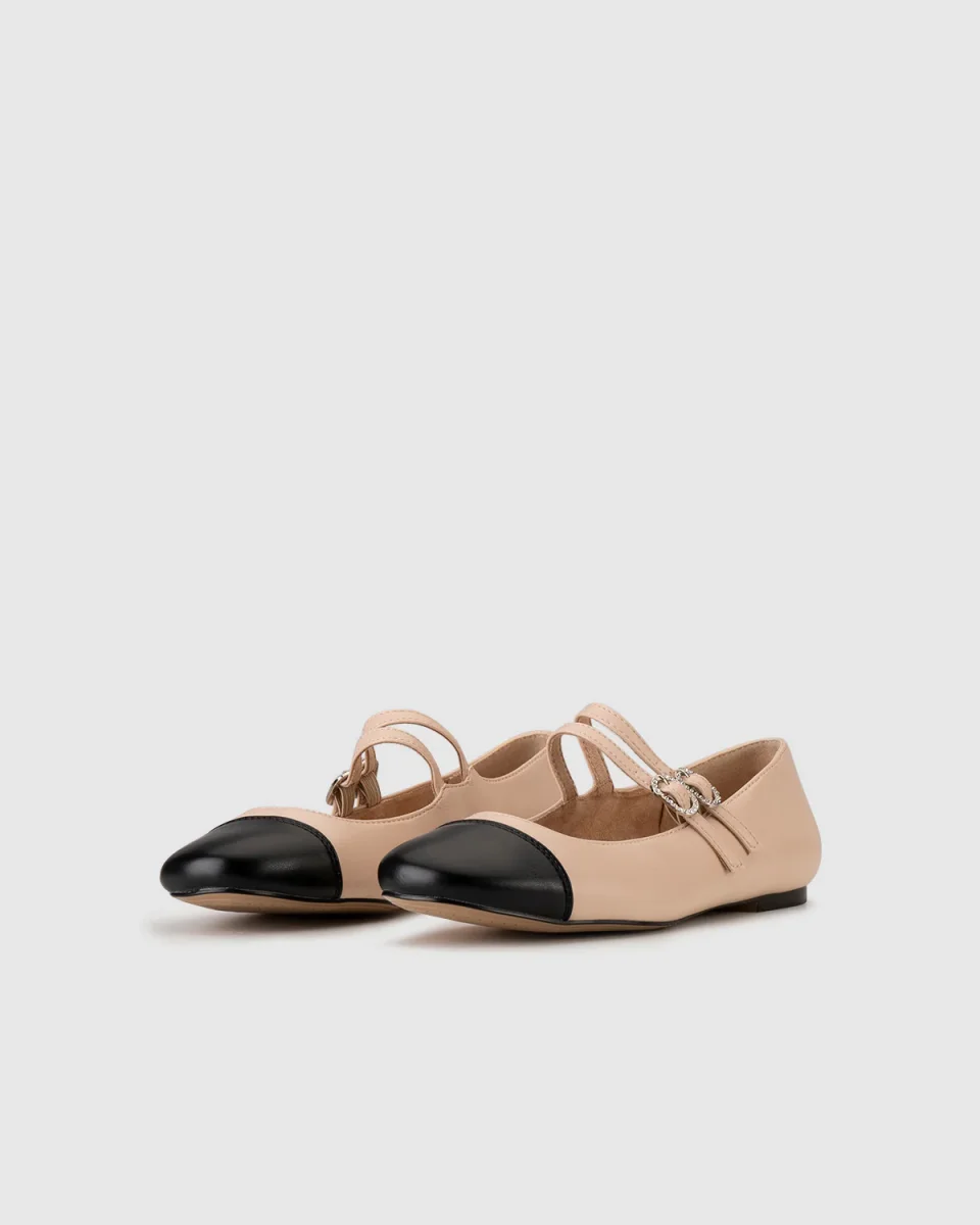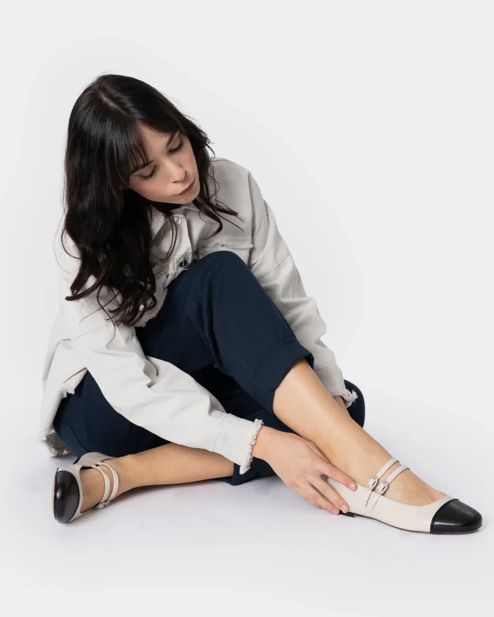 Un’elegante reinterpretazione delle ballerine classiche, queste scarpe uniscono fascino retrò e stile contemporaneo. Le doppie cinturine sottili con fibbie gioiello donano un tocco ricercato e femminile, mentre la punta in contrasto regala un look sofisticato e senza tempo. La linea pulita e la forma delicata le rendono perfette per chi cerca uno stile sobrio ma distintivo. Ideali per accompagnarti con eleganza dal mattino alla sera, senza rinunciare al comfort.