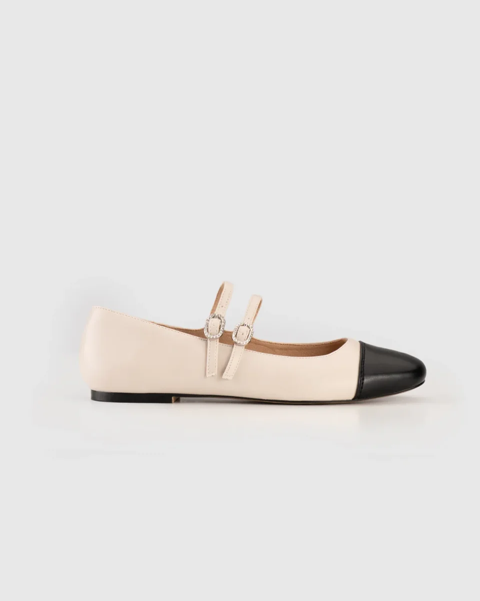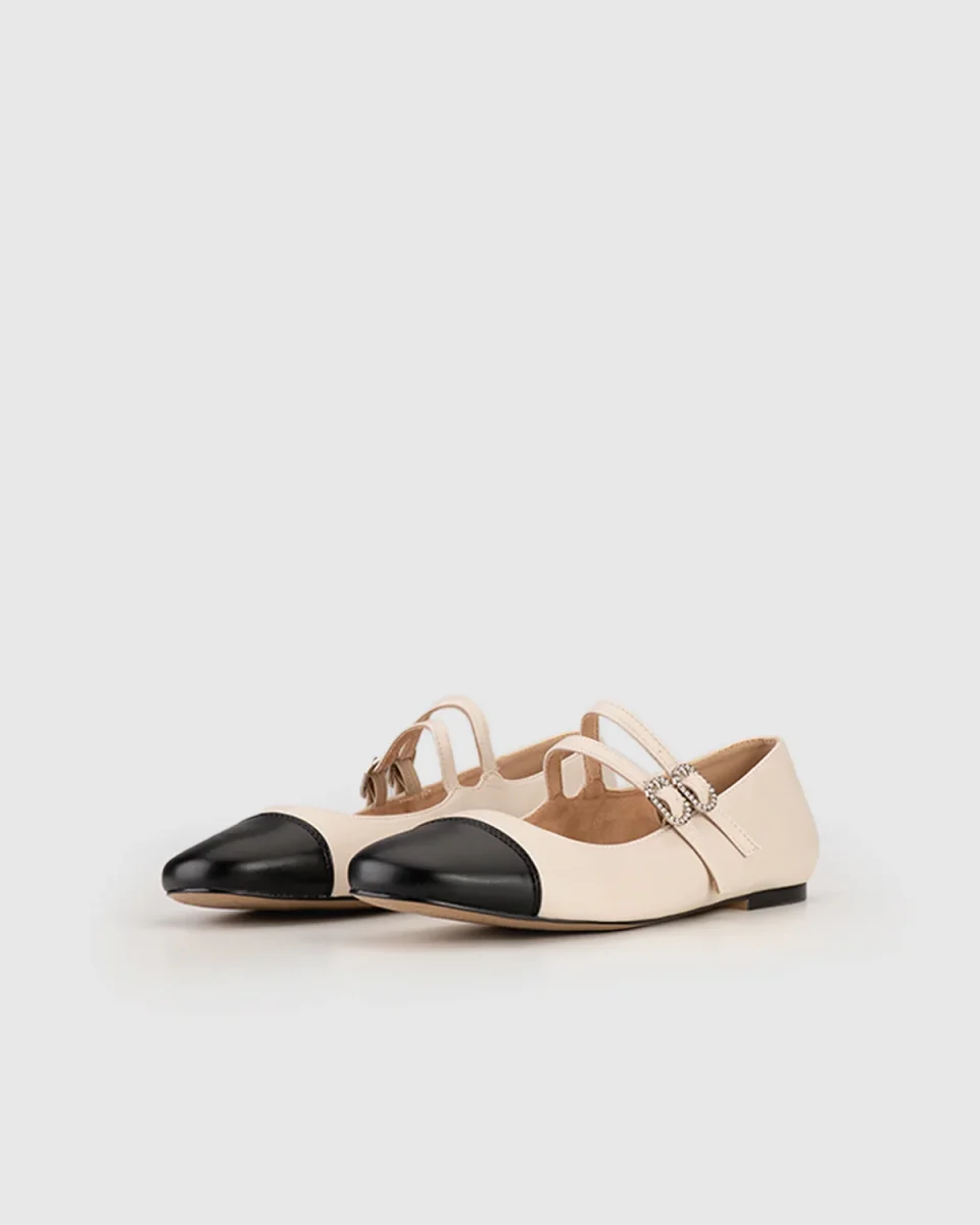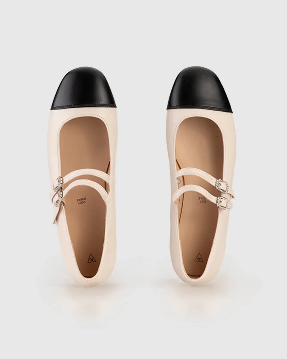Un’elegante reinterpretazione delle ballerine classiche, queste scarpe uniscono fascino retrò e stile contemporaneo. Le doppie cinturine sottili con fibbie gioiello donano un tocco ricercato e femminile, mentre la punta in contrasto regala un look sofisticato e senza tempo. La linea pulita e la forma delicata le rendono perfette per chi cerca uno stile sobrio ma distintivo. Ideali per accompagnarti con eleganza dal mattino alla sera, senza rinunciare al comfort.