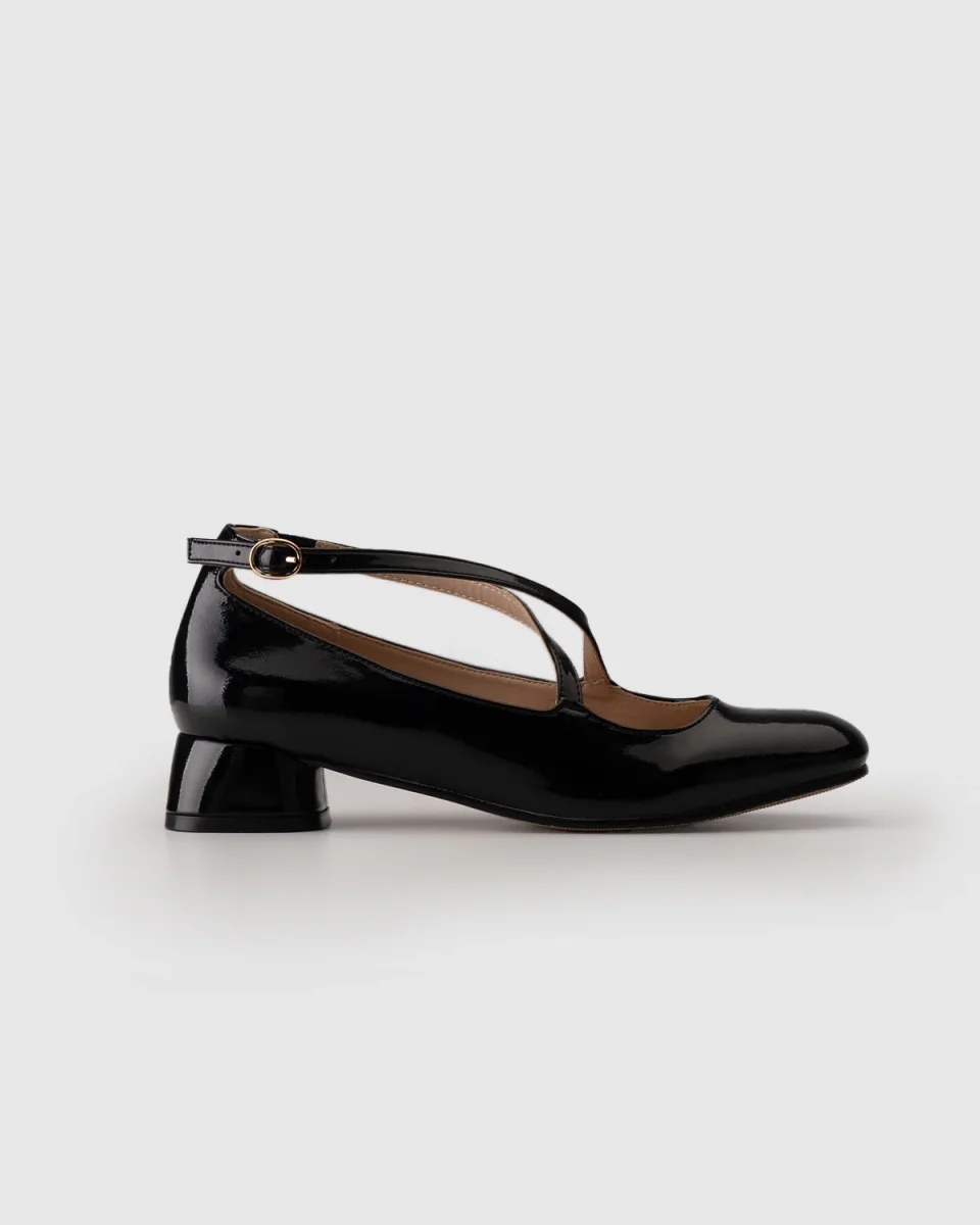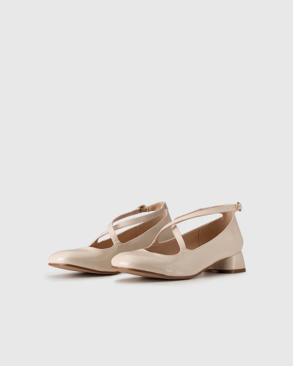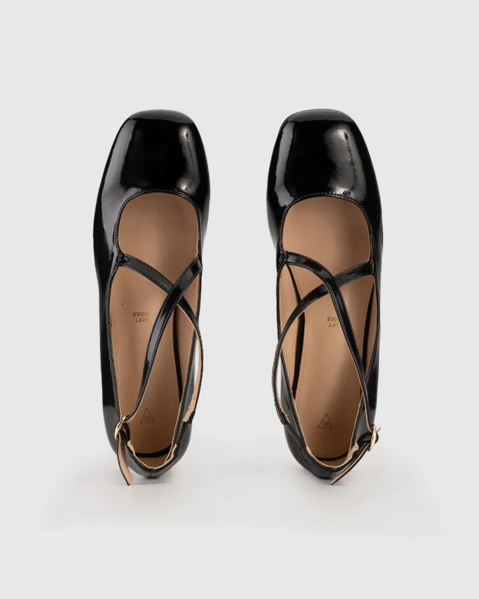 Lasciati conquistare dall’eleganza raffinata di queste ballerine in ecopelle verniciata, perfette per aggiungere un tocco chic a ogni tuo look quotidiano o da cerimonia. Il design femminile con cinturino incrociato sul collo del piede dona un’allure romantica e delicata, mentre la chiusura con fibbia regolabile alla caviglia assicura una calzata stabile e confortevole.