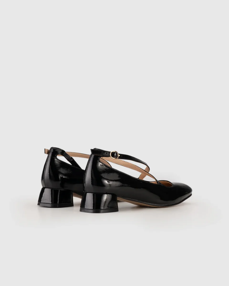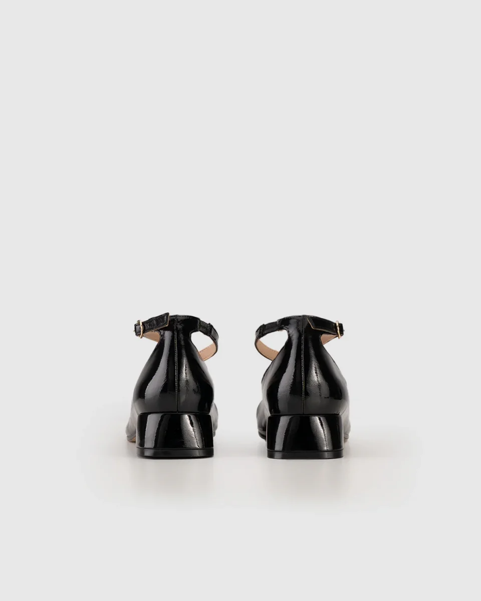 La tomaia in ecopelle lucida cattura la luce con discrezione, rendendo queste scarpe ideali sia per il giorno che per la sera. Il tacco basso a rocchetto garantisce comfort per tutta la giornata senza rinunciare allo stile, rendendole perfette per chi cerca eleganza e praticità.