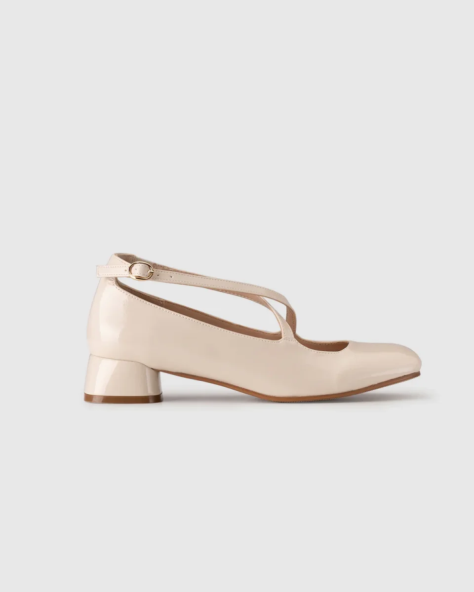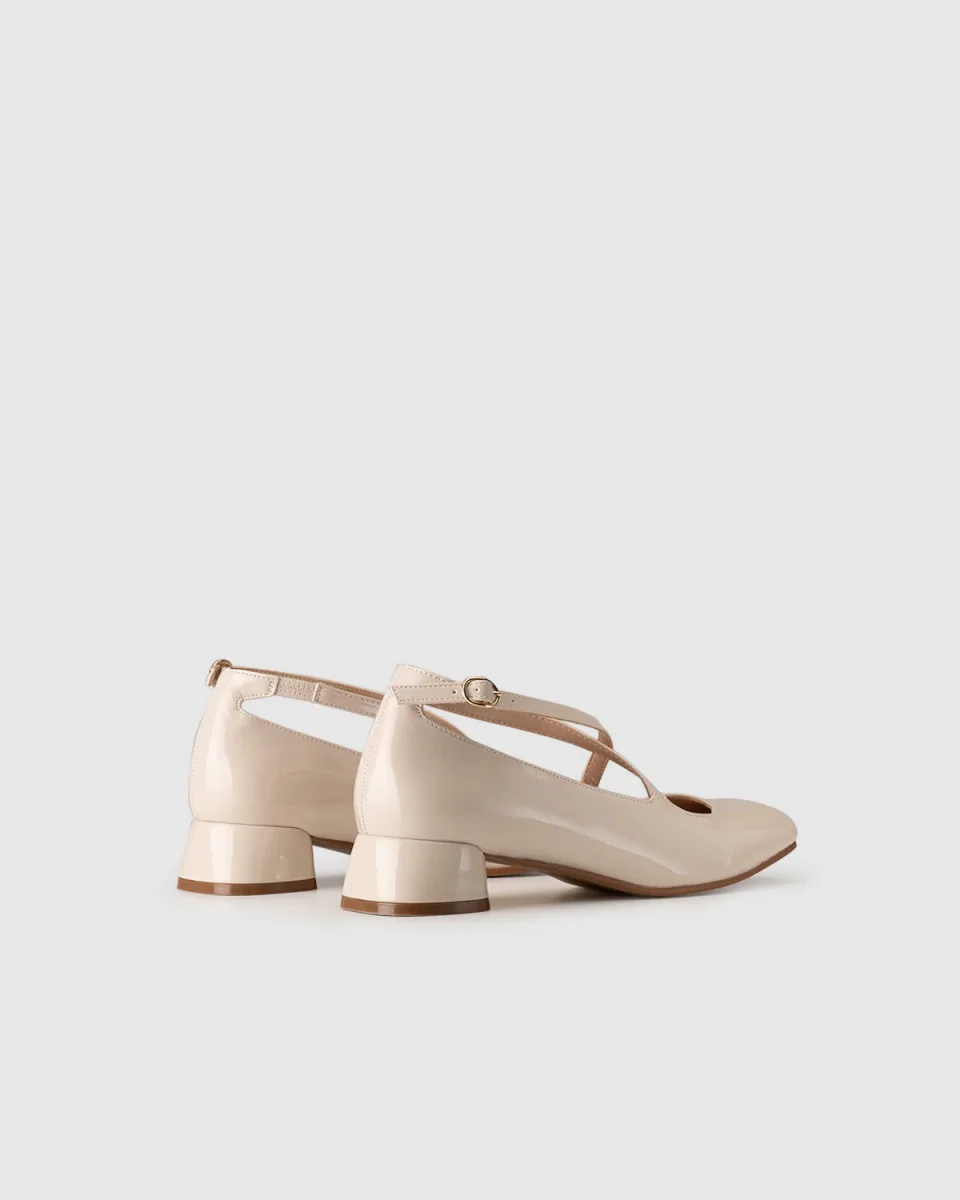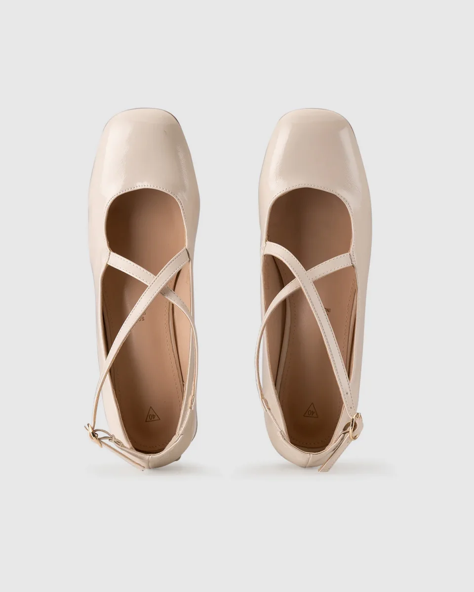 Lasciati conquistare dall’eleganza raffinata di queste ballerine in ecopelle verniciata, perfette per aggiungere un tocco chic a ogni tuo look quotidiano o da cerimonia. Il design femminile con cinturino incrociato sul collo del piede dona un’allure romantica e delicata, mentre la chiusura con fibbia regolabile alla caviglia assicura una calzata stabile e confortevole.