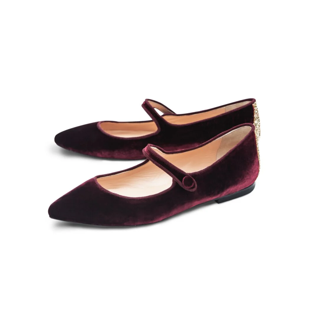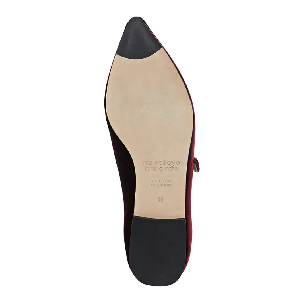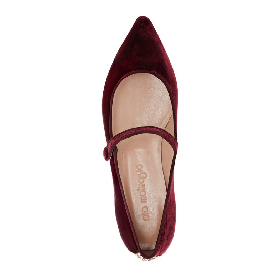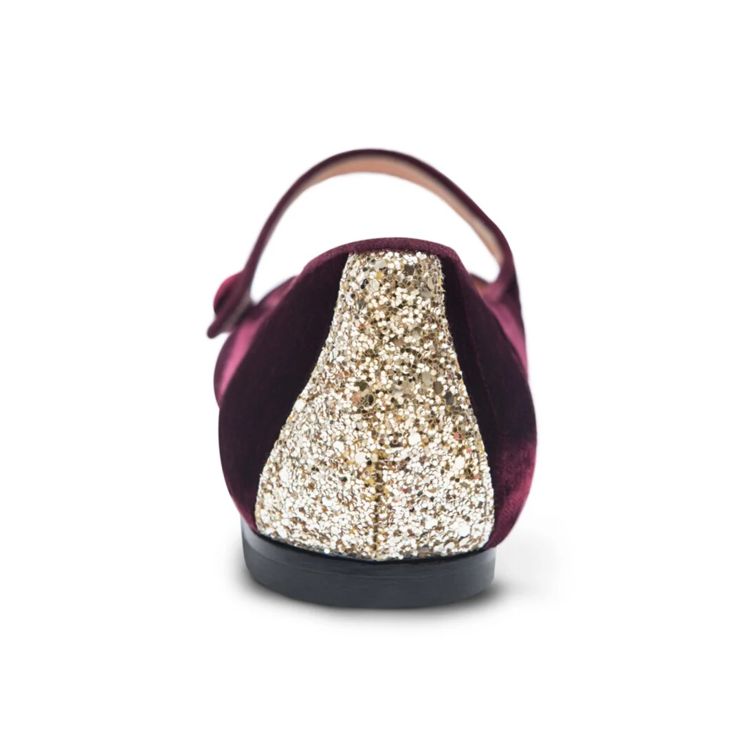 Fatte a mano in Italia, le ballerine in velluto a punta bordeaux sono caratterizzate da un inserto glitter oro sul tallone. A rendere romantiche le ballerine un laccetto elasticizzato che facilita la calzabilità. Abbinata alle ballerine una mini calza prodotta da Alto Milano per Mia Moltrasio.