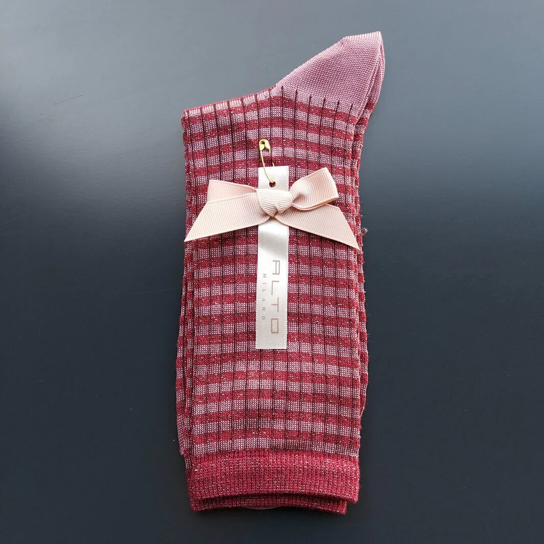 Calza inclusa: Shiny Velvet viene venduta abbinata ad una calza Alto Milano prodotta per Mia Moltrasio. In cotone e viscosa con inserti lurex, la mini calza è taglia unica, l’elasticità del tessuto consente una perfetta vestibilità per tutte le misure.