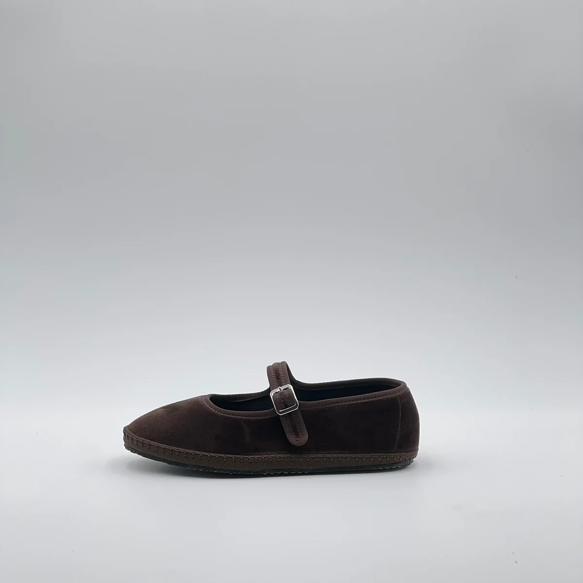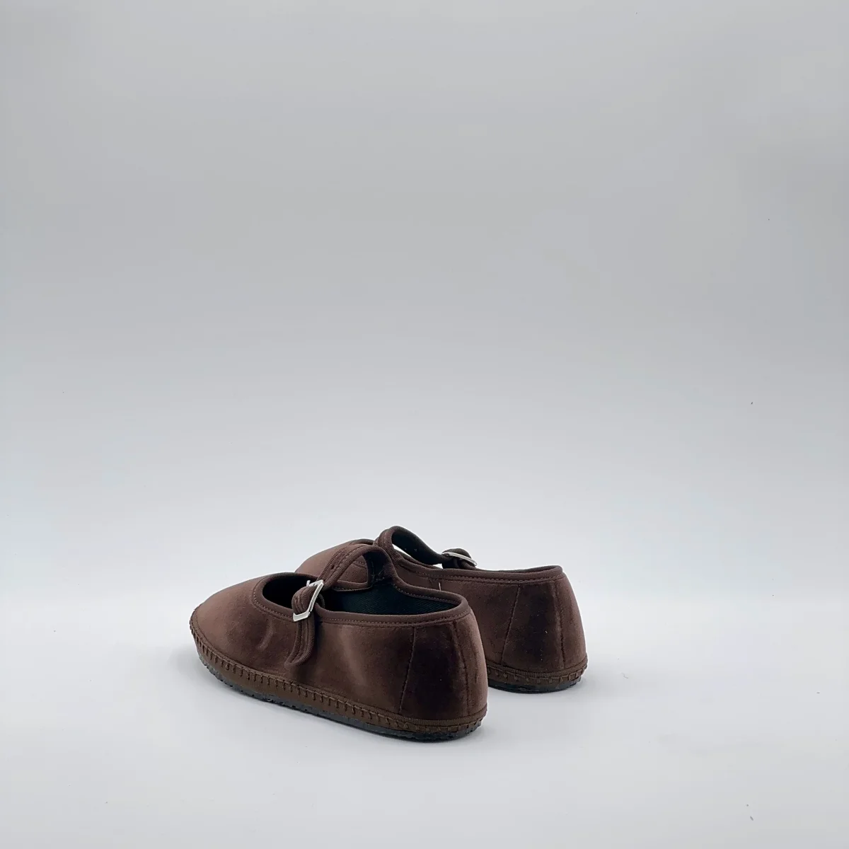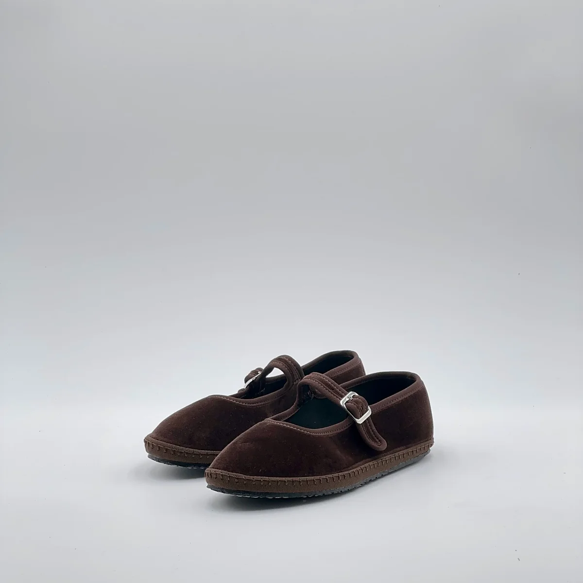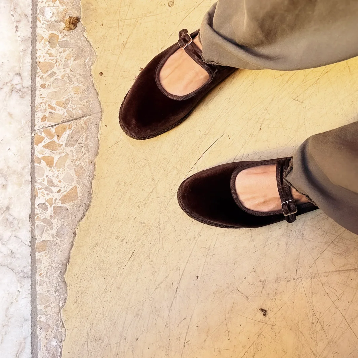 Friulana Mary Jane in velluto marrone, con interno in cotone nero e sottopiede in pelle. Chiusura con fibbia regolabile e suola in gomma cucita, comoda e resistente.Realizzata a mano secondo la tradizione friulana per uno stile essenziale e senza tempo.