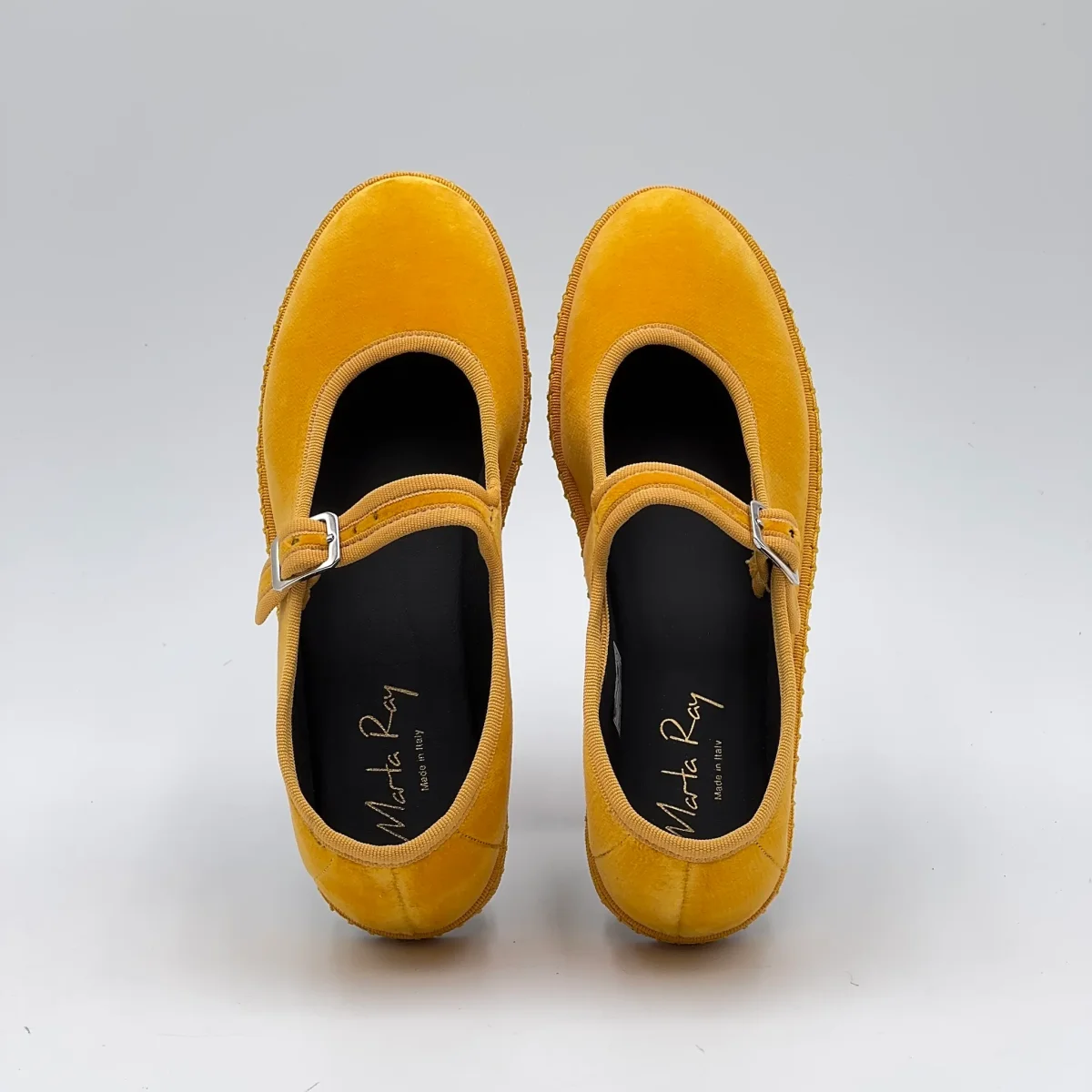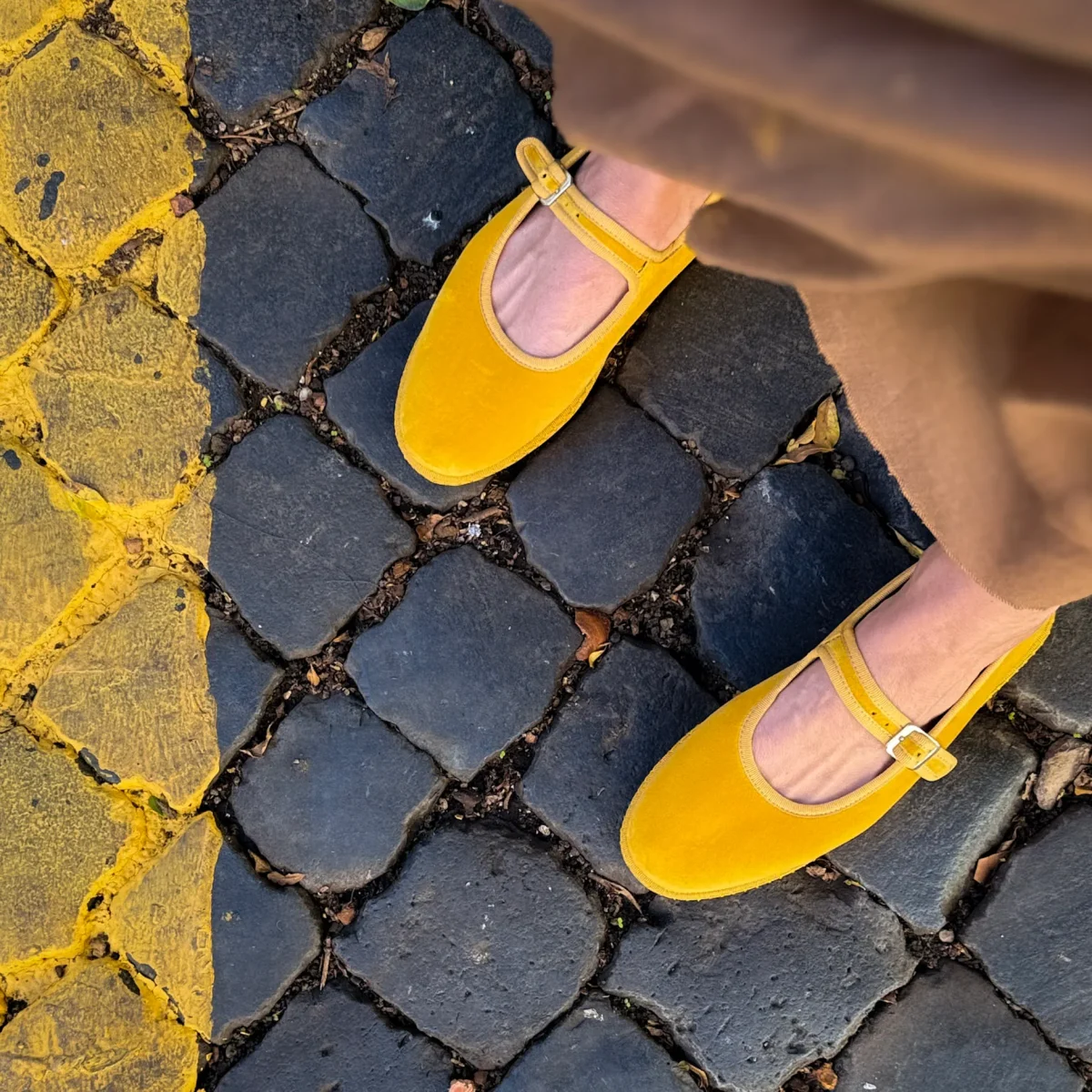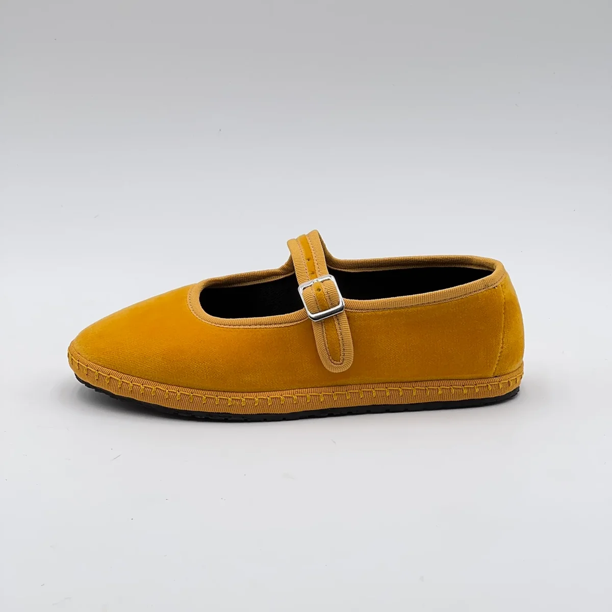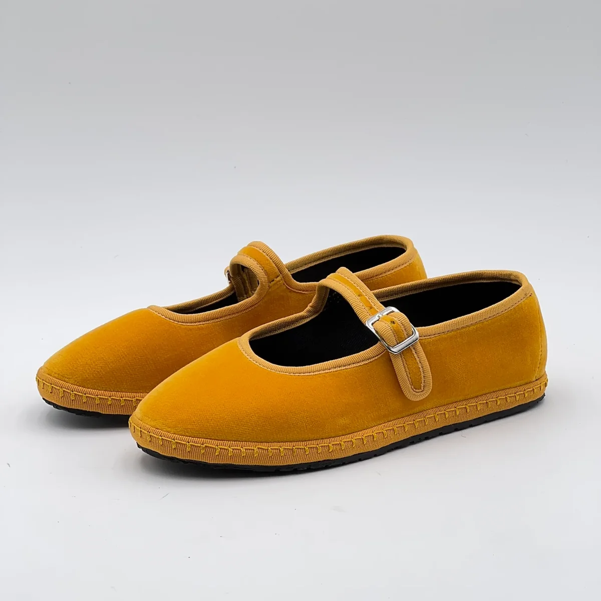 Friulana Mary Jane in velluto ocra, con interno in cotone nero e sottopiede in pelle. Chiusura con fibbia regolabile e suola in gomma cucita.Realizzata a mano secondo la tradizione friulana.