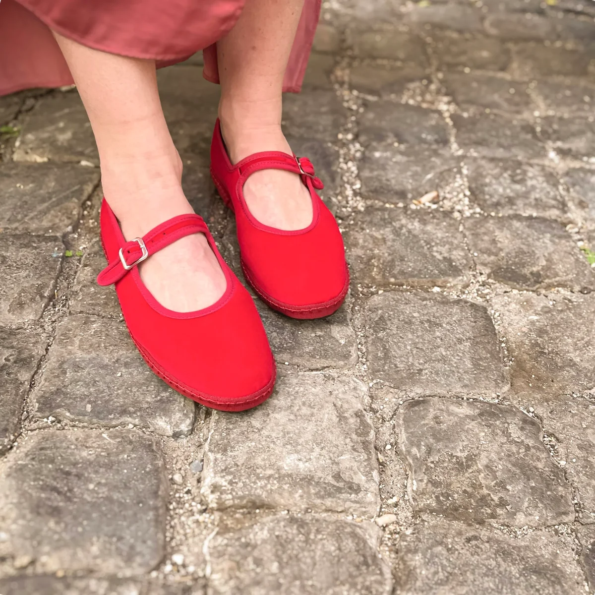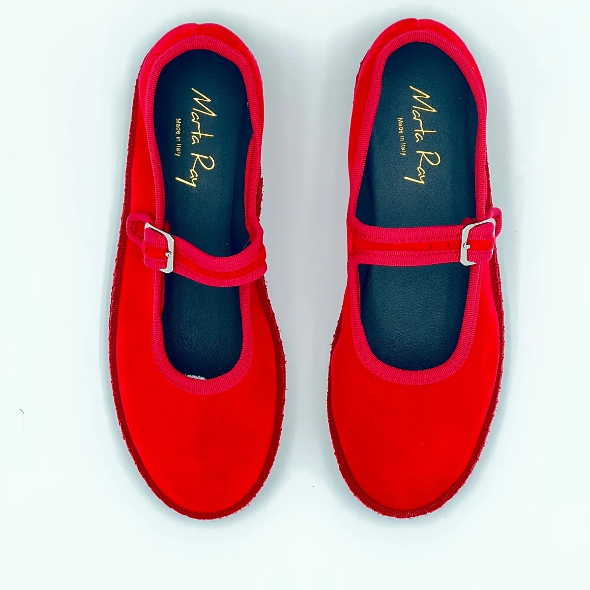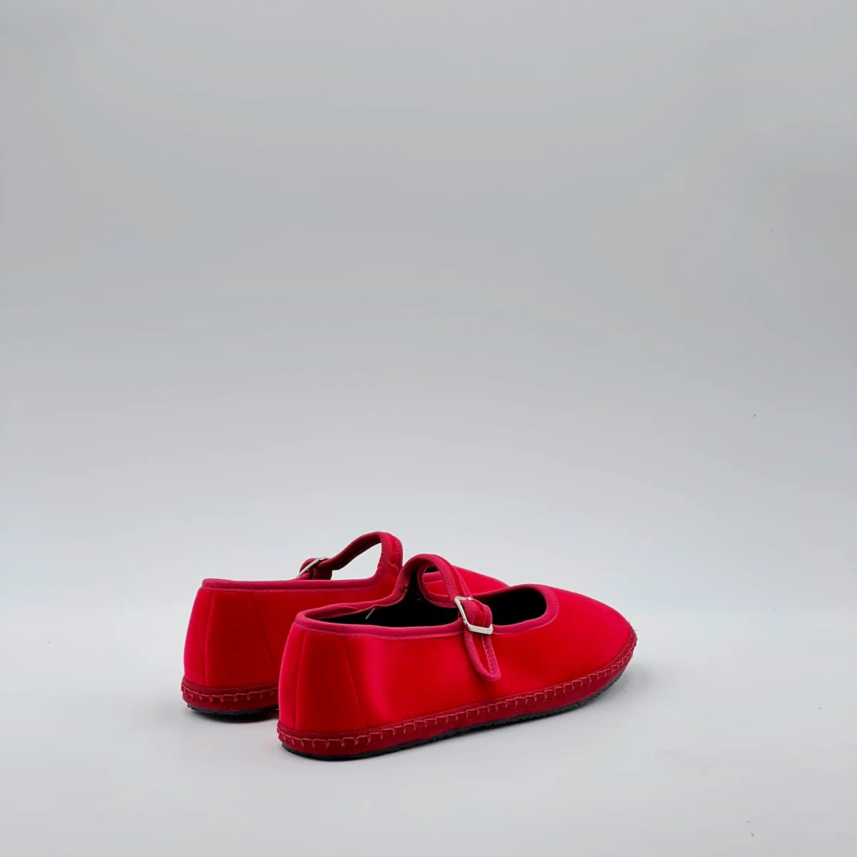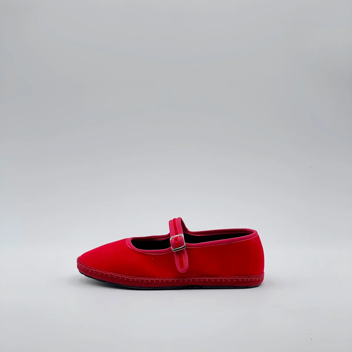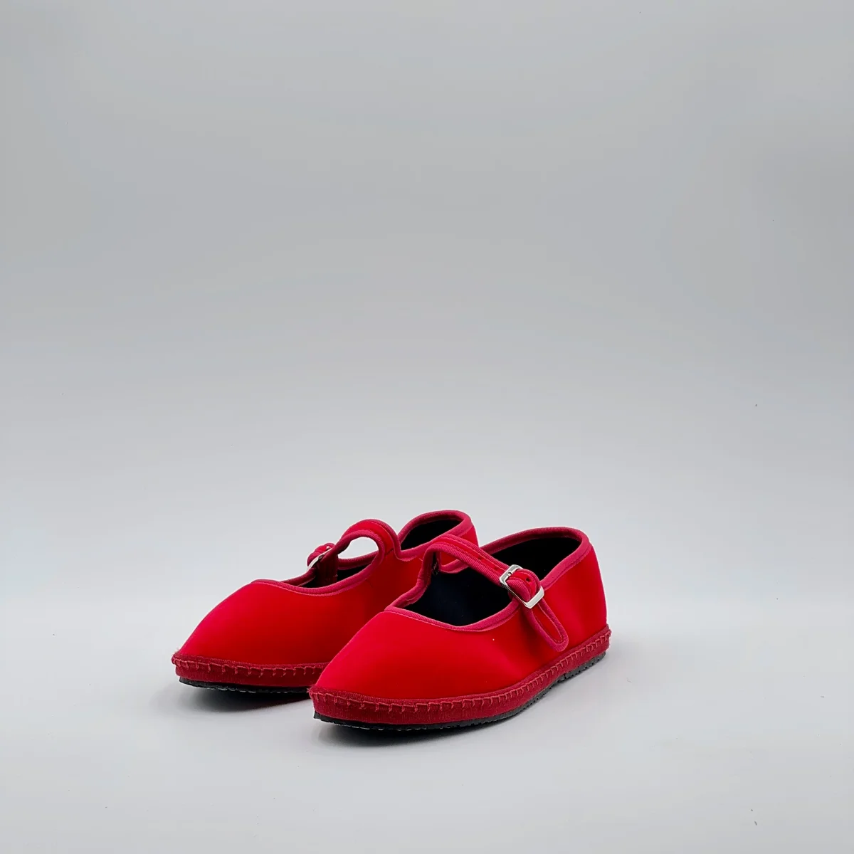 Friulana Mary Jane in velluto rosso fiamma, con interno in cotone nero e sottopiede in pelle. Suola in gomma cucita per un uso quotidiano comodo e resistente.Chiusura con fibbia regolabile. Realizzata a mano secondo la tradizione friulana.