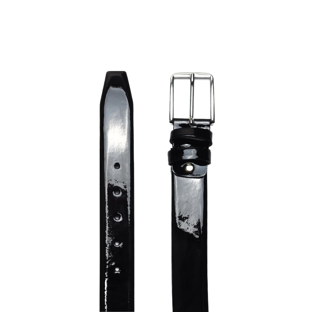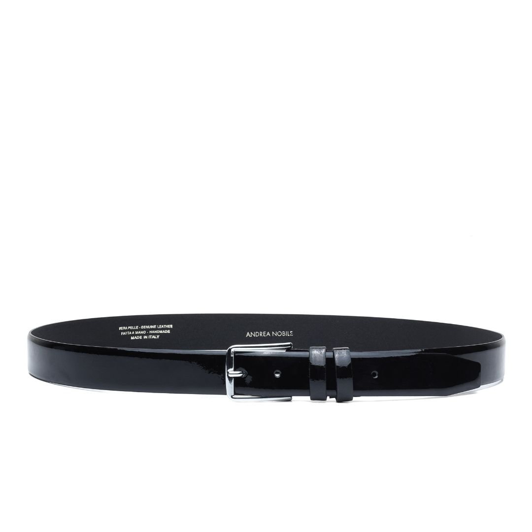 Cintura artigianale Made in Italy con fibbia in acciaio nel colore argento. Realizzata in pelle di vitello tinta nel colore nero, caratterizzata dalla pelle effetto vernice. Interno con logo stampato nel colore bianco Larghezza: 3.5 cm Questa cintura realizzata a mano unisce storia, eleganza, comfort e robustezza tipici dei prodotti Made in Italy con lo stile unico di Andrea Nobile.
