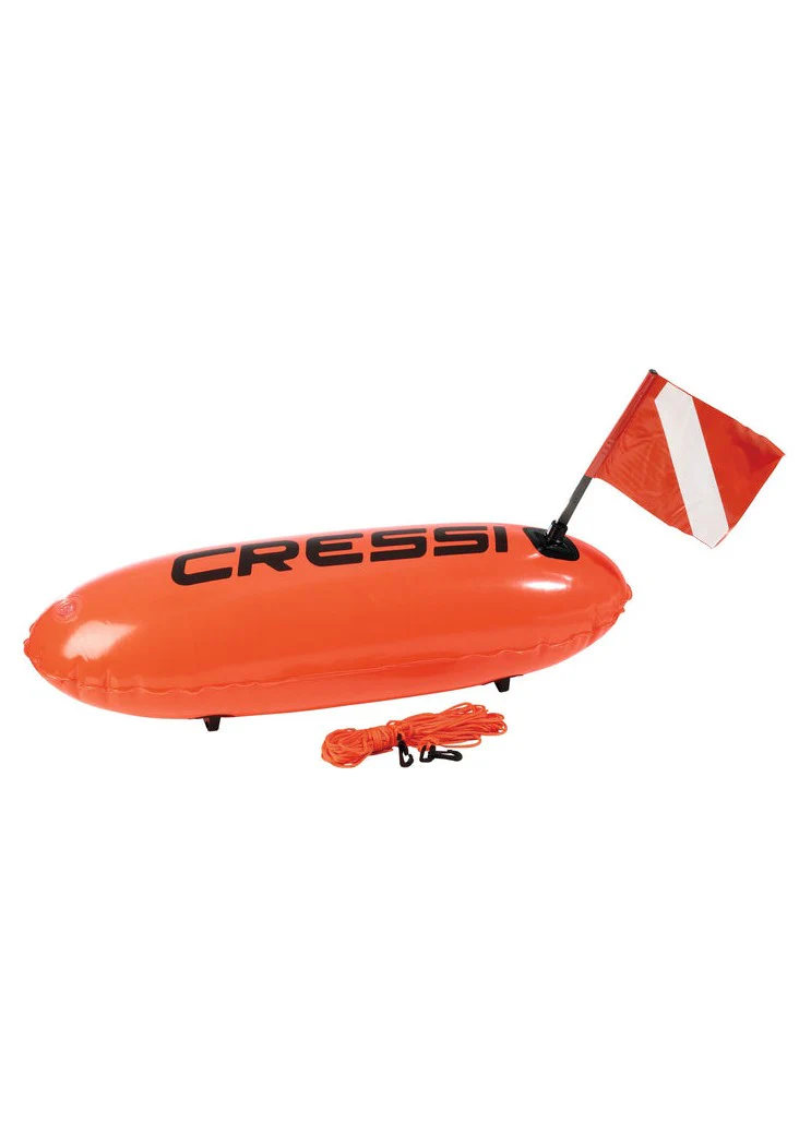 Realizzata in robusto pvc termosaldato, dispone di due camere d’aria indipendenti, una superiore e una inferiore. Quest’ultima può essere utilizzata anche che per l’inserimento di acqua di zavorra. A un’estremità della boa è applicato il doppio sistema di fissaggio dell’asta portabandiera (bandiera segna sub in dotazione), mentre all’estremità opposta, sul lato inferiore, vi è il punto di aggancio del sagolone (cavetto gallegiante di 15min dotazione).