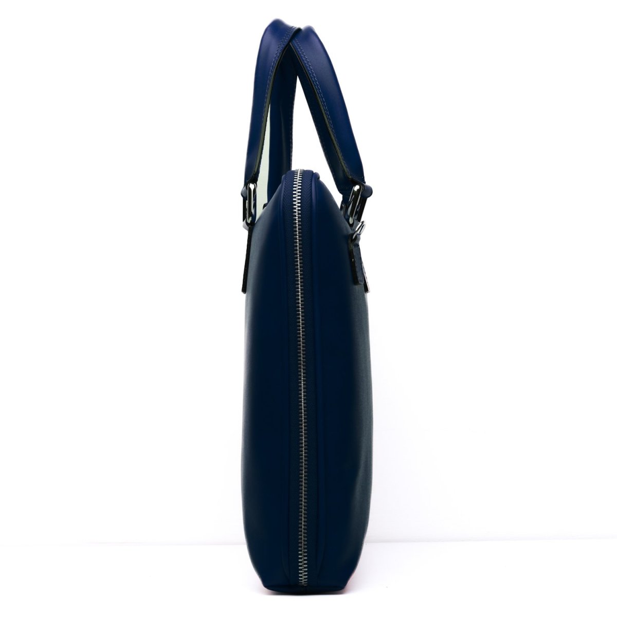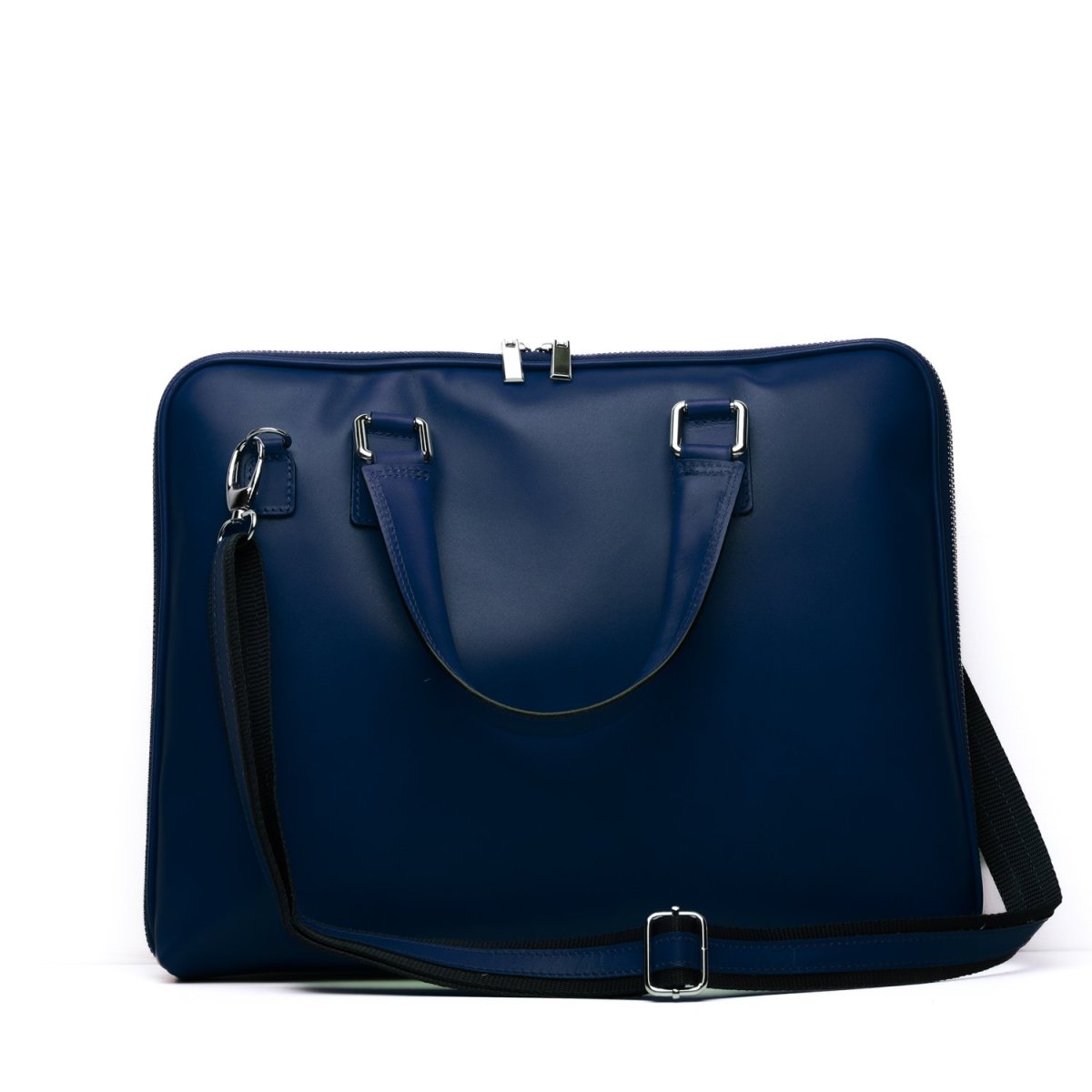 Borsa da lavoro Made in Italy realizzata in vera pelle crust tinta a mano nel colore blu, perfetta per chi cerca una sintesi tra artigianalità e funzionalità. La superficie liscia e naturale, leggermente sfumata, esalta il pregio della pelle conciata al vegetale, conferendo al pezzo un’eleganza discreta ma ricca di carattere. Il design è essenziale e contemporaneo: profilo sottile, doppio manico strutturato e tracolla removibile in tessuto tecnico con finiture in pelle. L’interno è pensato per contenere laptop fino a 15”, documenti e accessori personali, grazie a uno scomparto principale e tasche dedicate. Le zip in metallo cromato completano il…