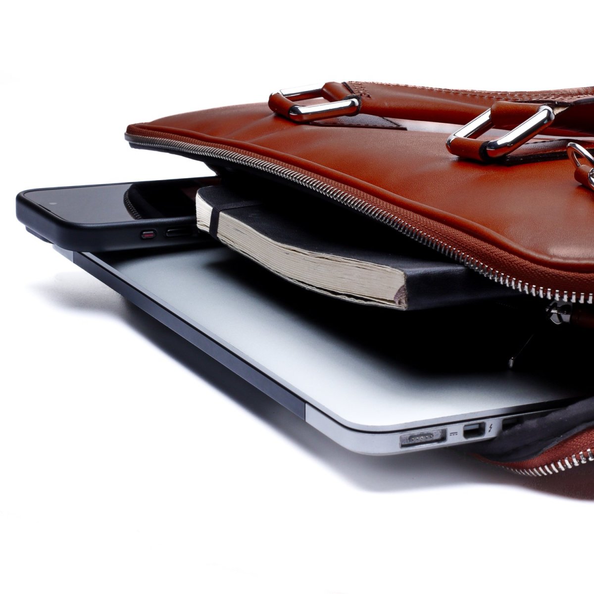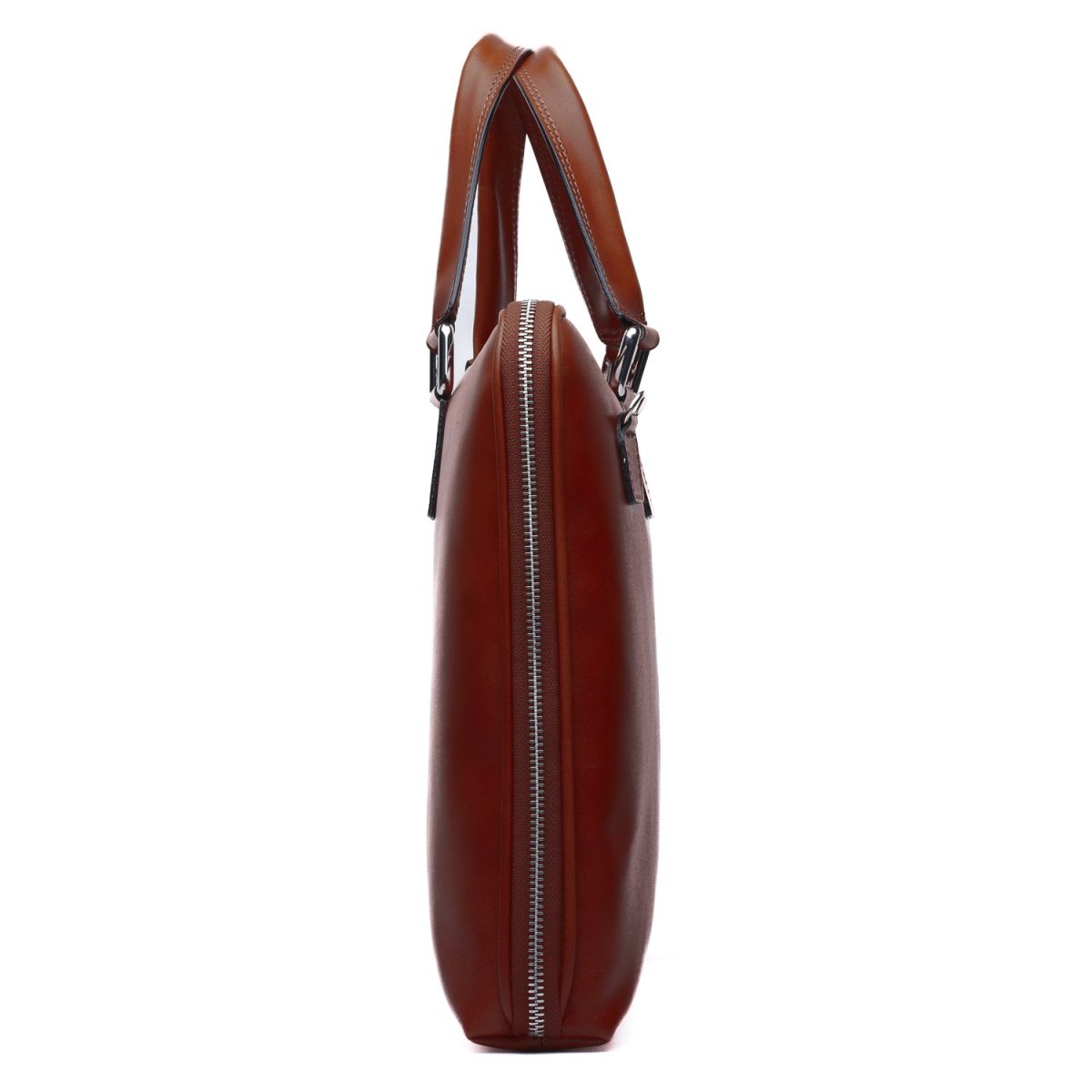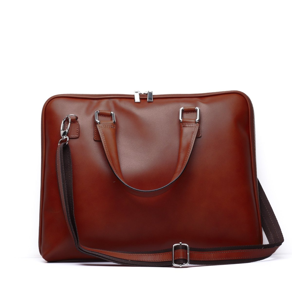 Borsa da lavoro Made in Italy realizzata in vera pelle crust tinta a mano nel caldo colore brandy, perfetta per chi cerca una sintesi tra artigianalità e funzionalità. La superficie liscia e naturale, leggermente sfumata, esalta il pregio della pelle conciata al vegetale, conferendo al pezzo un’eleganza discreta ma ricca di carattere.