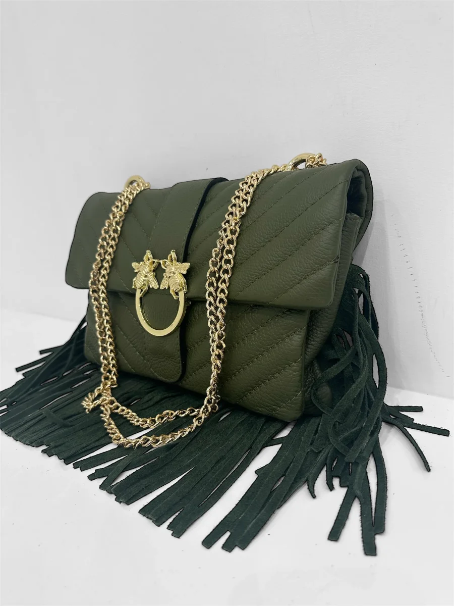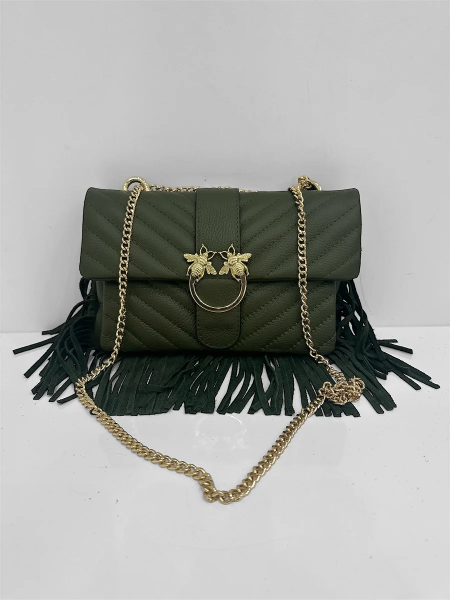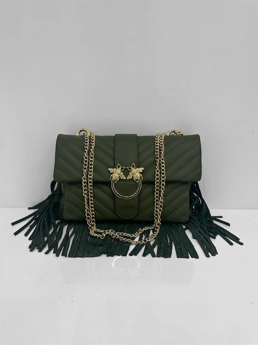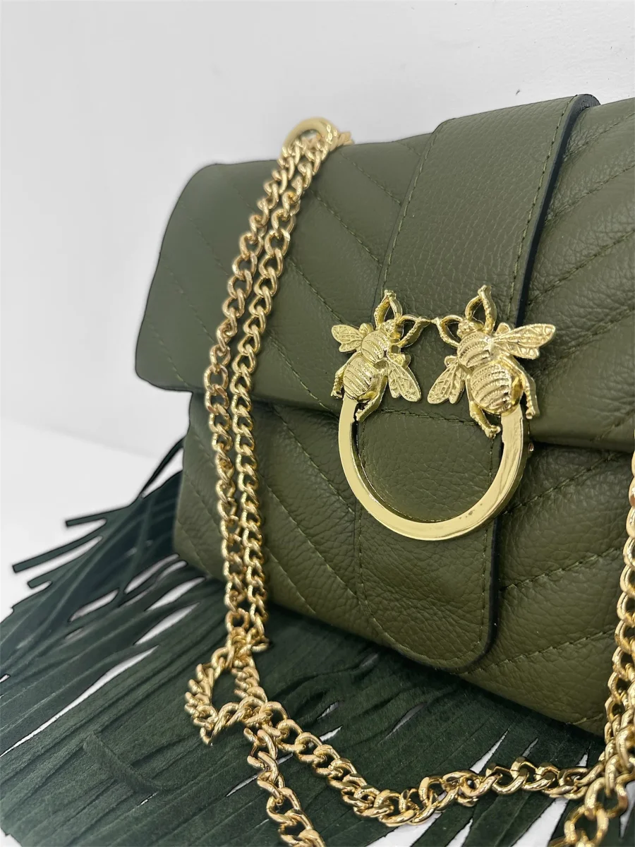 Una borsa dal carattere sofisticato e ricercato, impreziosita da un accessorio gioiello sulla chiusura raffigurante due api, simbolo di energia e raffinatezza. Gli inserti e la catena in finitura platino donano luce e modernità al design, mentre le cuciture a motivo imbottito creano un effetto tridimensionale morbido e avvolgente. Lungo il profilo inferiore, una frangia decorativa aggiunge movimento e un tocco inaspettato, fondendo eleganza e personalità in un unico accessorio di stile.