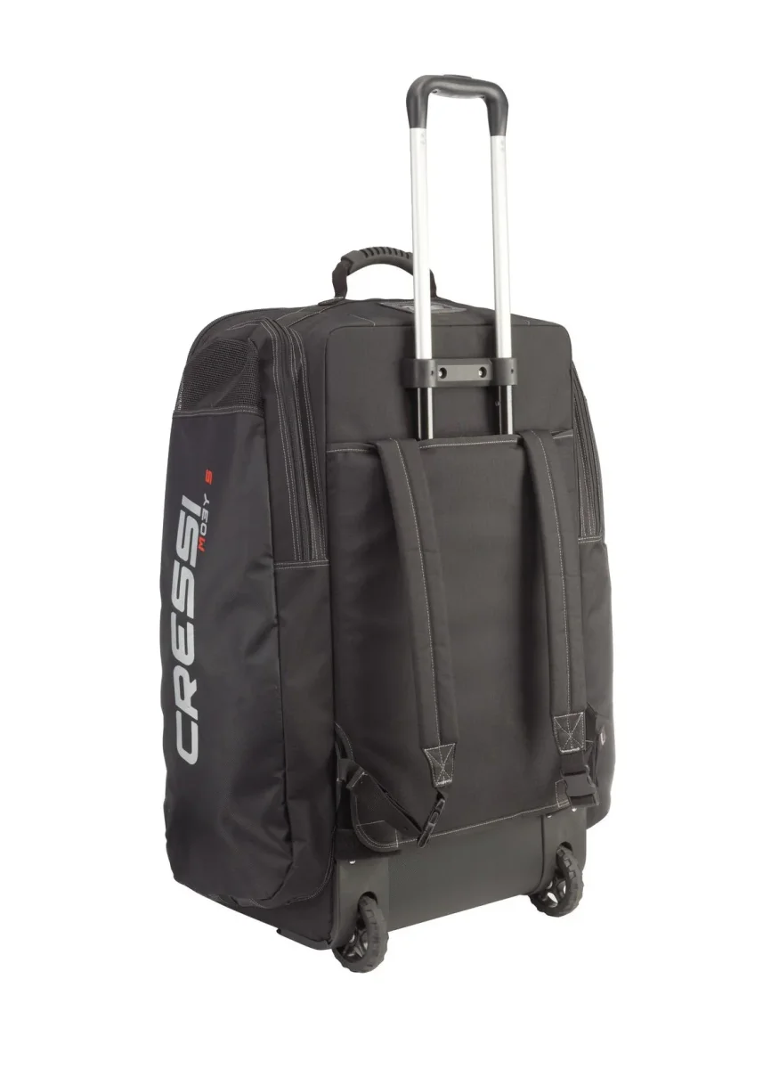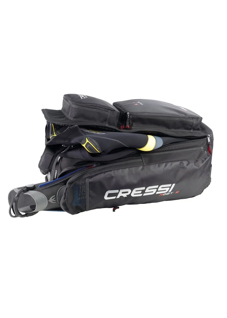 È realizzato in un nuovo tessuto 300/400 denari, leggero ma resistente. Il vano principale si apre su tre lati, per un accesso ottimale. Vi sono due grandi tasche frontali a soffietto, con chiusura a cerniera, due tasche laterali porta pinne, una taschina superiore porta indirizzo.