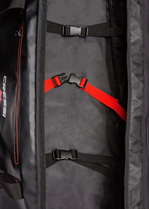 La capacità è di 120 litri. È provvista di una grande tasca interna a retina con zip e di una piccola tasca esterna con zip. Tre cinghioli interni sono fissati al fondo della struttura per bloccare l’attrezzatura. All’estremità superiore si trova un maniglione per il traino e un altro maniglione è all’estremità inferiore. Al centro della borsa altre due maniglie sono unibili con strap imbottito antigraffio.