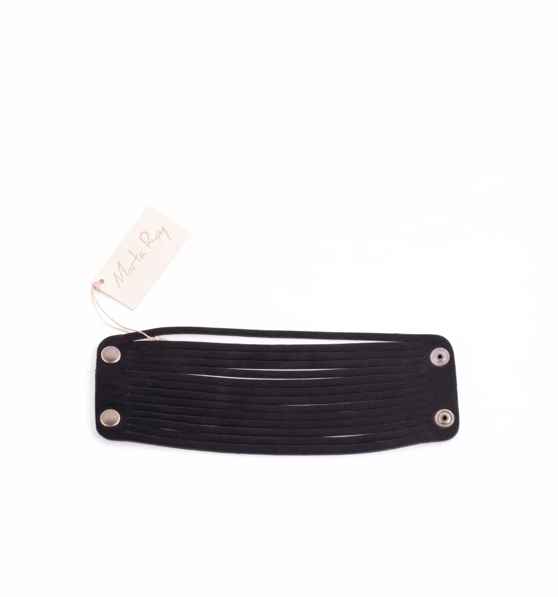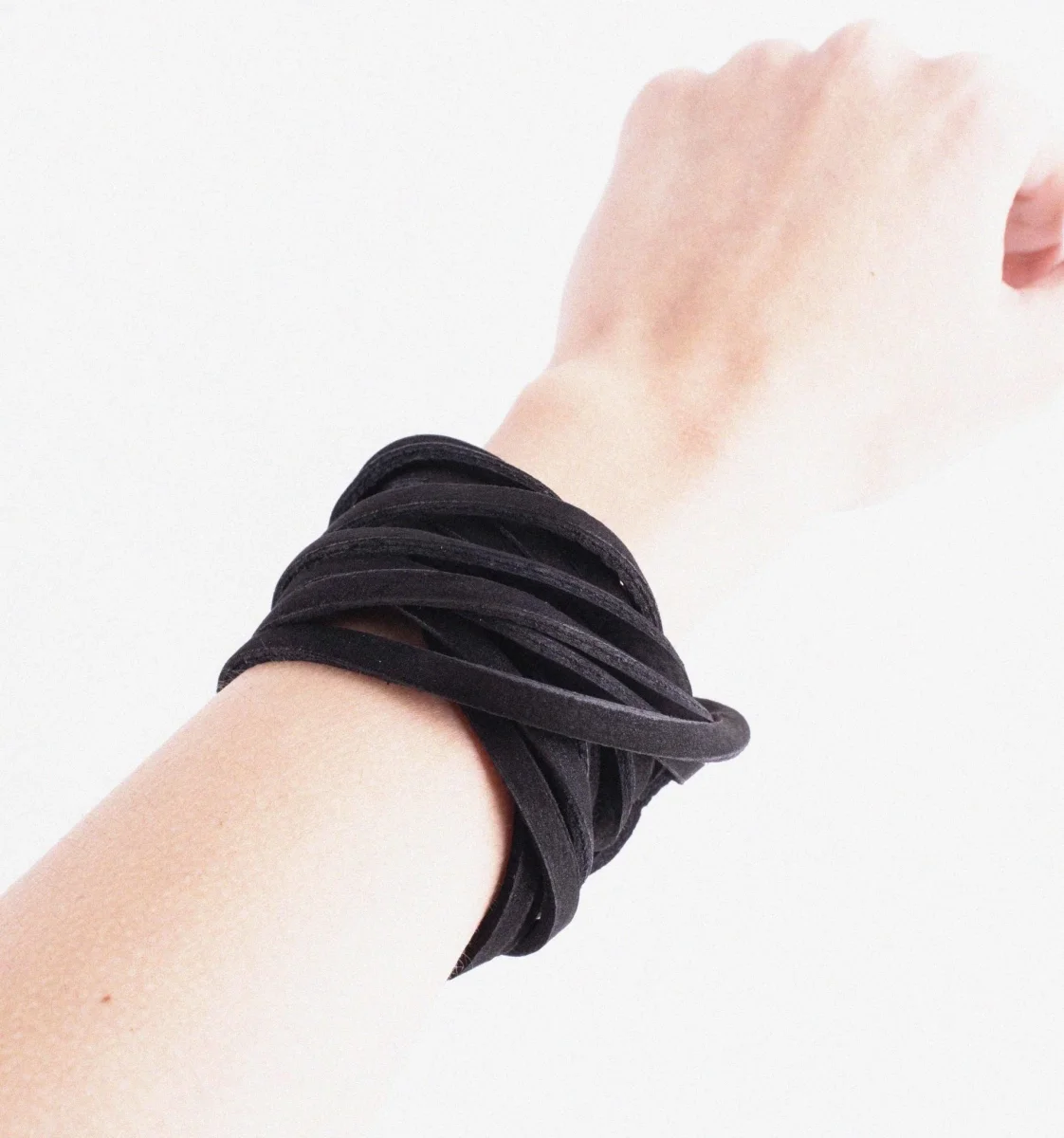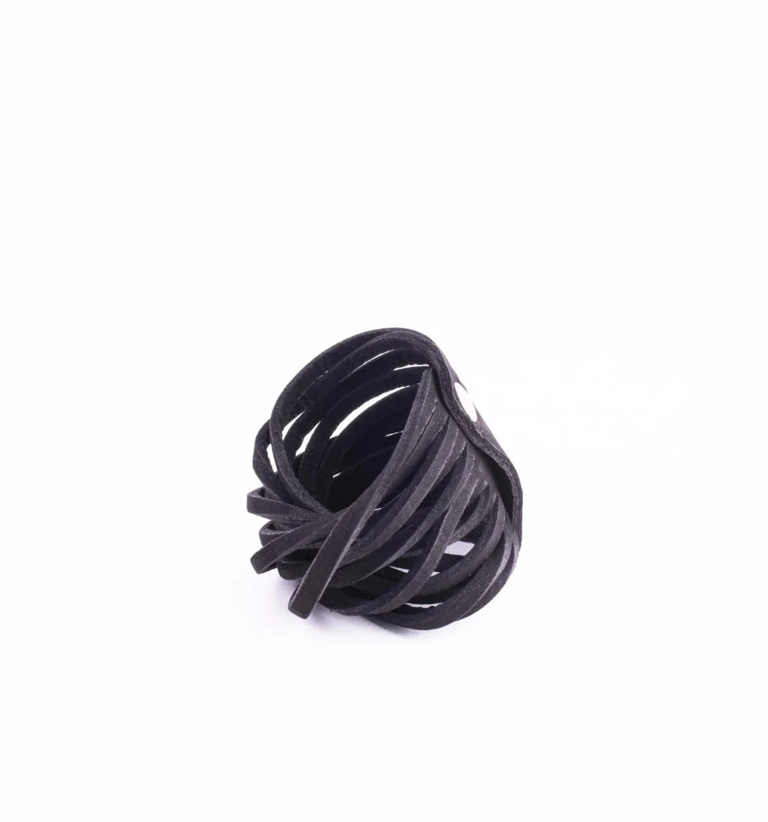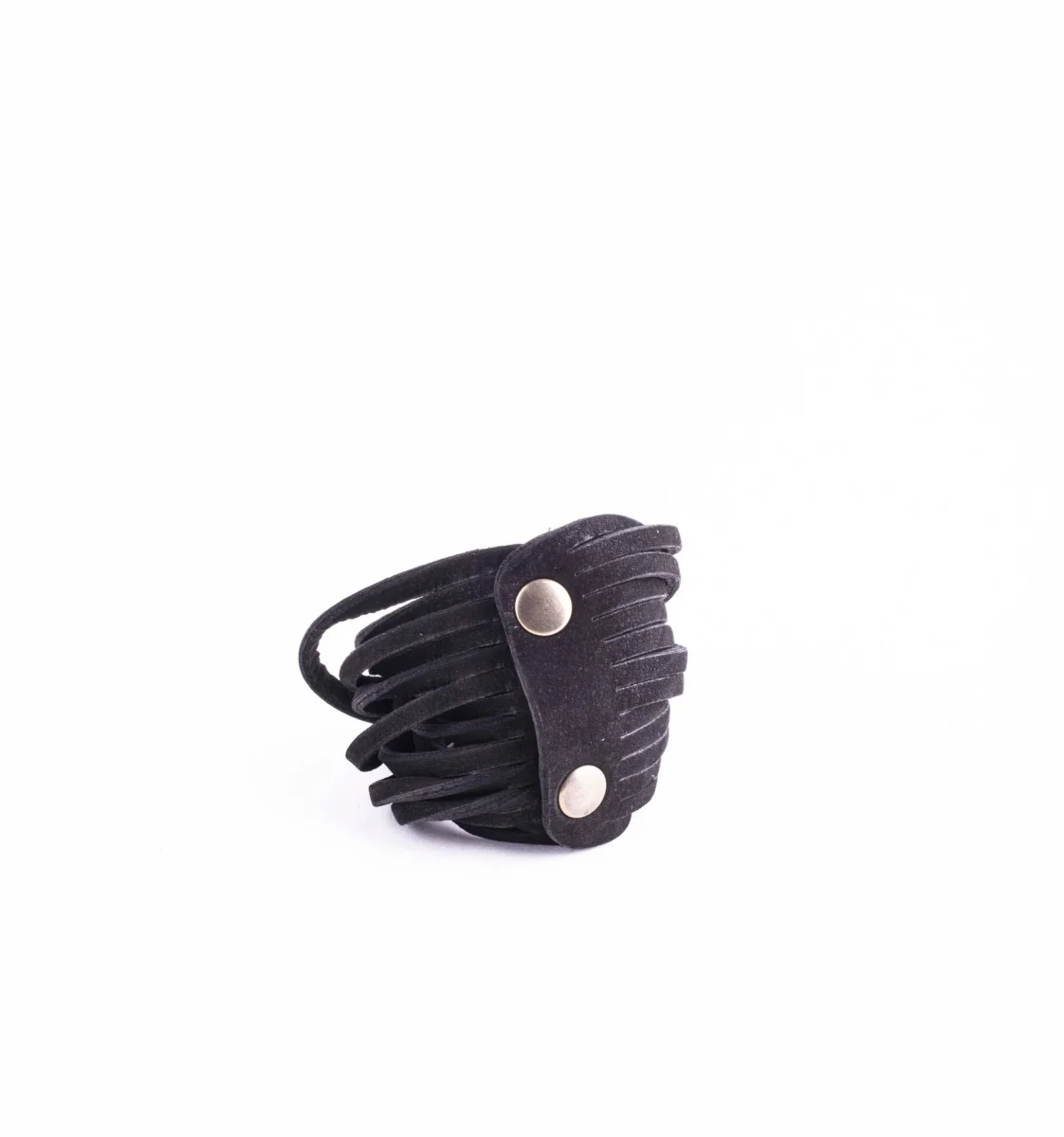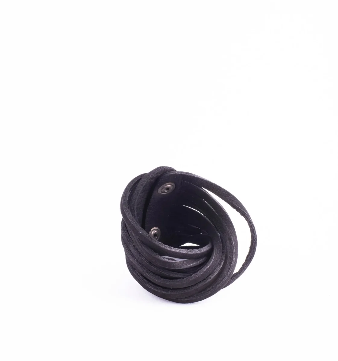 Bracciale in pelle fili long beach nero. Questo bracciale si costruisce come un torchon e grazie ai listini di cui è composto avvolge con grazia il polso. Questo accessorio cambia con il tempo acquistando il fascino del vissuto. Chiusura con bottoni automatici.