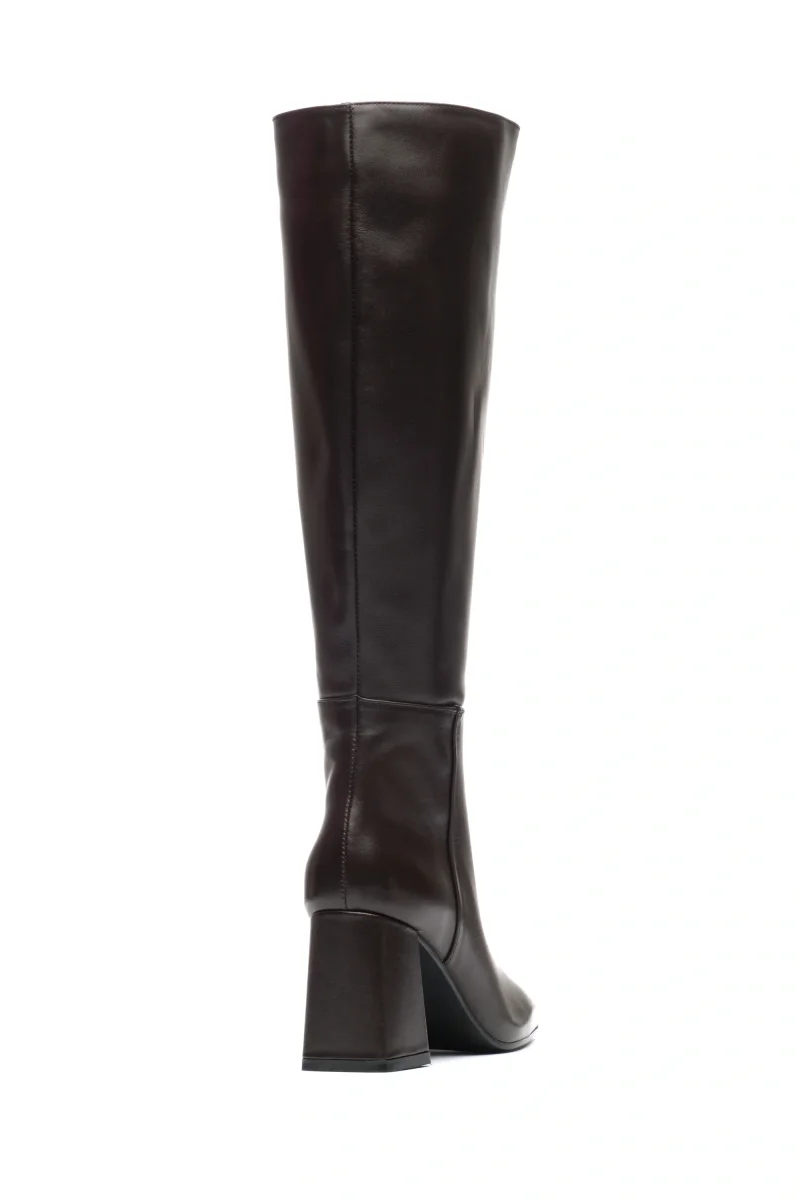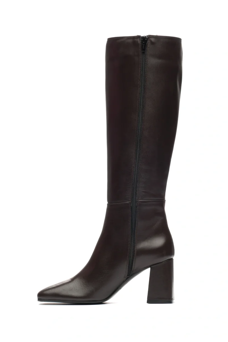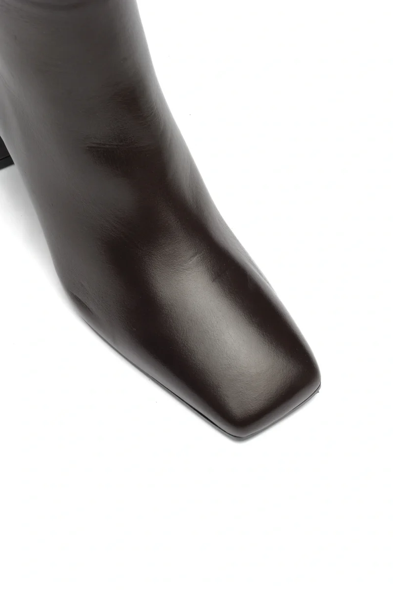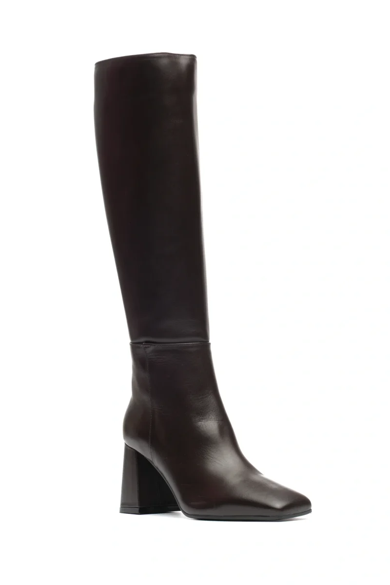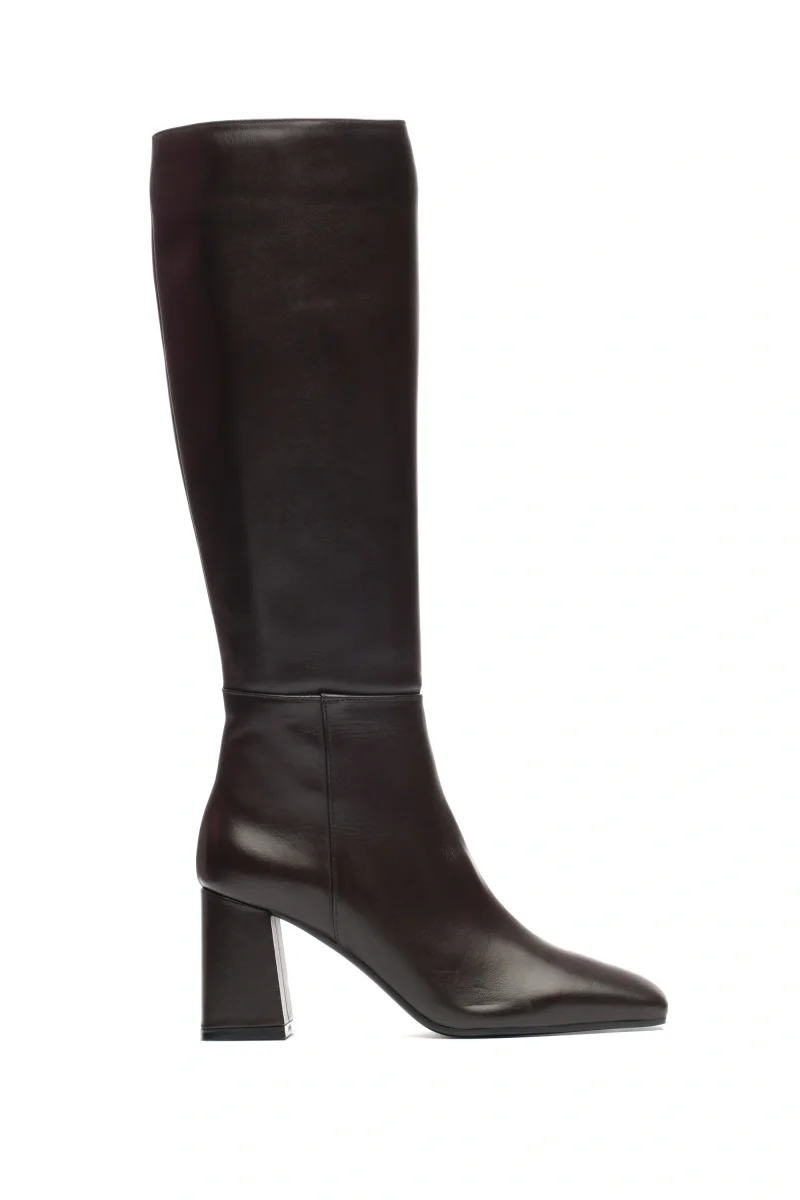 Linee decise e design contemporaneo questo stivale sotto al ginocchio dalla personalità forte e raffinata. La punta marcatamente squadrata e il tacco largo geometrico da 70mm creano un contrasto moderno che dona carattere alla calzatura, perfetta per chi ama osare con eleganza. Realizzato in pelle pregiata (o altro materiale, specificabile), presenta una zip interna a tutta lunghezza che garantisce una calzata comoda e funzionale, valorizzando al contempo la silhouette della gamba.