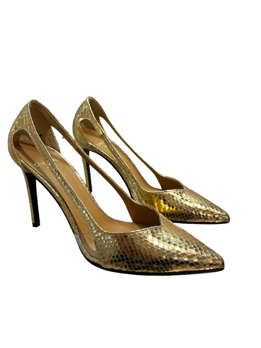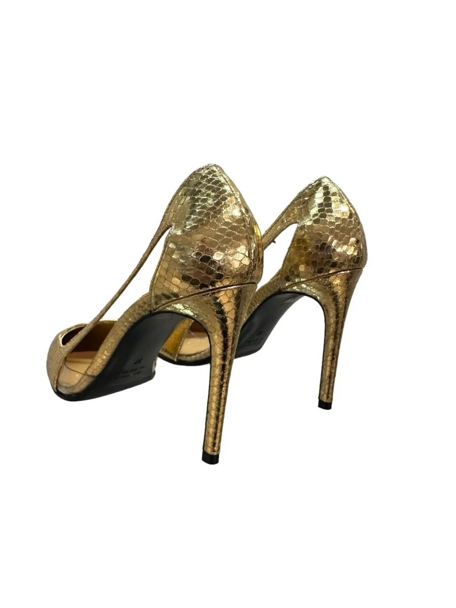Decolleté laminato pitonato oro con apertura laterale, fondo cuoio antiscivolo, altezza taco 10cm