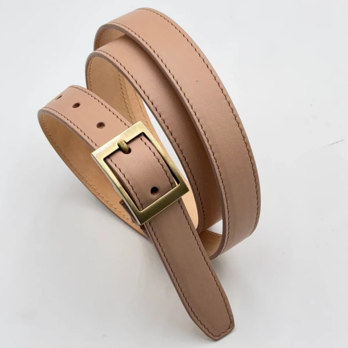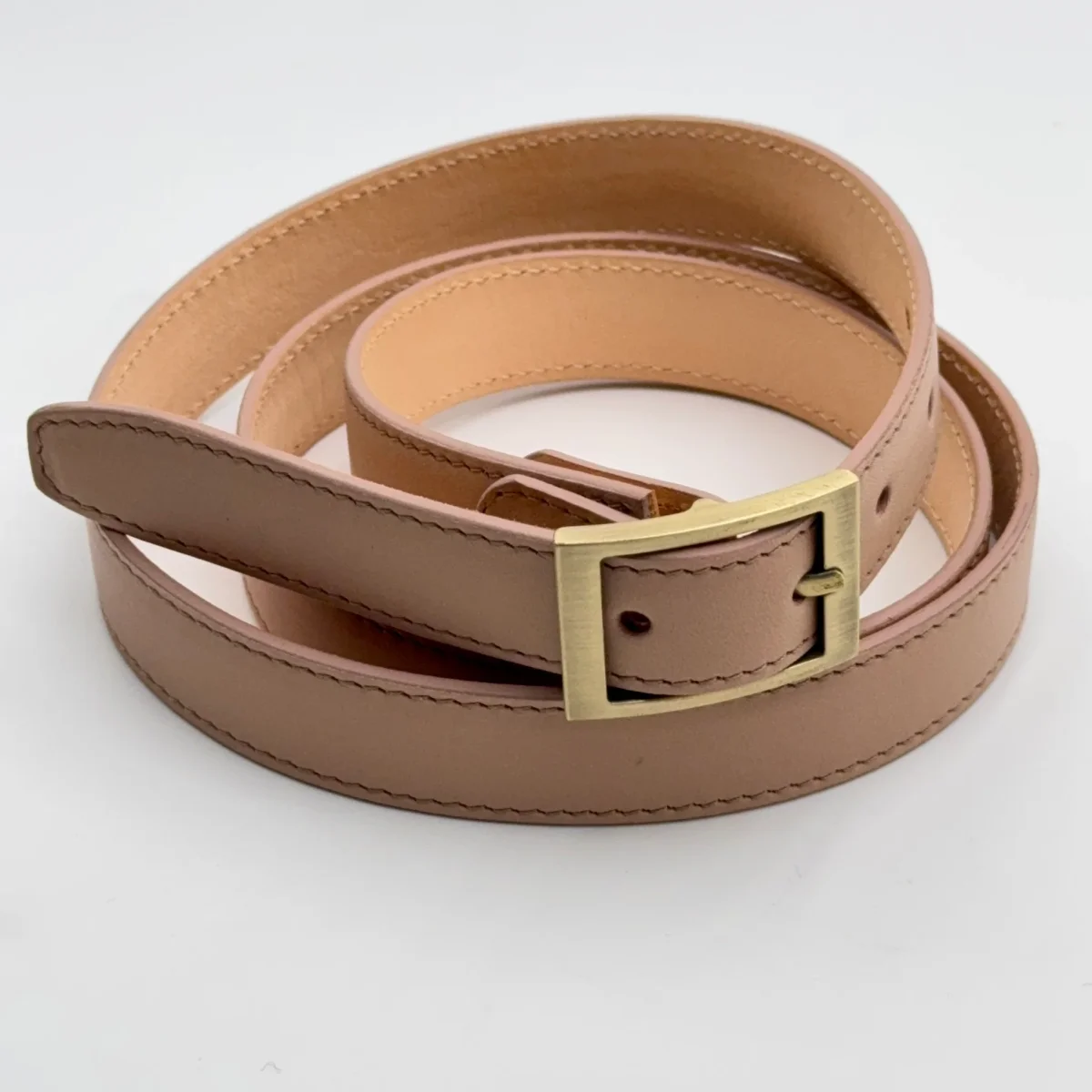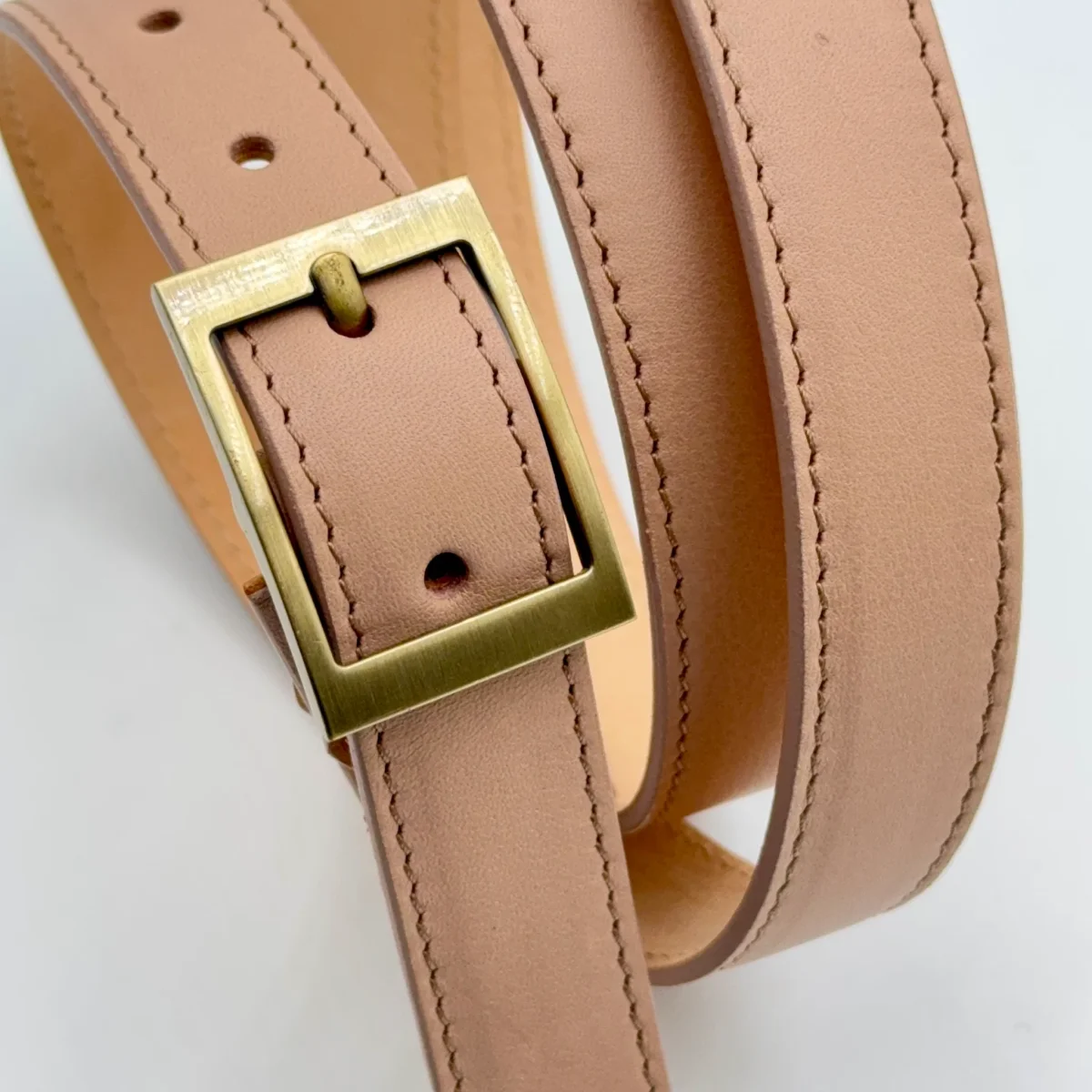 Cintura foderata in cuoio, color nudo, con il bordo tinto. Altezza circa 2,5 cm. Fibbia rettangolare in ottone spazzolato.