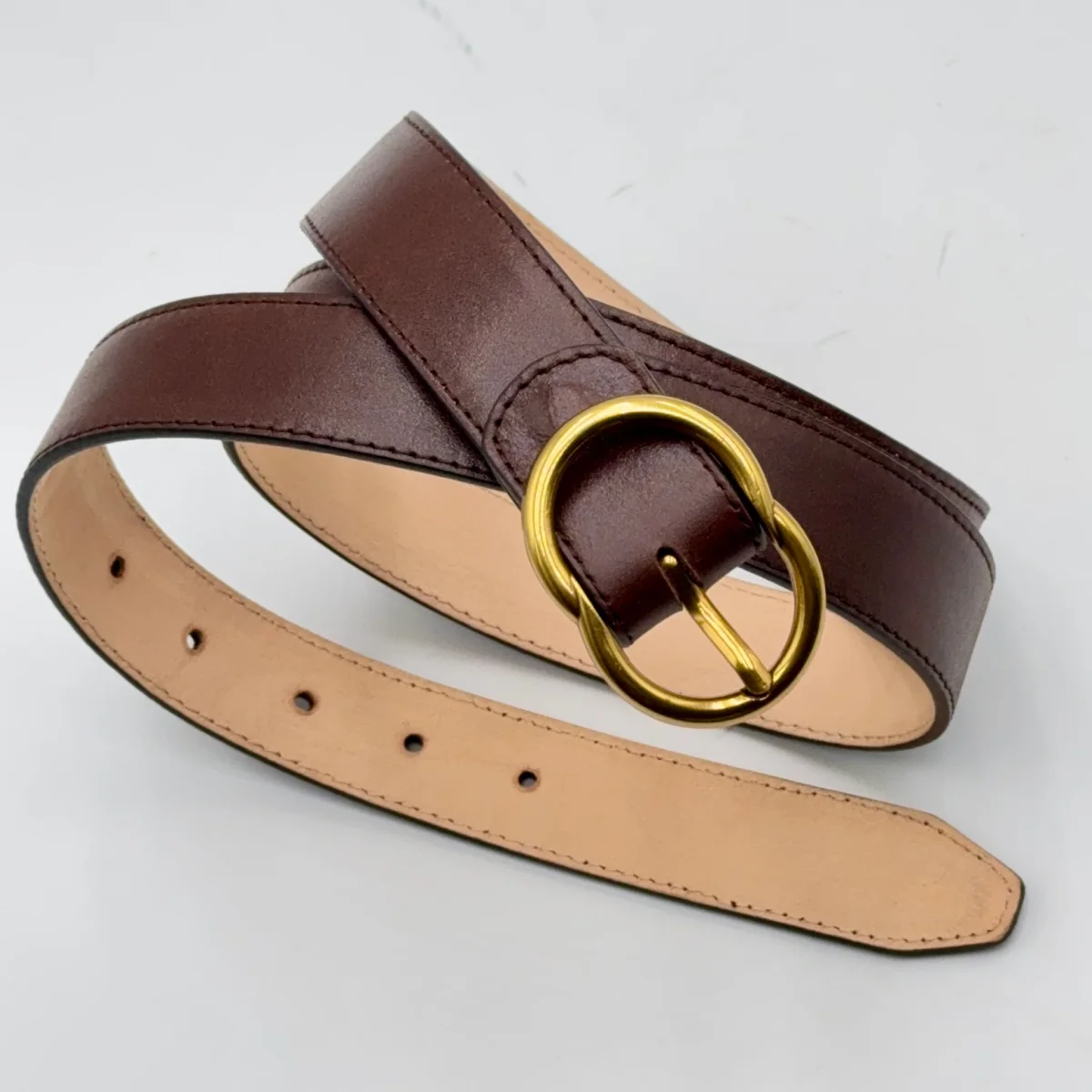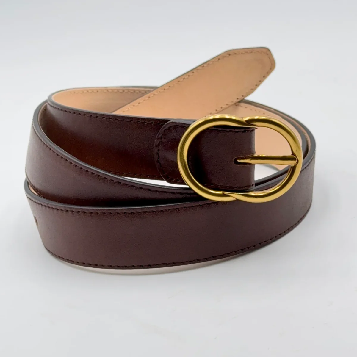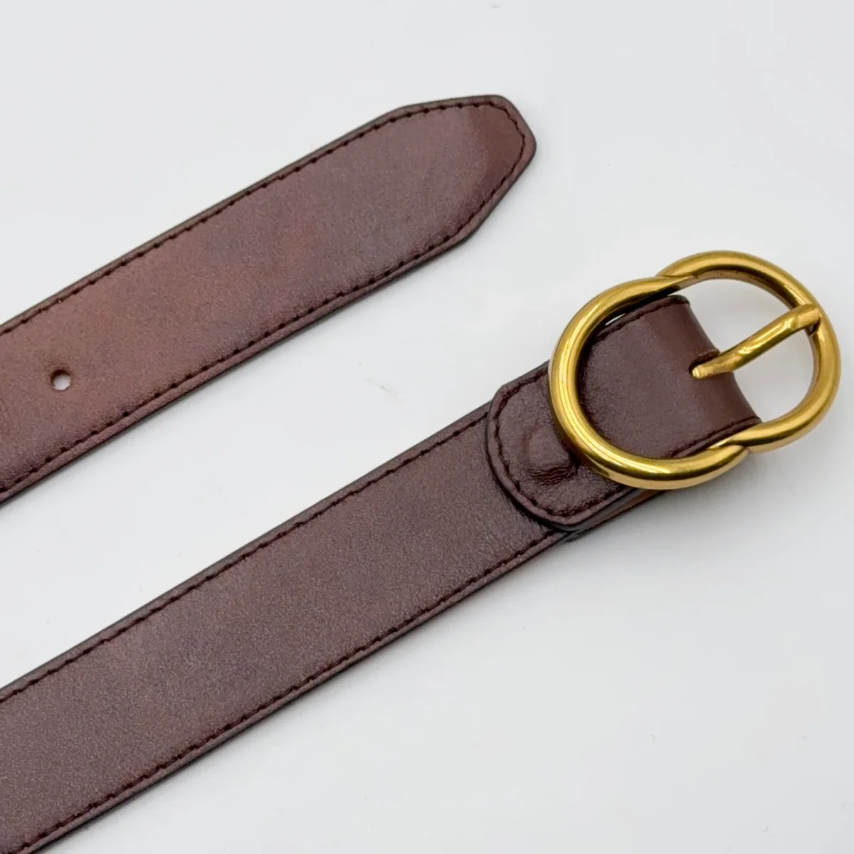 Cintura foderata in cuoio, color marrone, con il bordo tinto. Altezza circa 3 cm. Fibbia ottone spazzolato.